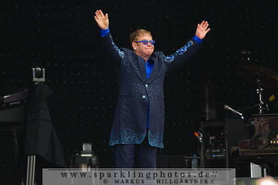 Auf die Minute pünktlich um 19:00 Uhr war es soweit und der Mann des Abends betrat die große Bühne zusammen mit seiner fünf Mann starken Band. Wer vor Jahrzehnten mal auf einem Elton John Konzert war mag sich an aufwendige Bühnenshows mit aufwendiger Lichttechnik erinnern. An diesem Abend konzentrierte sich alles auf das wesentliche: Die Musik. Die Bühne war zwar groß, aber schlicht schwarz ohne große Besonderheiten wie Bühnendekorationen. Einzig die LED Leinwand im Hintergrund ließ auf optische Effekte hoffen, doch sie fand nur äußerst dezent Verwendung. Elton Johns Flügel war auch schwarz und nur Elton John selber brachte mit seinem schwarz-blauen Glitzeranzug und seiner blauen Sonnenbrille ein wenig Farbe in die Schwärze. Gemessen an anderen Outfits des Briten kann hier aber vermutlich trotz des Glitzers von dezent gesprochen werden.
