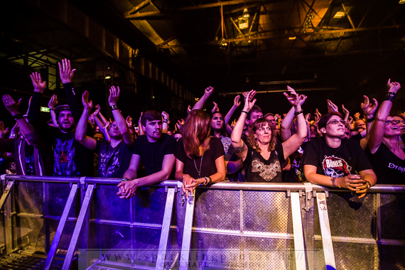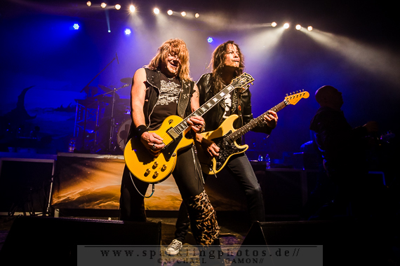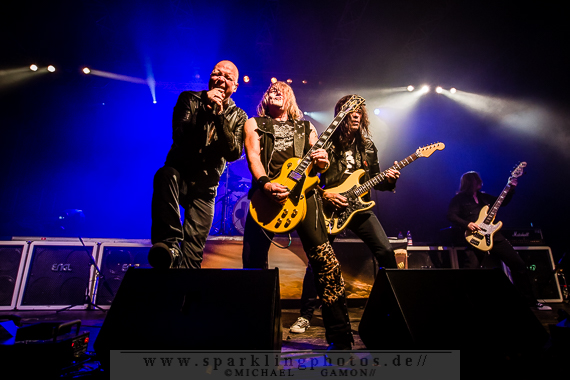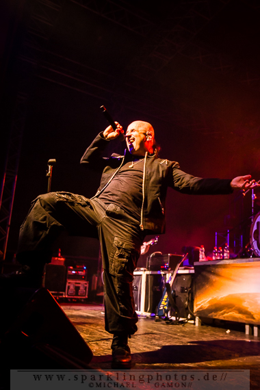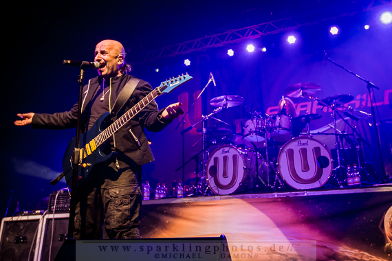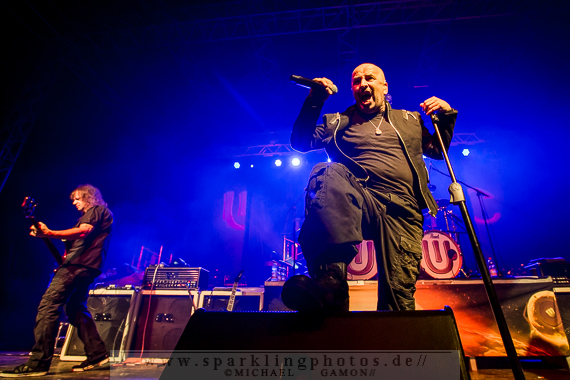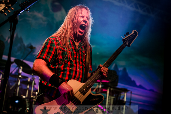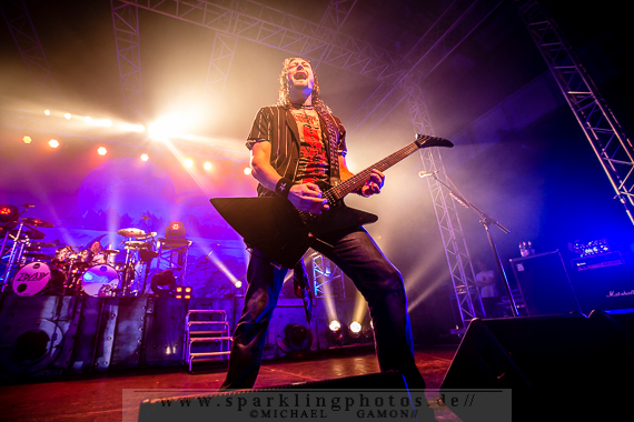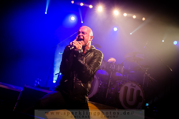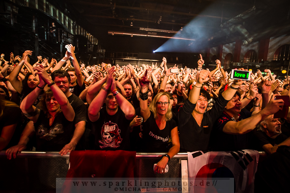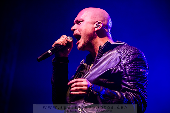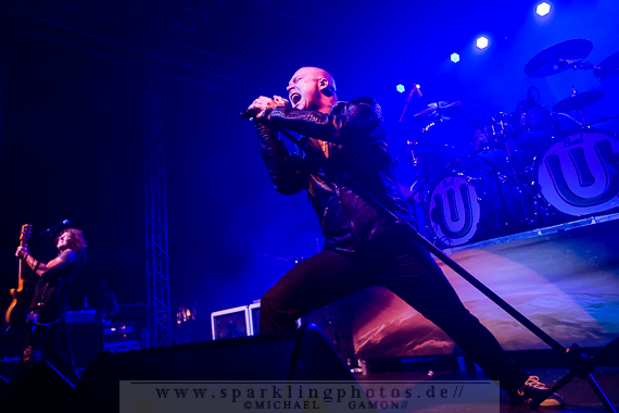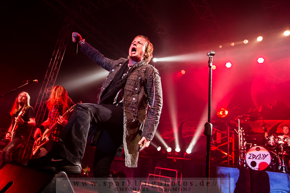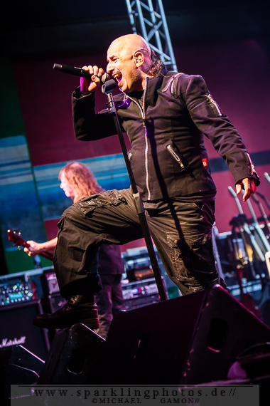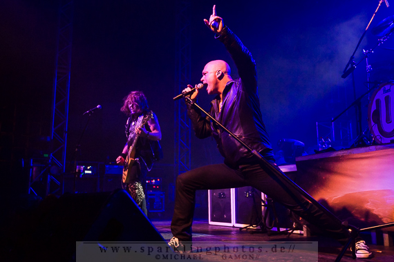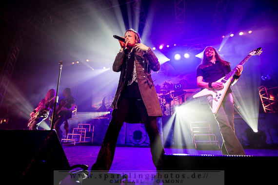 Während der kurzen Umbaupause wird erst so richtig deutlich, wie durchmischt das Publikum am heutigen Abend eigentlich ist. Vom Langhaar-Metaler, über den junggebliebenen Mitfünfziger in mit Patches-bestickter Jeansweste bis hin zum Durchschnittskonzertbesucher, der optisch nicht weiter auffällig wird, ist alles vertreten. Trotz des unterschiedlichen optischen Erscheinungsbildes eint uns doch in diesem Moment die Spannung auf das, was da heute Abend noch alles kommen mag. Die Bühne wird stockfinster, durch den düsteren Nebel brechen weiße Strahler und schwirren suchend durch den Raum. Dann Szenenwechsel- und schon befinden wir uns mittendrin in einer bergigen verlassenen Landschaft, die vom übergroßen Mond überblick wird, und sind somit mitten in der Show von Unisonic. Dieses Bühnenbild nutzen im Übrigen auch Edguy als Headliner – scheinbar ist man in derselben Galaxie unterwegs. Die Stimmung, die Michael Kiske und seinen begnadeten Herren von der Bühne schicken, steckt uns alle an. Spaß an dem, was wir hier tun, ob wir nun Instrumente in der Hand halten, am Mikrophon stehen oder aus der Menge mitgröhlen. Stücke wie For The Kingdom, Star Rider, bei dem Kiske durch den Fotograben zur Menge rennt und sich mit den Fans abklatscht, oder King For A Day kommen hier und heute mehr als nur gut an. Getoppt wird dieser Höhenflug nur noch durch den Helloween-Kracher I Want Out, bei dem keine Kehle mehr ruhig bleibt, was wirklich unter die Haut geht. Eine Wahnsinnsshow und somit eine riesen Aufgabe für Edguy, das alles noch zu toppen!