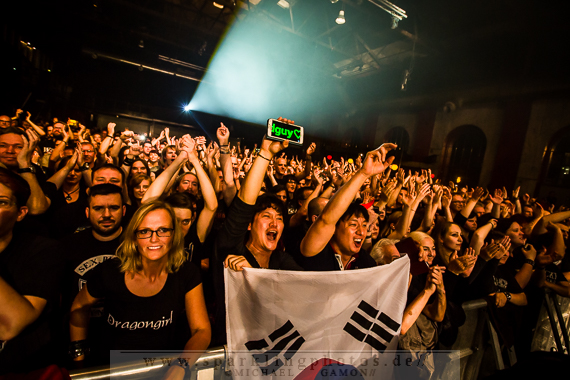 Nach einem weiteren Päuschen füllt sich die Szene erneut mit Dunkelheit, bis weiße Lichter und ein tiefes Grollen uns vollends gefangen nehmen. Sirenengeheul und sich drehende Rot-Blau-Lichter erfüllen die mit Spannung randvolle Turbinenhalle und deuten an, dass uns soeben die Edguy Space Police aufgespürt hat. Wir wehren uns nicht, lassen uns fallen und werden aufgefangen von einer lebhaften, warmen Stimmung, die zweifelsohne an die magischen Momente mit Unisonic anknüpfen kann. Vom ersten Ton an sind die treuen Fans bei Stücken wie Love Tyger, dem Titelsong Defenders of the Crown oder dem großartigen Tears of a Mandrake voll und ganz dabei und spielen die Spielchen, die sich Aushängeschild Tobias Sammet für uns ausgedacht hat, mit Freuden mit. Klatschen, Gröhlen, Singen, Jubeln – und alles auf Anfang! Langweilig wird es mit den energiegeladenen Herren heute keinesfalls, nur wer nicht auf Redeintermezzi steht, der wird heute das ein oder andere mal mit den Augen rollen, denn Sammet zeigt sich nicht nur redegewandt, sondern auch äußerst redebedürftig und lässt hier und da Witze und Scherze vom Stapel, die die meisten auch verstehen. Puh, gerade nochmal Glück gehabt! Musikalisch liefern die Hessen auf jeden Fall vom Allerfeinsten ab und lassen sich sogar für ein paar weitere Stücke zurück auf die Bühne locken. Was für ein Abend, was für eine Show!