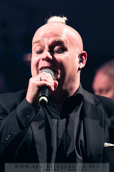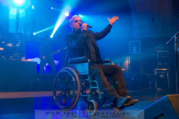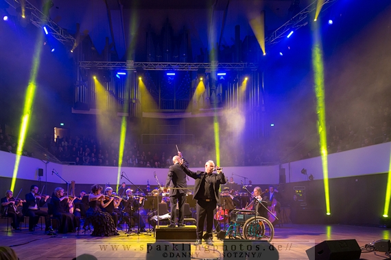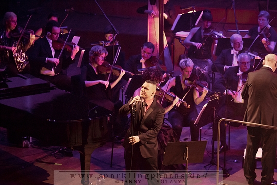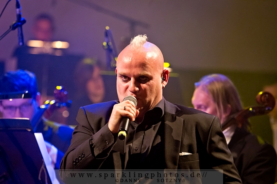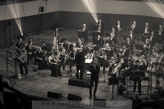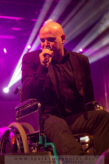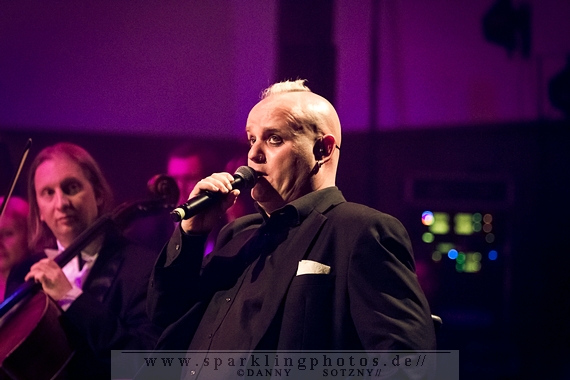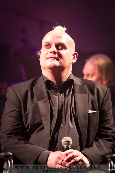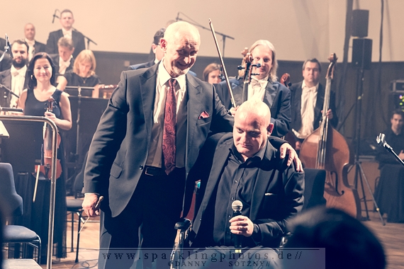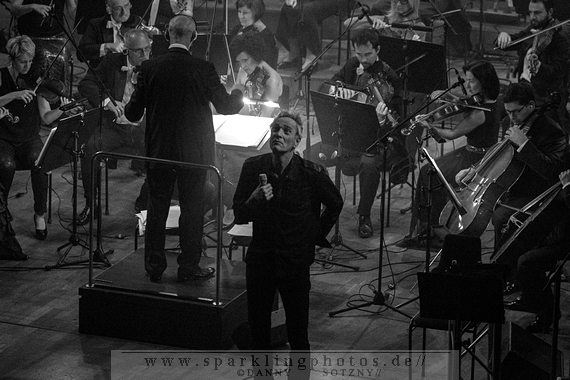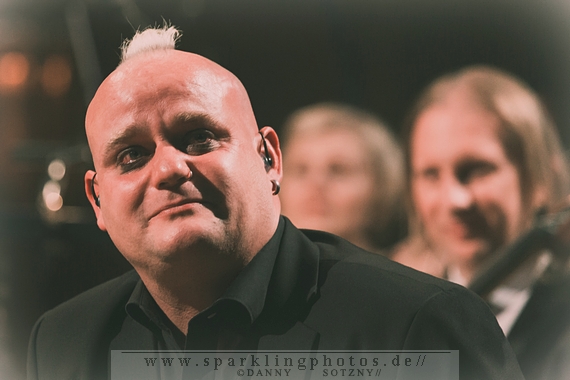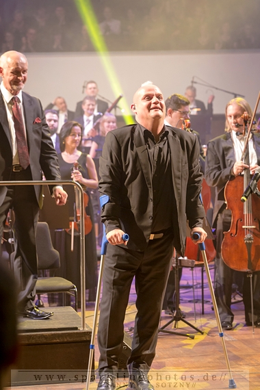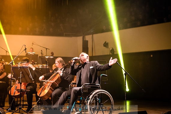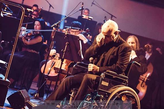 weshalb er hier im Rollstuhl auf der Bühne steht und meinte spaßig zu seinen Fans: „Wofür braucht man ein Kreuzband, wenn man euch hat?“. Die Fans ließen keine Sekunde vergehen und jubelten und applaudierten ihm zu. Einen Gänsehautaugenblick gab es bei dem Song Nimmermehr, bei dem er seine ganze Kraft brauchte ? wie er im Vorfeld schon ankündigte. Dieser Song trieb nicht nur einigen im Publikum die Tränen in die Augen, sogar Martin Engler kämpfte mit den Tränen. Danach gab es in den Reihen kein Halten mehr – Standing Ovation für den Künstler. Ein sehr emotionaler Auftritt, man spürte wie ergriffen der Sänger von dem Zuspruch seiner Fans war. Nach dem letzten Song Voices of Doom und minutenlangem frenetischem Beifall sowie Standing Ovation holte Martin Engler noch seine Bandkollegen, Solitary Experiments und Veranstalter Steven Dornbusch auf die Bühne, um sich von jedem persönlich zu bedanken. Er dankte auch dem Dirigenten Czeslaw Grabowski sowie dem gesamten Orchester. Auch FLA wurden auf die Bühne gerufen – die Jungs von FLA standen auch schon bereit, als noch nach Sänger Bill Leeb gesucht wurde. Er schaute dann allerdings nur kurz durch die Tür, winkte und verschwand wieder. Als Zugabe gab es noch einmal Kein Weg zu weit zu hören, wobei Martin Engler den letzten Song stehend absolvierte. Mit den Worten „Es war uns eine Ehre, für Sie spielen zu dürfen“, verabschiedete er sich beim Publikum und ging mit den Krücken unter tosendem Applaus von der Bühne. Mit diesem letzten sehr emotionalen und großartigen Act ging das Gothic meets Klassik 2014 zu Ende.