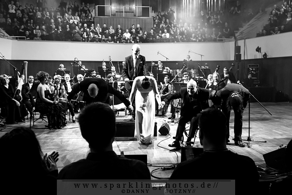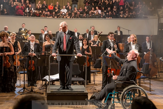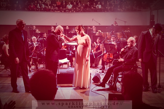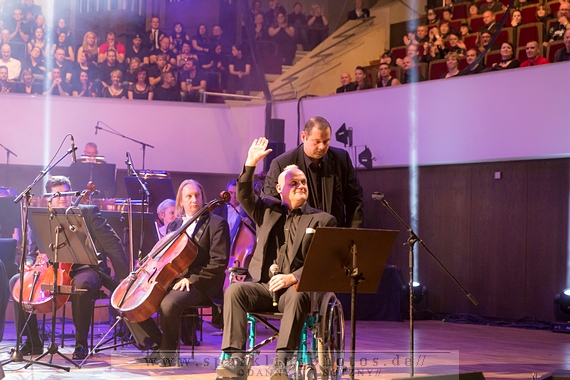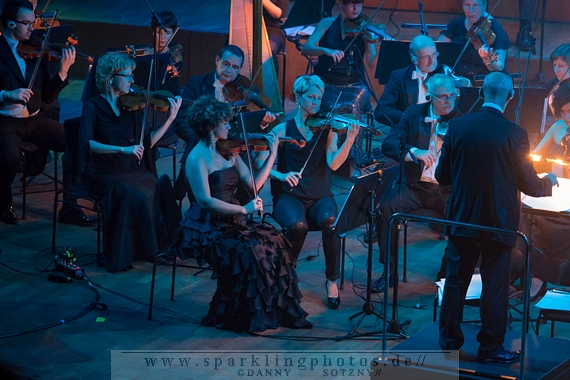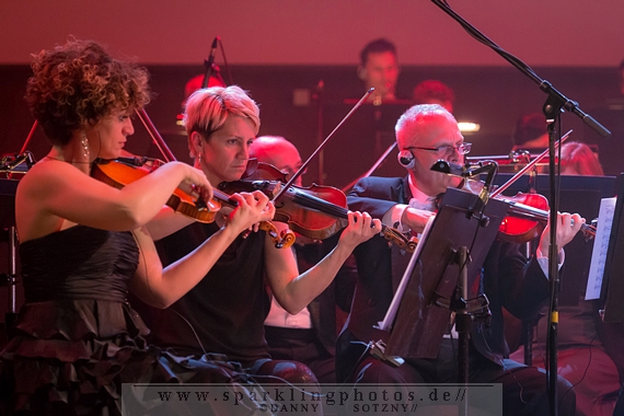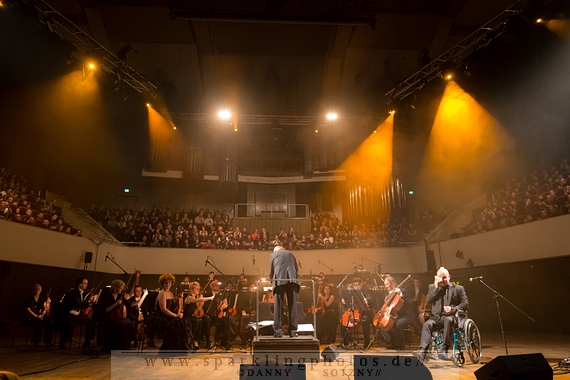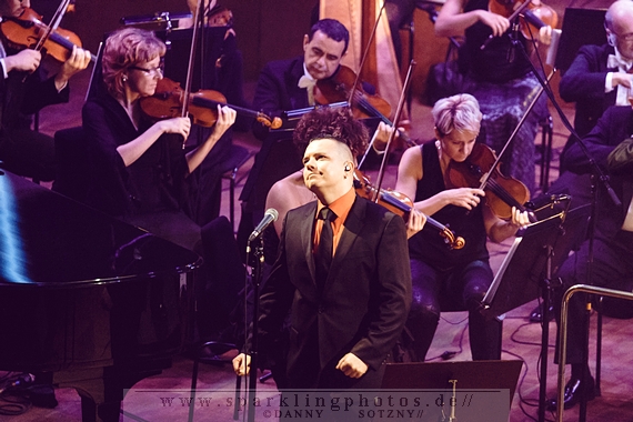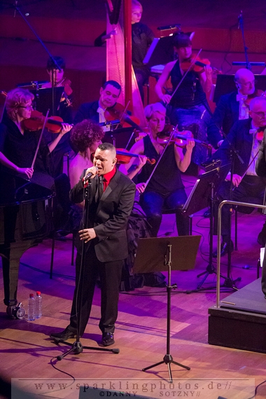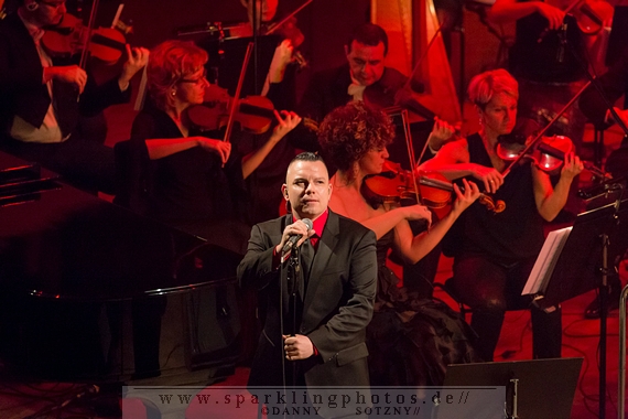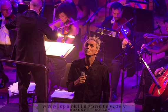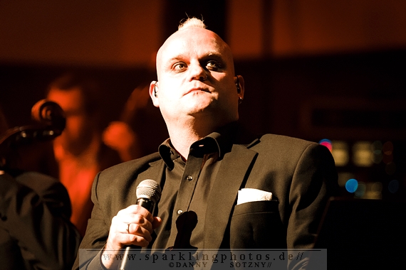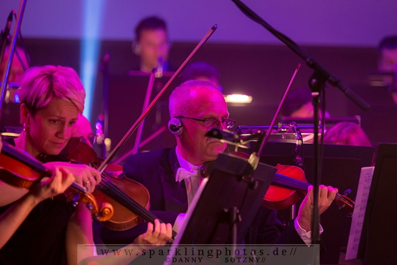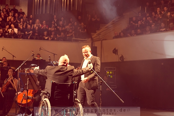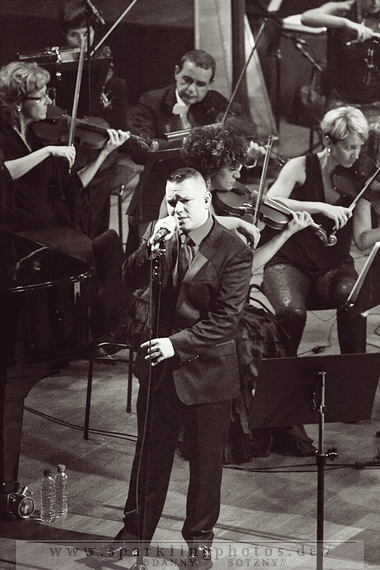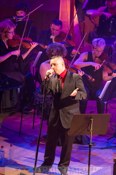weshalb er hier im Rollstuhl auf der Bühne steht und meinte spaßig zu seinen Fans: „Wofür braucht man ein Kreuzband, wenn man euch hat?“. Die Fans ließen keine Sekunde vergehen und jubelten und applaudierten ihm zu. Einen Gänsehautaugenblick gab es bei dem Song Nimmermehr, bei dem er seine ganze Kraft brauchte ? wie er im Vorfeld schon ankündigte. Dieser Song trieb nicht nur einigen im Publikum die Tränen in die Augen, sogar Martin Engler kämpfte mit den Tränen. Danach gab es in den Reihen kein Halten mehr – Standing Ovation für den Künstler. Ein sehr emotionaler Auftritt, man spürte wie ergriffen der Sänger von dem Zuspruch seiner Fans war. Nach dem letzten Song Voices of Doom und minutenlangem frenetischem Beifall sowie Standing Ovation holte Martin Engler noch seine Bandkollegen, Solitary Experiments und Veranstalter Steven Dornbusch auf die Bühne, um sich von jedem persönlich zu bedanken. Er dankte auch dem Dirigenten Czeslaw Grabowski sowie dem gesamten Orchester. Auch FLA wurden auf die Bühne gerufen – die Jungs von FLA standen auch schon bereit, als noch nach Sänger Bill Leeb gesucht wurde. Er schaute dann allerdings nur kurz durch die Tür, winkte und verschwand wieder. Als Zugabe gab es noch einmal Kein Weg zu weit zu hören, wobei Martin Engler den letzten Song stehend absolvierte. Mit den Worten „Es war uns eine Ehre, für Sie spielen zu dürfen“, verabschiedete er sich beim Publikum und ging mit den Krücken unter tosendem Applaus von der Bühne. Mit diesem letzten sehr emotionalen und großartigen Act ging das Gothic meets Klassik 2014 zu Ende.