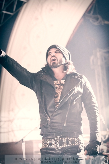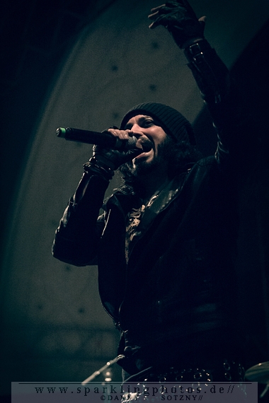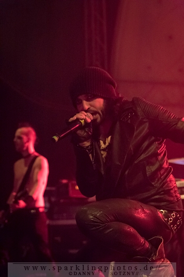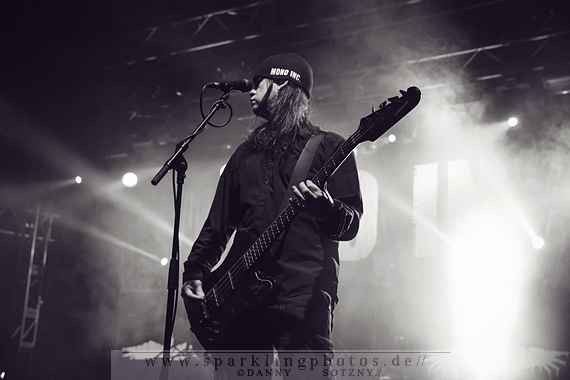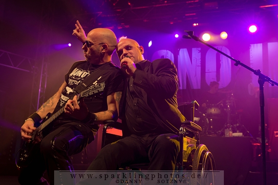 Die einen Fans gingen, die anderen kamen wieder in den Saal. Gegen 0:30 Uhr (gut eine Stunde später als geplant) war es dann endlich Zeit für den Headliner Mono Inc. [GALLERY]. Die Band betrat unter Jubel und tosendem Beifall nach und nach die Bühne. Als Martin Engler mit dem Rollstuhl auf die Bühne kam, gab es bei den Fans kein Halten mehr. Der Frontmann von Mono Inc. hatte auf dem Weg zur Orchester-Probe im polnischen Zielona Gora einen Kreuzband- und Meniskus-Riss erlitten. Noch am 29.10. wurde sein Knie operiert und am 01.11. saß er im Rollstuhl auf der Bühne. Alle Achtung! Bei dieser Gelegenheit verkündete er, dass Drummer Katha Mia im 7. Monat schwanger ist.