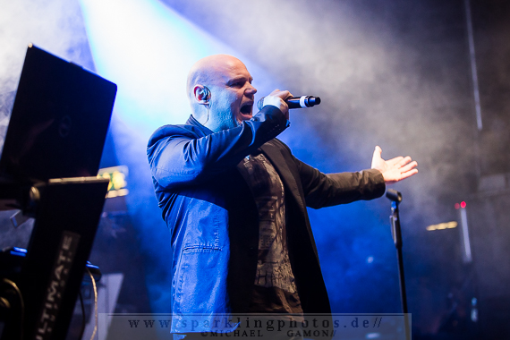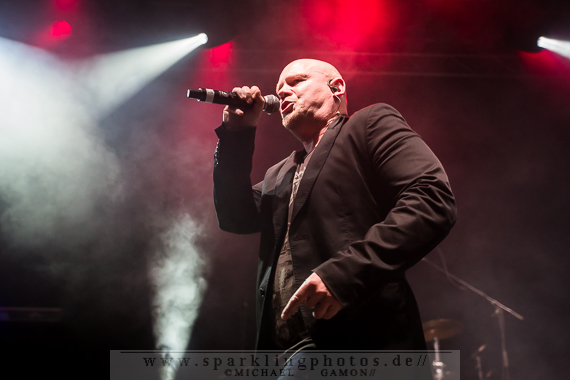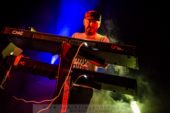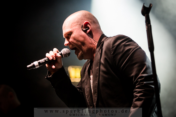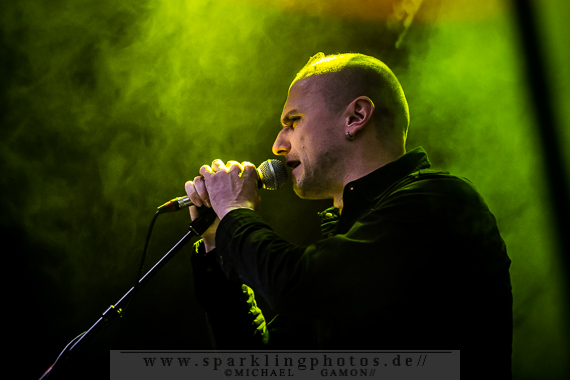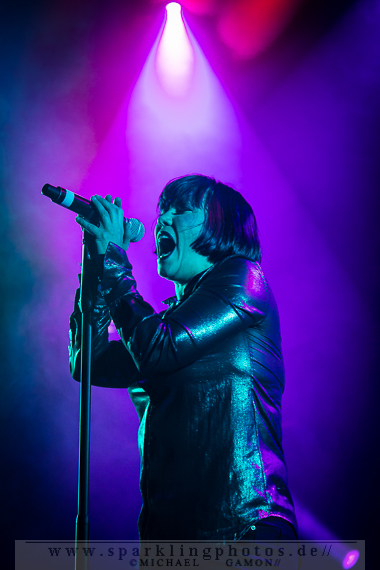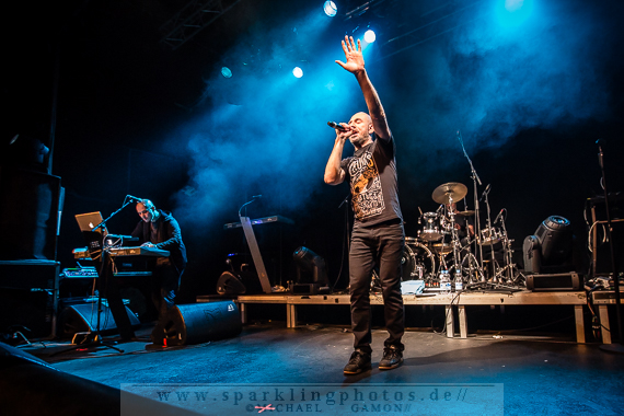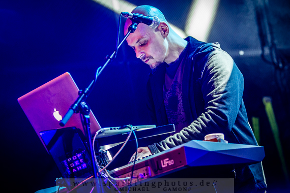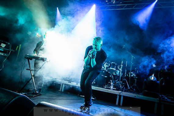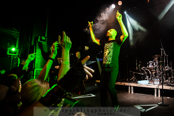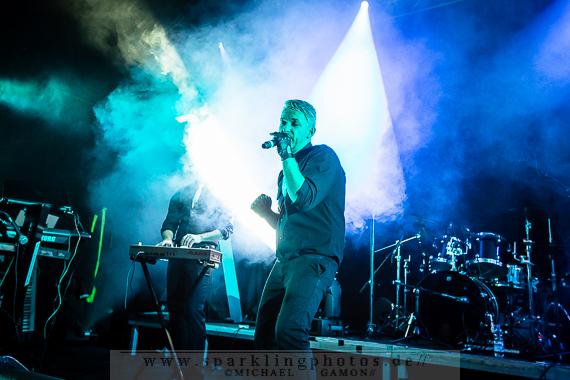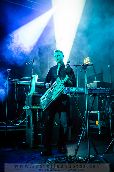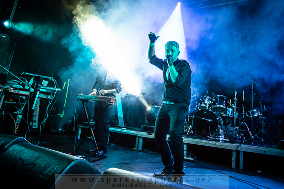 Nicht minder gut war die Stimmung bei der Synthpop Band De/Vision [GALLERY], die schon alte Hasen im Popgeschäft sind. Steffen Keth und Thomas Adam nebst Drummer gaben gehörig Gas und spielten einen bunten Mix aus ihrem musikalischen Schaffen, das bisher sage und schreibe 13 Alben umfasst. Mit mAndroids startete das Set und fing demnach etwas langsamer an, um sich im Laufe der Show zu steigern. Der Gesang von Frontman Steffen war beim ersten Titel zu sehr in den Vordergrund gemischt, die Musik zu leise, aber das legte sich nach zwei Songs und so konnten die Fans angemessen Party machen. Beim traurigen Try To Forget vom Debutalbum World Without End kam fast eine bedächtige Stimmung auf und alle Münder sangen den Chorus mit, was Steffen und Thomas sichtlich gefiel. Atemlos ging es weiter, denn Knaller wie Time To Be Alive und Your Hands On My Skin durften natürlich nicht fehlen. Leider halfen die Zugaberufe an Ende nichts. Der Zeitplan war straff und mit Flavour Of The Week verabschiedeten sich die Berliner von ihrem Publikum, um dem nächsten Höhepunkt Platz zu machen: nämlich der britischen Band Mesh [GALLERY], die die Kufa fast schon zur zweiten Heimat gemacht haben, so oft wie sie hier schon gespielt hatten. Wie schon beim diesjährigen Amphi Festival begannen Mesh ihr Konzert nicht auf der Bühne, sondern an der P.A. (findige Fans hatten bereits am Anfang des Abends das Keyboard und Gesangsmikrofon am Mischpult entdeckt). Richard Broadhead und Mark Hockings gaben quasi mitten im Publikum die Stücke Not Prepared und Trust You in einer Piano Version zum Besten, bevor die komplette Band auf der Stage mit Flawless vom aktuellen Album Automation Baby ihren Gig begann. Spätestens dann wurde getanzt, geklatscht und gar nicht mal so übel mitgesungen. (Weibliche Stimmen waren hier ganz deutlich im Vordergrund!). You Didn’t Want Me und From This Height folgten auf dem Fuße. Dass letztgenannter Song “nur “ eine B-Seite war, ist kaum nachzuvollziehen, gehört er doch zum Besten was die “Bristol-Boys” je komponiert haben! Mesh rockten die Bude und präsentierten einen Ohrwurm nach dem anderen, die bis hinter die letzten Zuschauerreihen mitgegröhlt wurden. Doch einige Highlights sollten noch folgen, denn eine Mesh Show lebt auch immer von süßen Ideen. Z.B. die mehr als gut gelungene Coverversion von Tuesday der Kultband Yazoo und dem Gastauftritt von Republicas Frontfrau Saffron beim Song Firefly, der viel zu kurz war und nach sofortiger Zugabe schrie. Jede gute Präsentation hat ein Ende und so verließen Mesh nach der Liebeserklärung an die Fans Friends Like These die Stage. Als Zugabe gab es dann noch Taken For Granted und die Kulturfabrik verwandelte sich in einen schwarz gekleideten Chor.Nach der Umbaupause sollte der Headliner Apoptygma Berzerk [GALLERY] das Pluswelt Festival beglücken, aber große technische Probleme sorgten dafür, dass die Geduld der Fans auf die Probe gestellt wurde und die Band somit erst mit 45-minütiger Verspätung anfangen konnte. Moderator Jens Domgörgen entschuldigte sich für diesen Delay und als zweiter Ansager ließ es sich Daniel von Aestethic Perfection nicht nehmen, die nachfolgende Performance zu präsentieren. Und diese hatte es in sich! Fast ganz in Dunkelheit gehüllt vor einem riesigen Banner, erschienen Stephan und Jonas Groth, Gitarrist Audun „Angel“ Stengel und Drummer Ted Skogmann beim Intro Starsign vom Album Welcome To Earth auf den Brettern und rockten los bis die Halle bebte. In 25 Jahren hat man als Band natürlich ein großes Repertoire und somit gingen die Skandinavier zurück in der Zeit und erinnerten mit Deep Red an frühere Momente, in denen man glücklich auf den Tanzflächen der Gothic Clubs tanzte und sich pudelwohl fühlte. Auch Love Never Dies von der CD 7 hat ebensolche Qualitäten und man merkte dem Publikum dabei an, wie verbunden es mit der Band war. Aber auch die jüngeren Stücke, wie Apollo (Live On Your TV) oder Until The End Of The World, die den alten APB Stil aufbrachen und eher poppiger und rockiger daherkamen, wurden gefeiert, so dass in der Setlist keine Sekunde Langweile aufkam und eine schöne, abwechslungsreiche Show zu bestaunen war. Zur weiteren Auflockerung intonierte Apop zwei Coverversionen: (das leider eher überflüssig zu nennende) Love Will Tear Us Apart von Joy Division und das sehr gut interpretierte Major Tom (Völlig losgelöst) von Peter Schilling (Stephan: “The best german song ever written!”). Natürlich durfte der Alltime-Klassiker Non-Stop Violence nicht vergessen werden und diese Liveversion hatte es in sich. Voller Power und Verve schmetterten die Musiker den Song mit der (leider) immer aktuellen Thematik in das Publikum, welches ihn gebührend durch Tanz- und Sangeseinlagen zelebrierte. Wie es sich für eine gute Party gehört, gab die Band für das Geburtstagskind und Pluswelt Boss Jan Winterfeld ein Ständchen namens Something I Should Know und überreichte zudem im Anschluss ein weiteres cooles Geschenk: APB spielten zur vollen Freude der Fans den Mesh Remix von Mourn mit Mark Hockings im Duett, was allerorts für Ekstase sorgte. Mit dem Outro APB Goes C-64 verließen Apoptygma Berzerk die Bühne und das Partyvolk hatte als Krönung noch das Vergnügen mit Gast-DJ Steffen Keth bei der Aftershow-Party den letzten Rest Energie weg zu tanzen. So eine ungewöhnliche Geburtstagsparty, bei der die Gäste beschenkt wurden, erlebt man auch nicht alle Tage. Bleibt zu hoffen, dass in Zukunft noch mehr solche Feiern stattfinden.Bilder des Festivals und der beteiligten Bands befinden sich in unserer Konzertfotos Sektion (Bildkommentare sind dort durch Anklicken der gelben Sprechblase oben rechts möglich) oder direkt durch Anklicken der jeweiligen Gallery-Links bzw. Fotos.