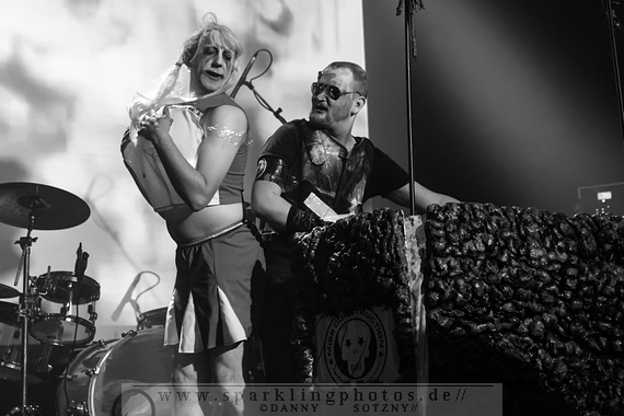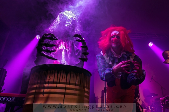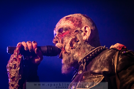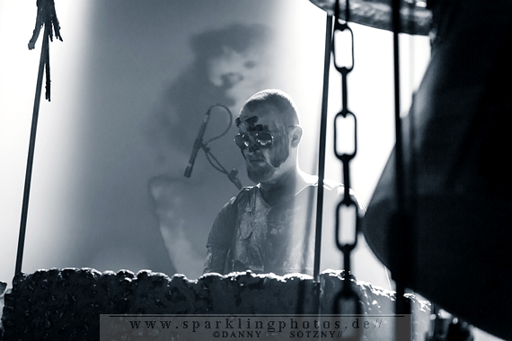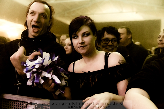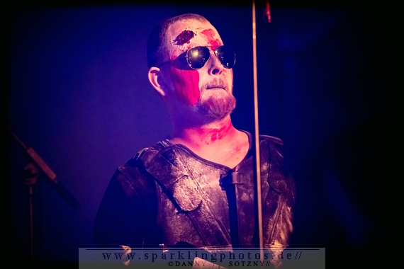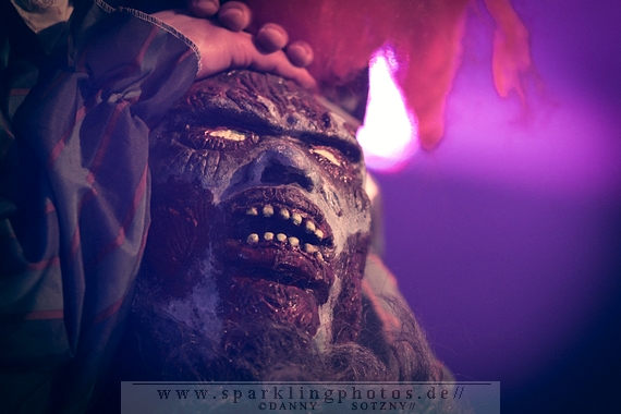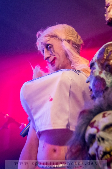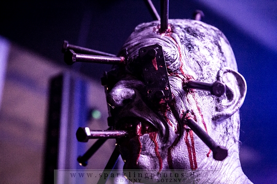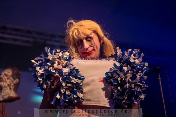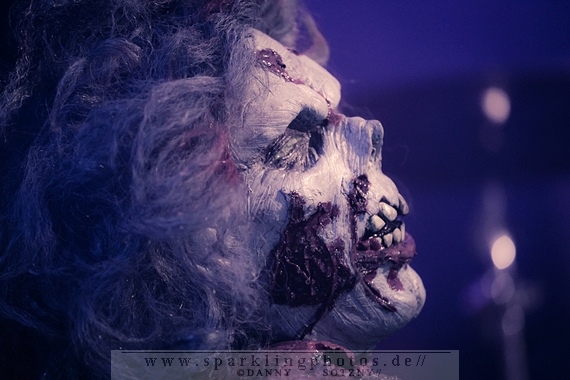 Wer oder was sind eigentlich Miss Construction? Miss Construction sind erst einmal ziemlich heftig und bedingungslos elektronisch. Aber vor allem: Miss Construction verspricht jede Menge Spaß. Die Band wurde 2008 von Chris Pohl gegründet, mit Gordon als verrückter Frontsau! Wer mit Schrumpfköpfen, Blut und dampfenden Hexen in Mülltonnen eine Bühnenshow darbietet, muss einfach nur ein klein wenig verrückt sein. Frontmann Gordon erschien als uniformierter Zombie auf der Bühne und schon konnte der elektronische Blitzkrieg die Fans niederwalzen. Bereits bei Totes Fleisch wurde nicht mit Blut gegeizt. Im Hintergrund liefen zu den aktuellen Liedern die offiziellen Videos. Bei der Darbietung des Liedes Alptraumclown tummelte sich ein lustig anzusehender Clown auf der Bühne. Er erinnerte mich irgendwie an den Clown von Stephen Kings „ES“. Die Fans waren begeistert und ich auch. Diese Bühnenshow ist großartig und einfach nur Party, Party, Party. Der eingängige Beat von Miss Construction lädt zum Mittanzen ein. Mit dem Lied I’m a bitch wurde uns von Gordon ein Liebeslied angekündigt und schon rekelte sich eine hübsche Blondine um Gordon und begann eine kleine Stripshow. Die Fans tobten und honorierten die Band mit frenetischen Beifallsstürmen. Aber leider hat alles ein Ende und mit Kunstprodukt kam dieses leider viel zu schnell. Bereits jetzt löste sich schon die Kunsthaut von Gordons Gesicht und beherzt schmiss er die abfallenden Fetzen in die tobende Masse. Einfach nur großartig und als Opener heizten sie mit ihrem Splatter – Porno – Zombie – Party – Pop so richtig ein, die Party hatte begonnen und das mehr als nur gelungen.