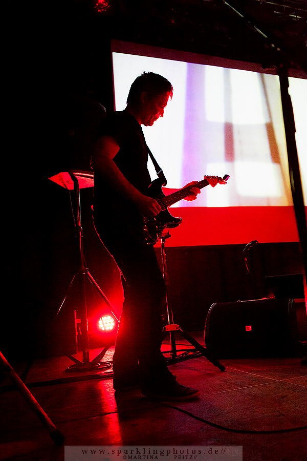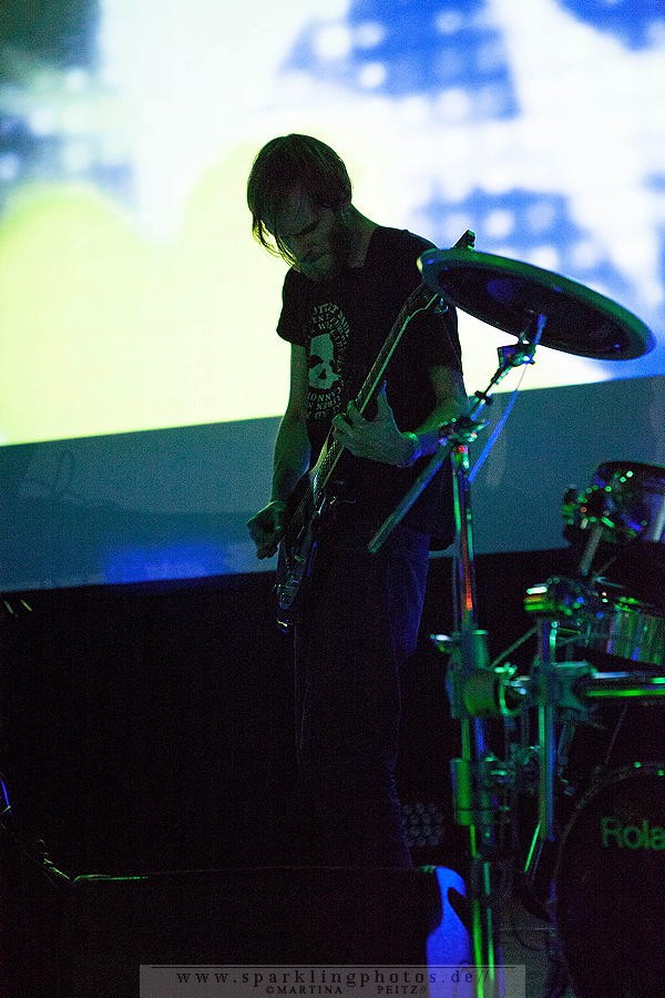 Laptop, Gitarre und Effektgeräte gehören zu den Aufgaben die Rother übernimmt. Eine zweite, nie still stehende Gitarre und das im Vordergrund aufgebaute Schlagzeug vervollständigen den Sound des besonderen Konzertes.