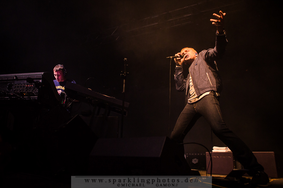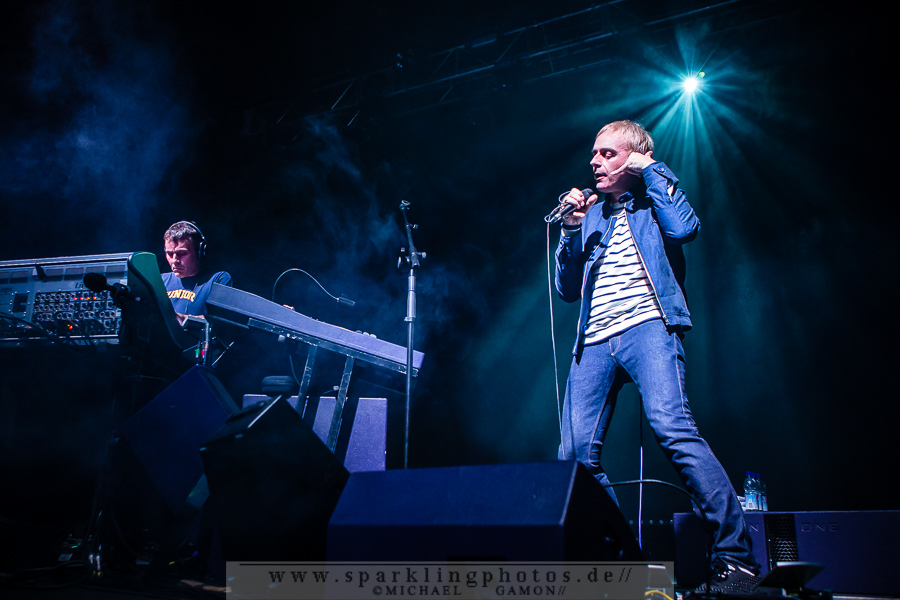 Das DJ-Set ging pünktlich um 21.30 Uhr nahtlos in das Konzert über, es begann mit leuchtenden Bigmouth-Schriftzügen, dann ein Intro und Dark & Long rollte durch das Palladium. Das Publikum hatte lang gewartet, seit Einlass waren schließlich knapp zwei Stunden vergangen, und die Euphorie war dementsprechend groß. Einen solchen Empfang hatten Karl Hyde und Rick Smith wohl eher nicht erwartet, denn der Dank an das Kölner Publikum wirkte ehrlich und ehrlich überrascht. So erzählte dann Karl Hyde auch kurz vom großen Einfluss, den Conny Plank, der deutsche Produzent und Musiker, Pionier der elektronischen Musik, auch auf Underworld hatte. 1982 waren die beiden schon mal in Köln um Conny im Studio zu besuchen…