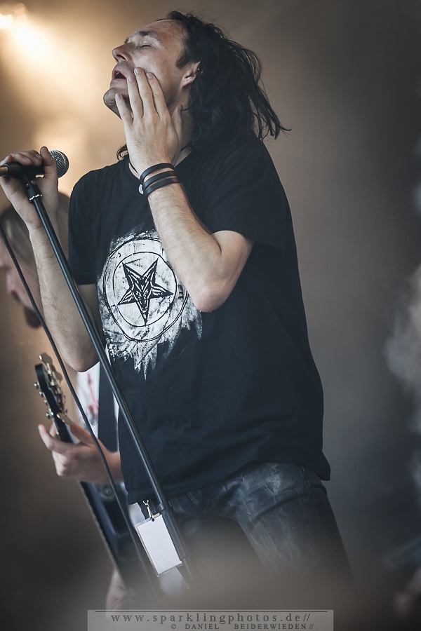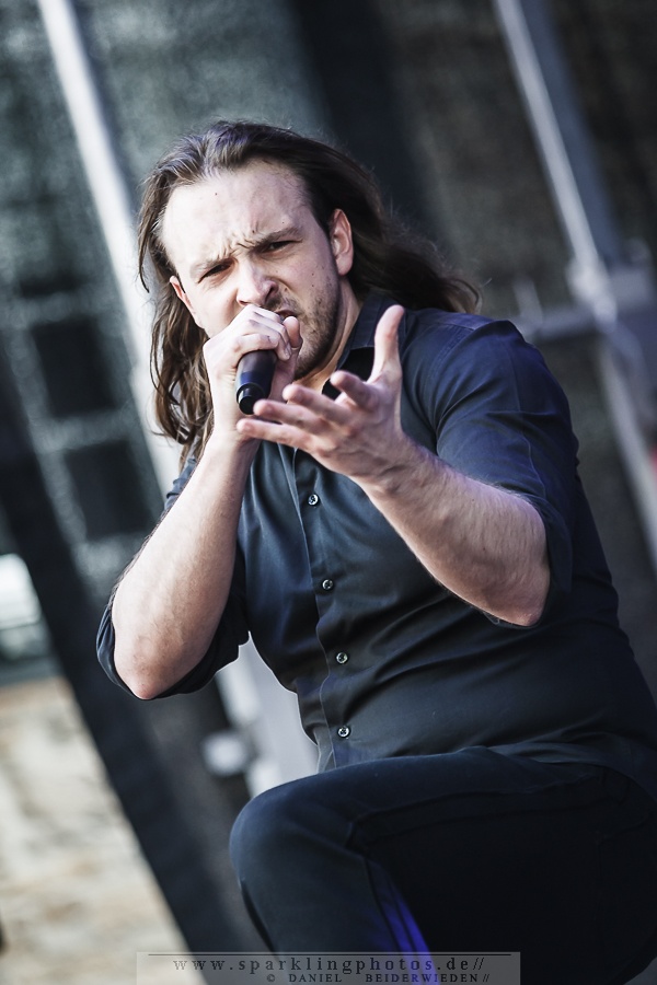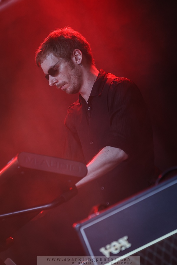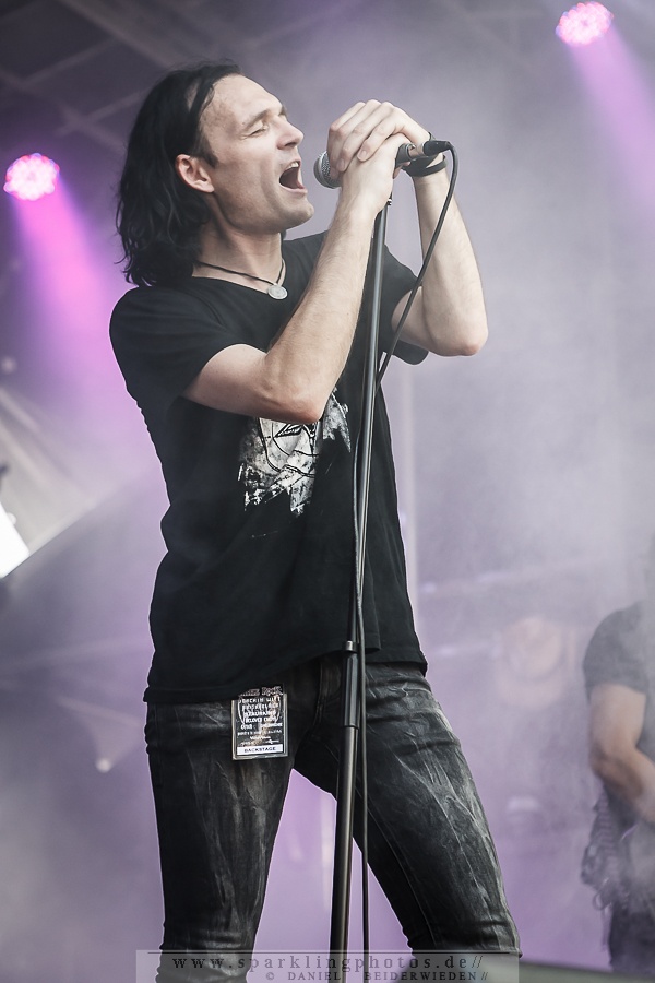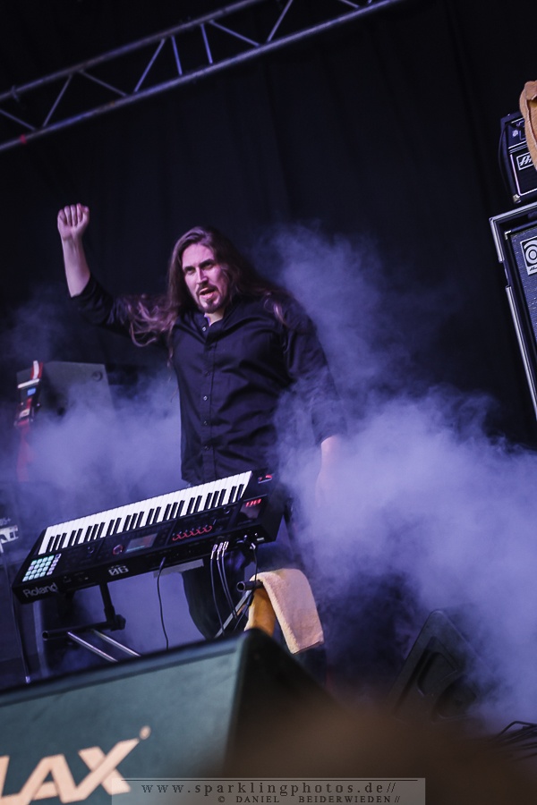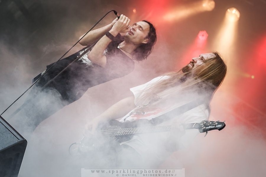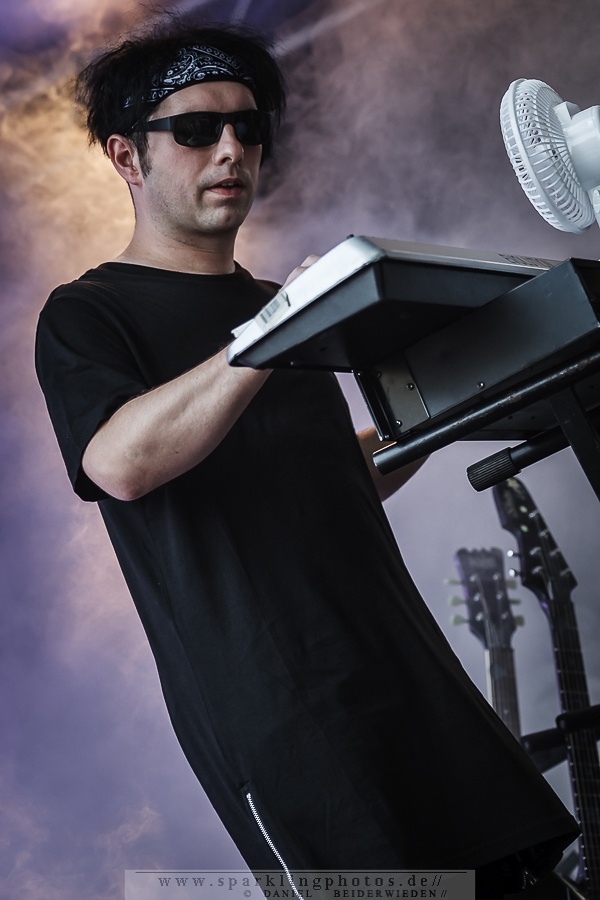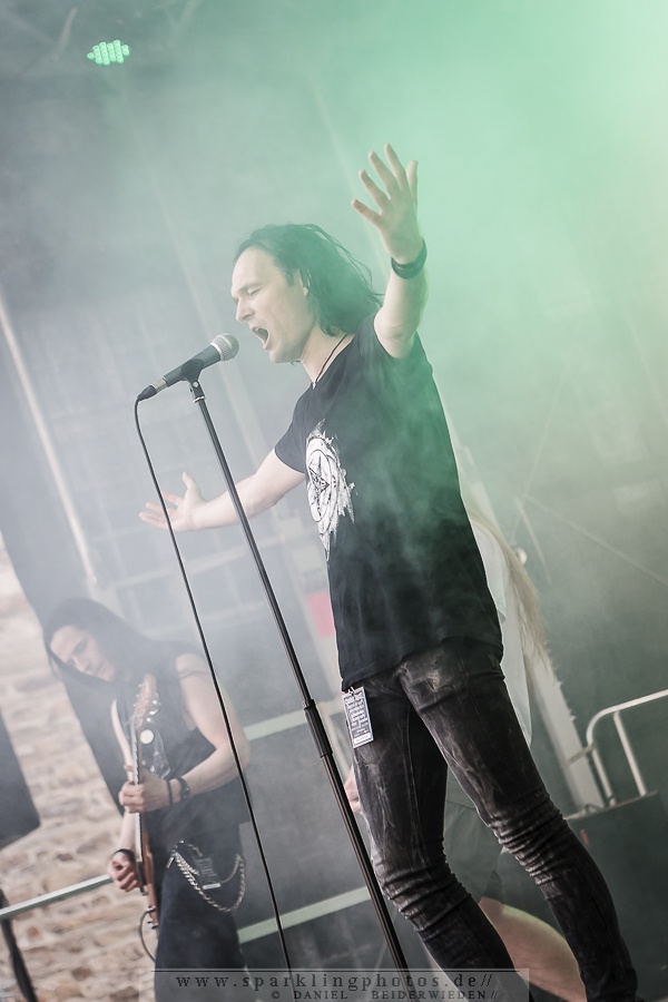 Am Freitag eröffneten Aeon Sable [GALLERY] aus Essen das Festival um 17:30 Uhr. Sänger Nino Sable entschied sich mutig bei den Temperaturen zu Beginn der Show für Jeans und Kapuzenpullover, bereute diese Kombi nach dem ersten Song aber direkt und zog, zumindest was das T-Shirt anging, mit seinen Bandkollegen gleich. Nachdem die klimatischen Bedingungen geklärt waren, konnte es so richtig losgehen mit einem Mix aus treibenden und tragenden Klängen, gepaart mit satten Gitarrenriffs. Die Band gibt es seit 5 Jahren und es wurde viel aus dem 2014 erschienen Album Visionaers gespielt. Aeon Sable agieren auf der Bühne sowhl kraftvoll, als auch geheimnisvoll – halb im Nebel- versunken und stellten mit Elysion zudem einen bisher unveröffentlichten Track vor. Dem Publikum gefiel es gut, auch wenn man sich aufgrund der Hitze darauf beschränkt hatte, diese Zustimmung durch ein fleißiges Kopfnicken kund zu tun.