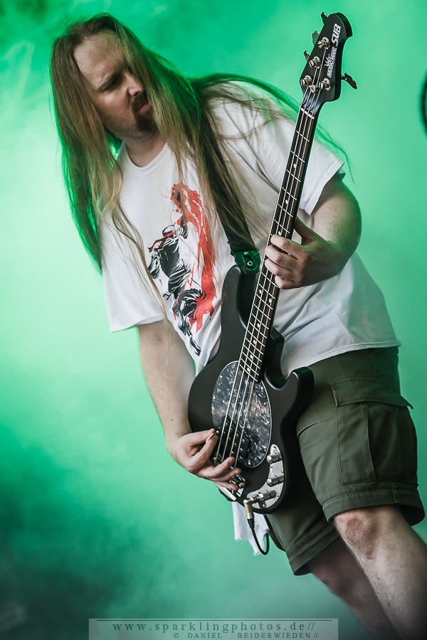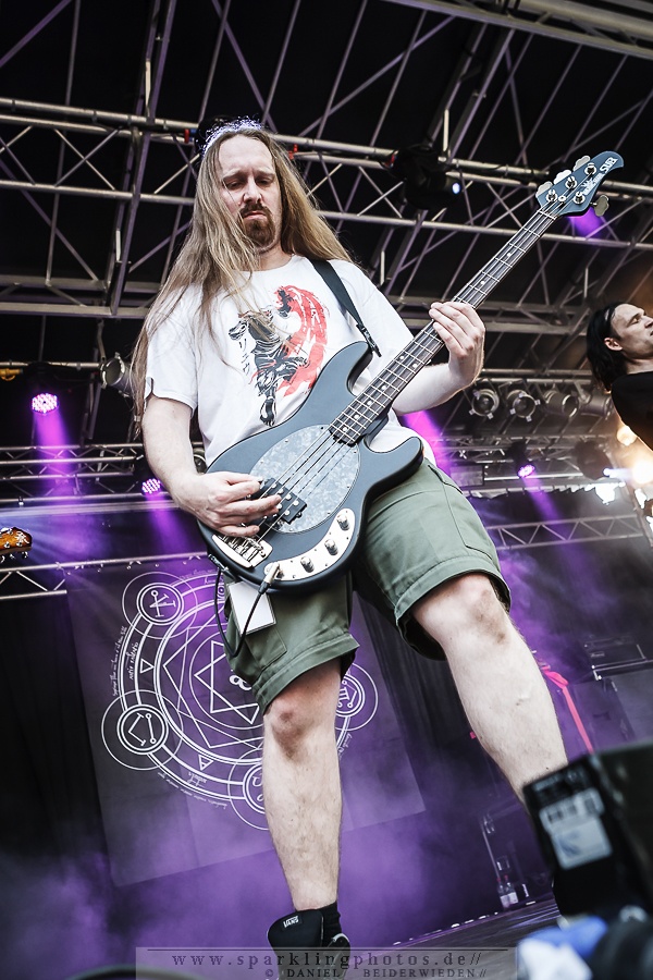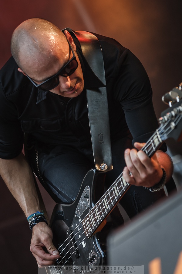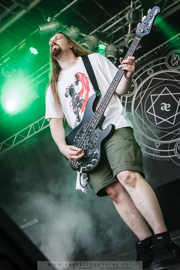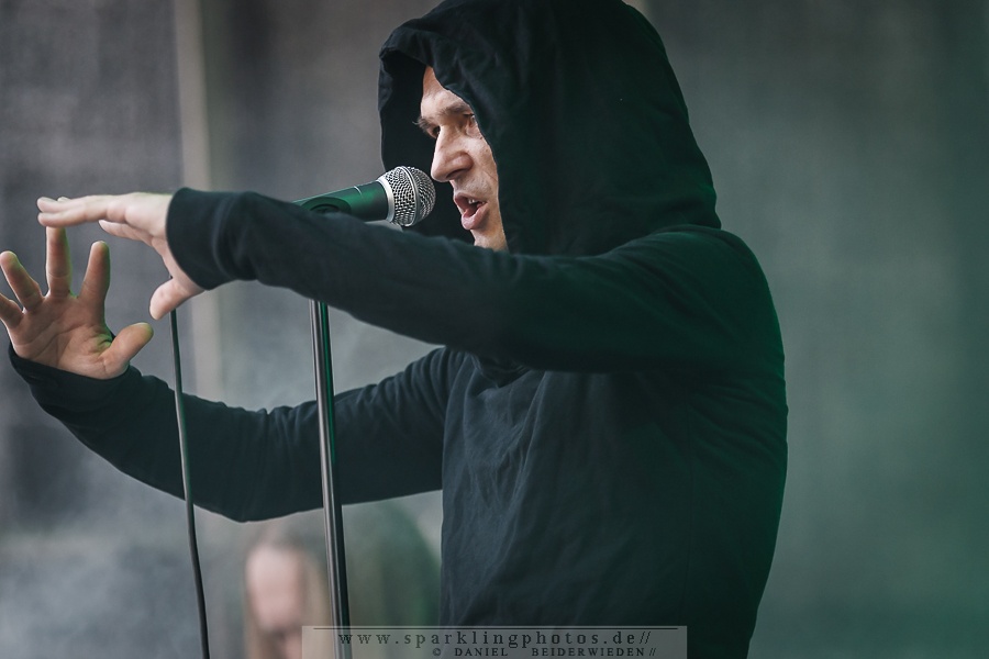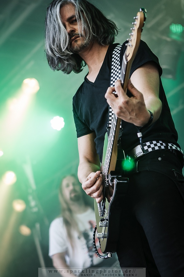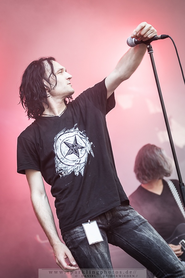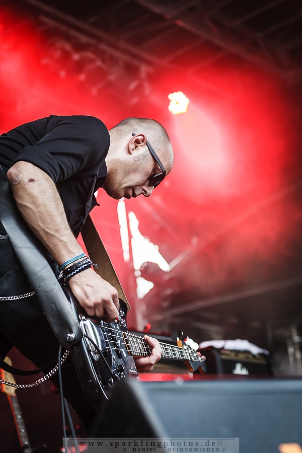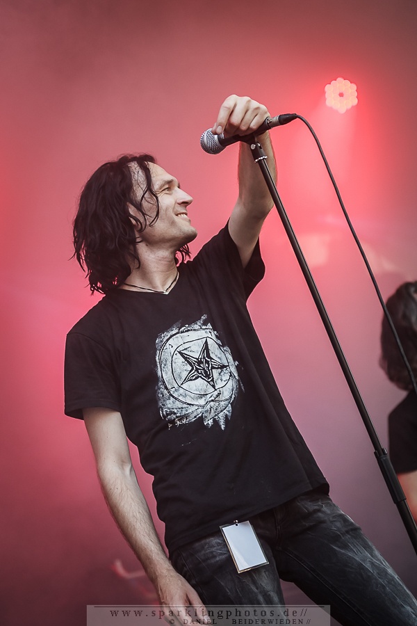 Am Freitag eröffneten Aeon Sable [GALLERY] aus Essen das Festival um 17:30 Uhr. Sänger Nino Sable entschied sich mutig bei den Temperaturen zu Beginn der Show für Jeans und Kapuzenpullover, bereute diese Kombi nach dem ersten Song aber direkt und zog, zumindest was das T-Shirt anging, mit seinen Bandkollegen gleich. Nachdem die klimatischen Bedingungen geklärt waren, konnte es so richtig losgehen mit einem Mix aus treibenden und tragenden Klängen, gepaart mit satten Gitarrenriffs. Die Band gibt es seit 5 Jahren und es wurde viel aus dem 2014 erschienen Album Visionaers gespielt. Aeon Sable agieren auf der Bühne sowhl kraftvoll, als auch geheimnisvoll – halb im Nebel- versunken und stellten mit Elysion zudem einen bisher unveröffentlichten Track vor. Dem Publikum gefiel es gut, auch wenn man sich aufgrund der Hitze darauf beschränkt hatte, diese Zustimmung durch ein fleißiges Kopfnicken kund zu tun.