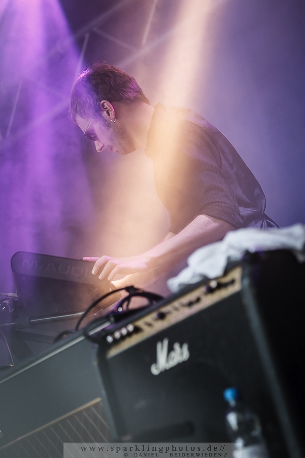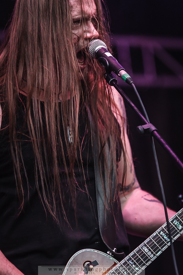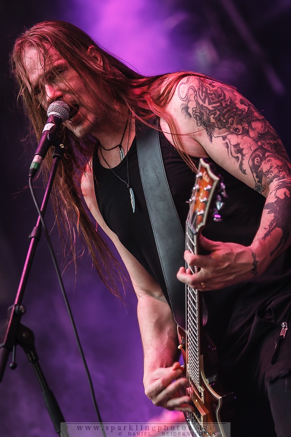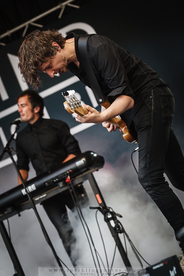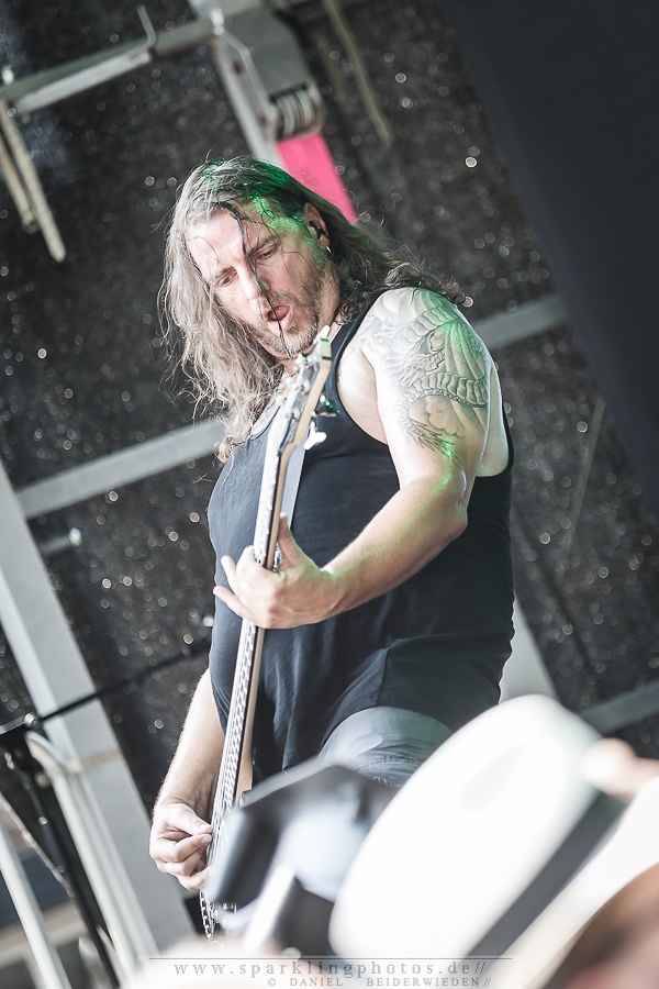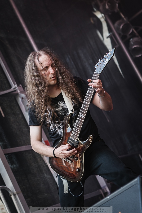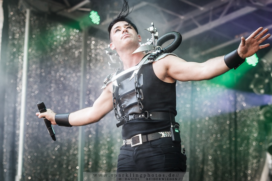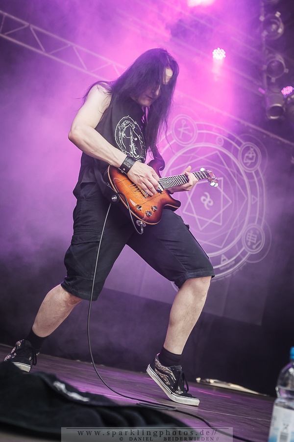 Am Freitag eröffneten Aeon Sable [GALLERY] aus Essen das Festival um 17:30 Uhr. Sänger Nino Sable entschied sich mutig bei den Temperaturen zu Beginn der Show für Jeans und Kapuzenpullover, bereute diese Kombi nach dem ersten Song aber direkt und zog, zumindest was das T-Shirt anging, mit seinen Bandkollegen gleich. Nachdem die klimatischen Bedingungen geklärt waren, konnte es so richtig losgehen mit einem Mix aus treibenden und tragenden Klängen, gepaart mit satten Gitarrenriffs. Die Band gibt es seit 5 Jahren und es wurde viel aus dem 2014 erschienen Album Visionaers gespielt. Aeon Sable agieren auf der Bühne sowhl kraftvoll, als auch geheimnisvoll – halb im Nebel- versunken und stellten mit Elysion zudem einen bisher unveröffentlichten Track vor. Dem Publikum gefiel es gut, auch wenn man sich aufgrund der Hitze darauf beschränkt hatte, diese Zustimmung durch ein fleißiges Kopfnicken kund zu tun.