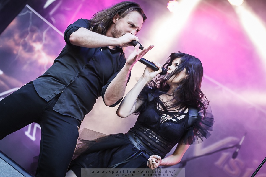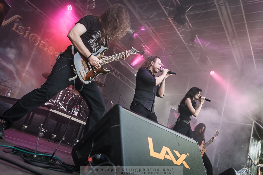 Als nächste Band betreten Visions of Atlantis [GALLERY] um 18:30 Uhr die Bühne. Die Sonne lacht weiterhin vom Himmel und zwingt die meisten Besucher leider immer wieder in den Schatten zurück. Visions of Atlantis lassen sich davon aber nicht beirren und legen direkt fulminant los. Clémentine Delauney setzt sich als Power-Frontfrau gekonnt in Szene und harmoniert stimmlich gut mit Leadsänger Siegfried Samer, beide sind seit 2013 bei der Band, ursprünglich gibt es Visions of Atlantis schon seit 2000. Sie animieren ihr Publikum immer wieder zum Mitmachen, die Schattenlinie wandert weiter Richtung Bühne, die Leute wandern mit. Symphonic Metal, der sich im Gehörgang einnistet und dort für gute Stimmung sorgt. Mit einem Handtuch auf der Bühne lässt es sich gut aushalten und auch die Festivalbesucher kommen in Bewegung.