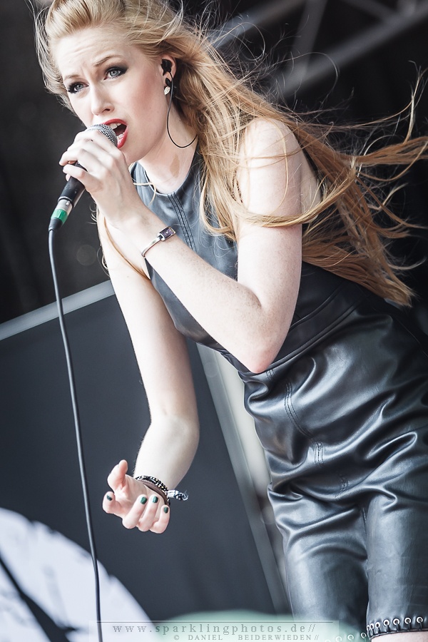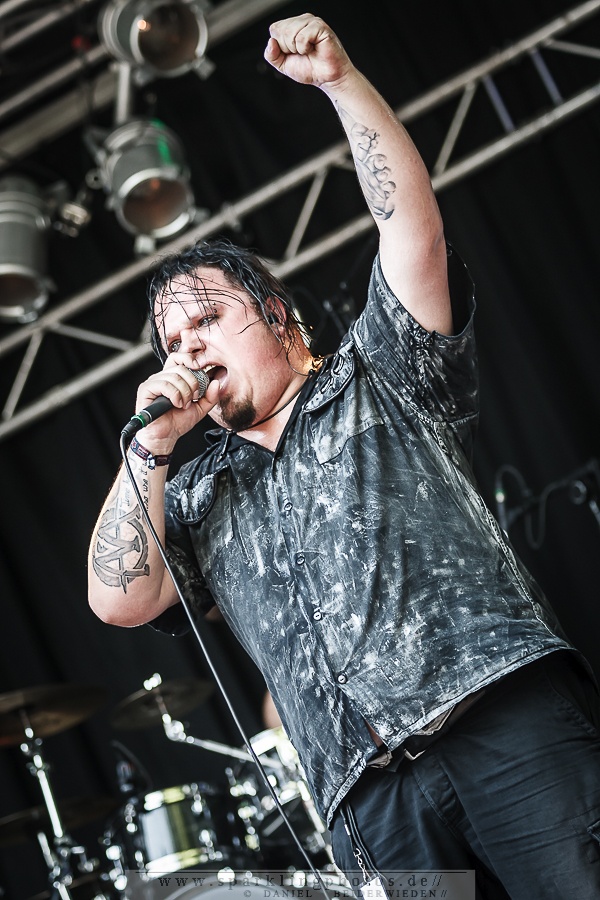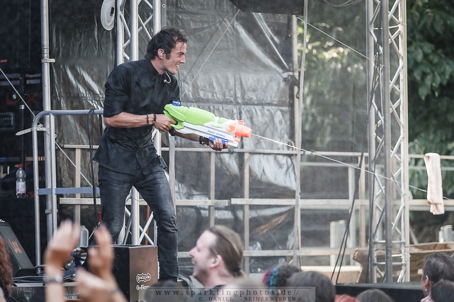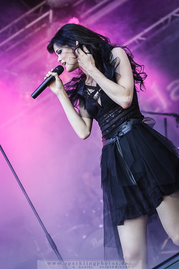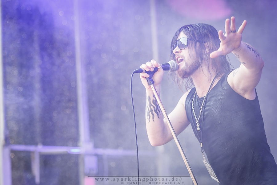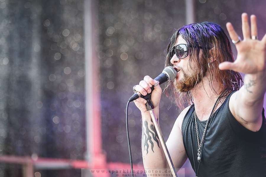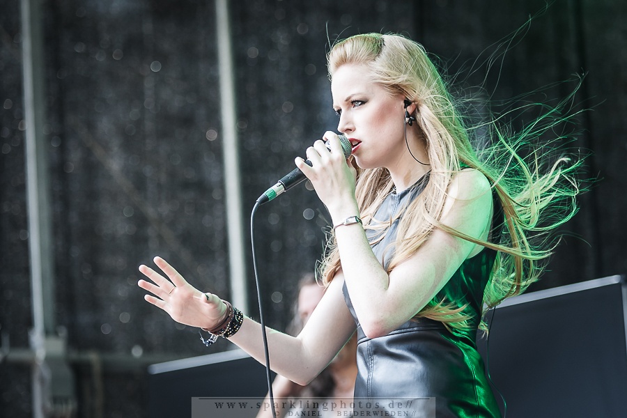 Album und finde es klasse. Die Rede ist von Aeverium [GALLERY], eine von vielen Einflüssen geprägte, junge, starke Band aus Viersen hier in Deutschland. Die Stimmen von Frontfrau Aeva Maurelle und Marcel „Chubby“ Römer harmonieren sehr gut, sind aber auch einzeln für sich sehr stark. Die Shouts vom Leadsänger bringen Tempo und Druck in die abwechslungsreichen Lieder. Das Album Breakout hat es jetzt in meinen CD-Schrank geschafft und euch kann ich es auch wärmstens empfehlen.Aber nicht nur deren Musik macht Eindruck, auch die Band selber ist sehr kommunikativ, nimmt direkt Kontakt zu ihrem Publikum auf und animiert zum Mitmachen, getreu dem Motto „Wenn wir arbeiten müssen, dann ihr auch“ (O-Ton). Und dass das so früh am Tag so hervorragend klappt spricht für sich. Das Publikum tummelt sich in der prallen Sonne vor der Bühne und feiert. Diesen Anblick belohnte Michael Bohnes dann auch sehr gerne mit dem ersten Einsatz des allseits heiß ersehnten Gartenschlauches. Wasser Marsch in die Menge! Als der Auftritt dann vorbei ist, gehen Aeverium mit lang anhaltendem Applaus.