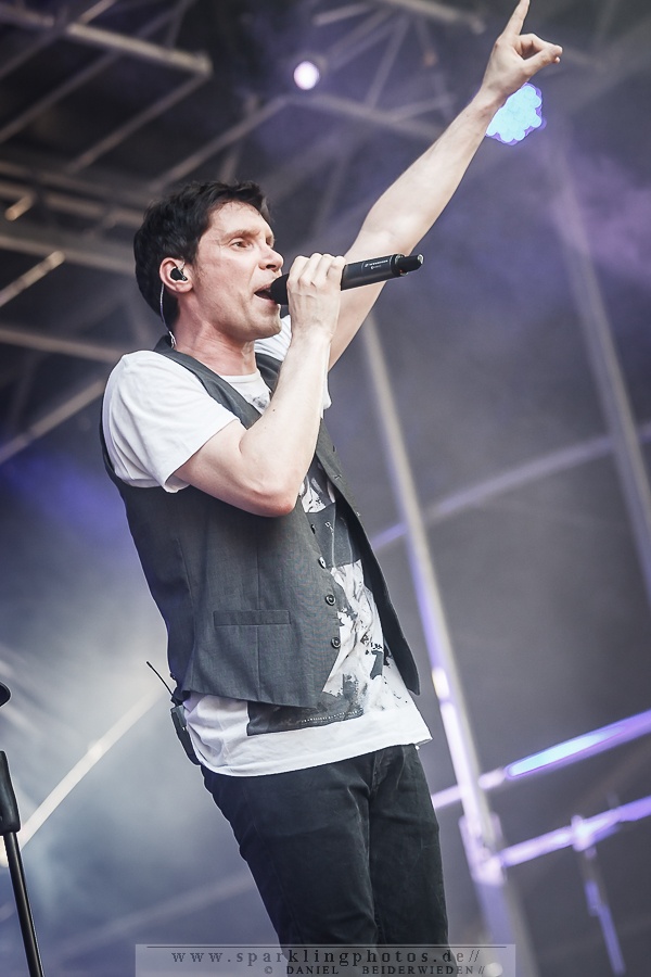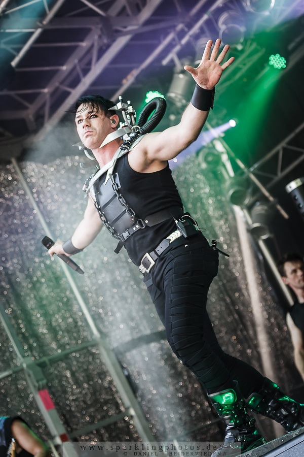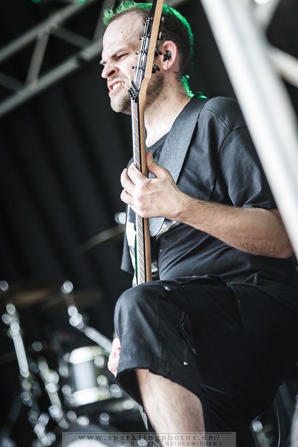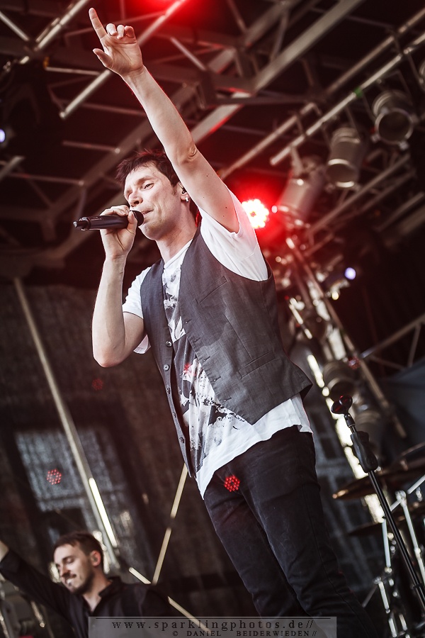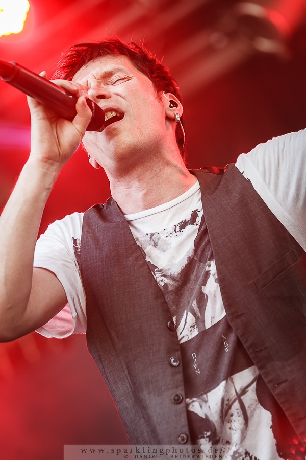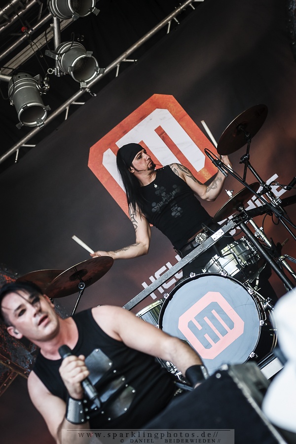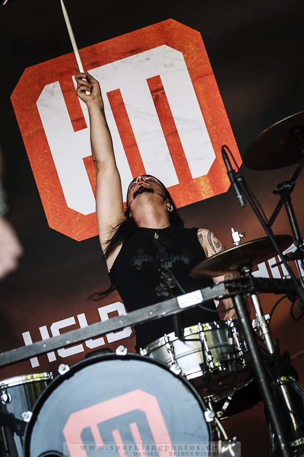 Es ist warm, unglaublich warm und an diesem Zustand ändern auch Heldmaschine [GALLERY] um 16:20 Uhr nichts, im Gegenteil. René Anlauff betritt die Bühne nach seinen Bandkollegen und gemeinsam feuern sie direkt aus allen Rohren, verbal und später auch per Pyrotechnik.