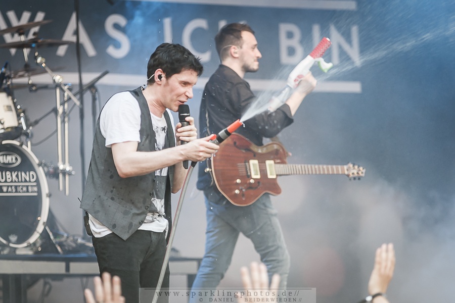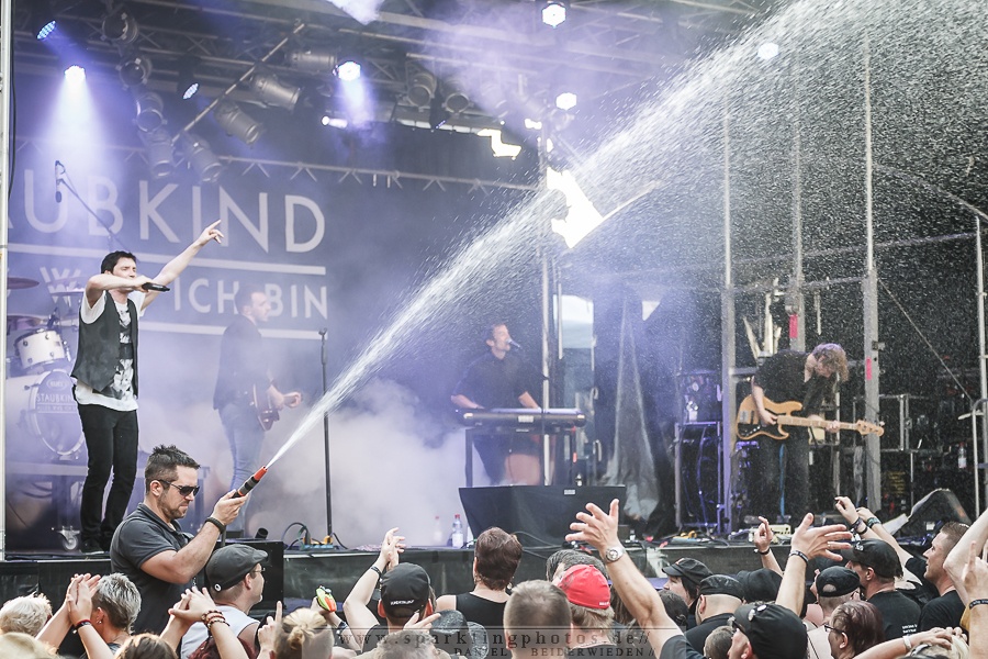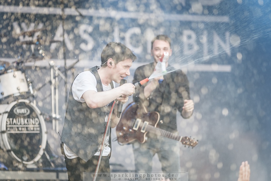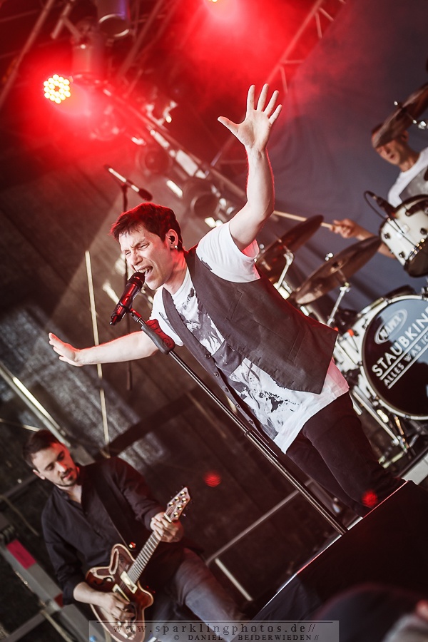 Deutsche Texte, direkt und ohne Schnickschnack, dafür mit Anspruch, kommen gut an. Jeder der Staubkind kennt, kennt auch die unverwechselbare Stimme von Sven Manke, er kann gut leise, aber auch laut und was er auch kann ist lustig, denn bei dem Lied Durch den Regen kam ihm die Sonne grad nicht so recht, dafür der Gartenschlauch. Der Refrain des Liedes wurde also zu einem 4-D Erlebnis – jedoch nicht nur für das Publikum, denn dieses hatte aufgerüstet und schoss mit Wasserpistolen zurück auf die Bühne. Im Anschluss haben Staubkind noch zwei Geburtstagskinder an dem Tag sehr glücklich gemacht, indem sie diese auf die Bühne geholt haben. Und nachdem das Publikum mit den Gymnastikübungen (in die Hocke und springen) fertig war, gab es für alle noch Ballons in die Menge zum „spielen“.