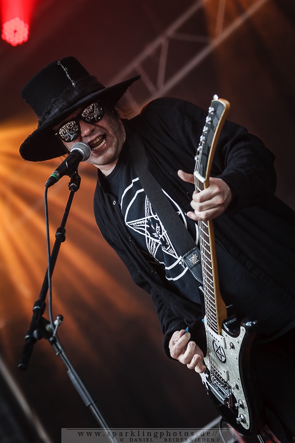 The Other [GALLERY] klopfen um kurz nach 15 Uhr an die Tür, sie bringen feinsten Horrorpunk mit. Und die Bandmitglieder genießen unser Mitleid, wenn sie da mit Masken und Gugel auf der Bühne stehen – es muss sehr sehr warm darunter gewesen sein. Nichts desto trotz rocken sie das Schloss in gewohnter Weise! Mal deutsche Texte, dann wieder englische, die Musik direkt und rotzig. An sich würde sich das Repertoire von The Other hervorragend zum Pogen eignen, die Sonne hat aber ein Veto eingelegt, so bleibt es bei anerkennendem und fast ein bisschen enthusiastischem Kopfnicken der Zuschauer. Die Schminke hält durch und das Publikum im ersten Viertel des Schlossinnenhofes auch.
