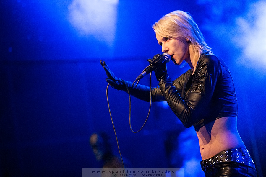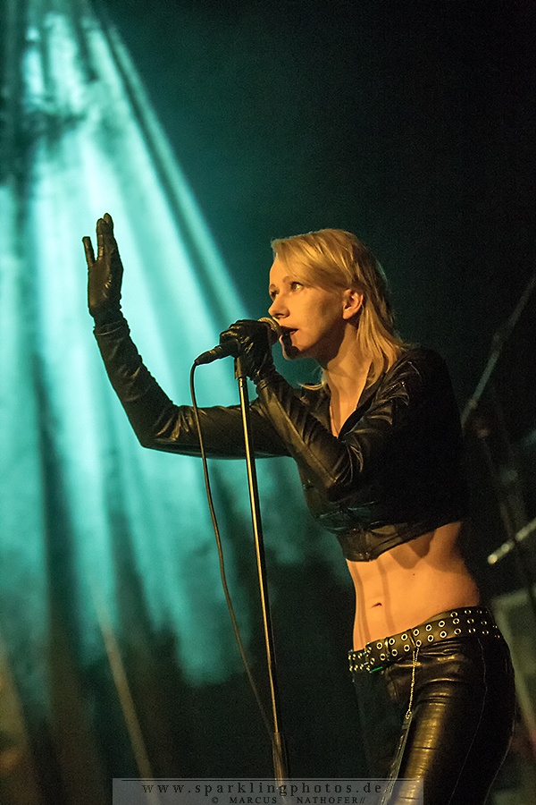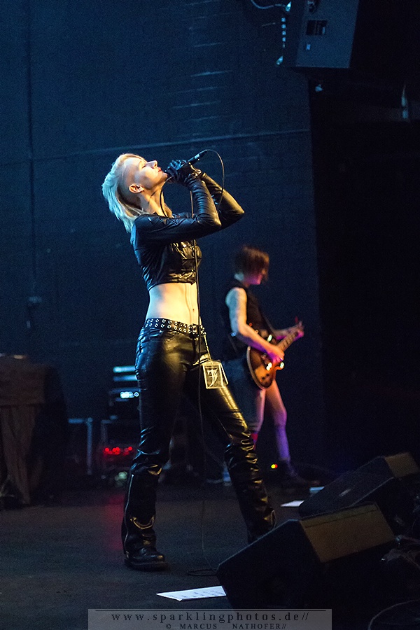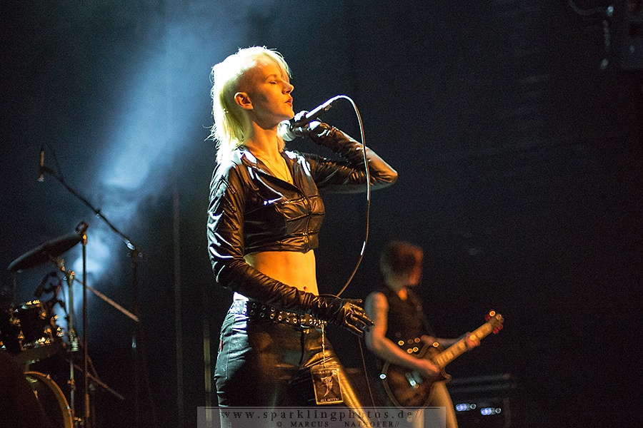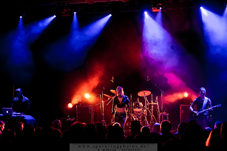 Zunächst eröffnete aber ca. 20.30 Uhr Monica Jeffries den Abend. Und die stimmlich wie musikalisch doch recht ansprechende Performance der Hamburgerin und ihrer beiden Mitstreiter/innen an Maschine und Gitarre scheiterte leider an einer katastrophalen Akustik. Viel zu dumpf und viel zu leise tönten die synthie-poppigen Songs durch den Raum. Zudem schien einem größeren Teil des Publikums der Sinn doch eher nach härteren – und vielleicht auch monotoneren – Tönen zu stehen.