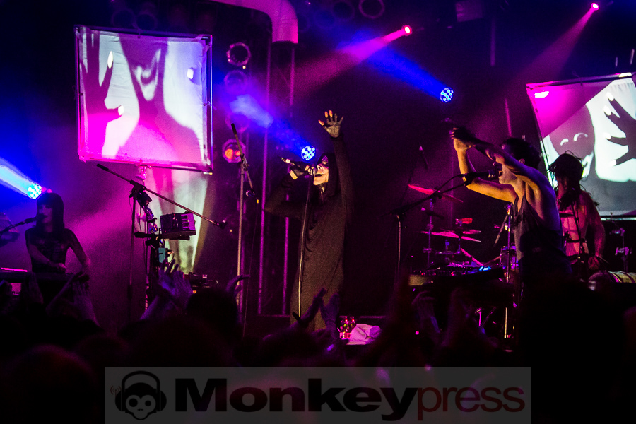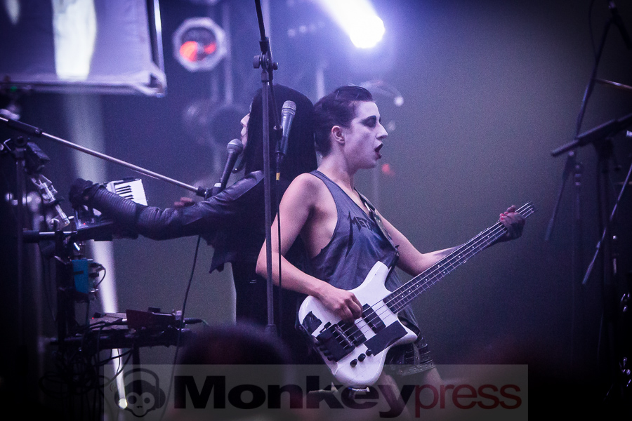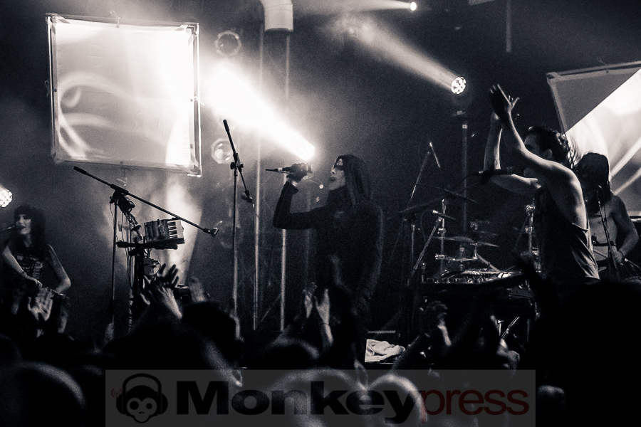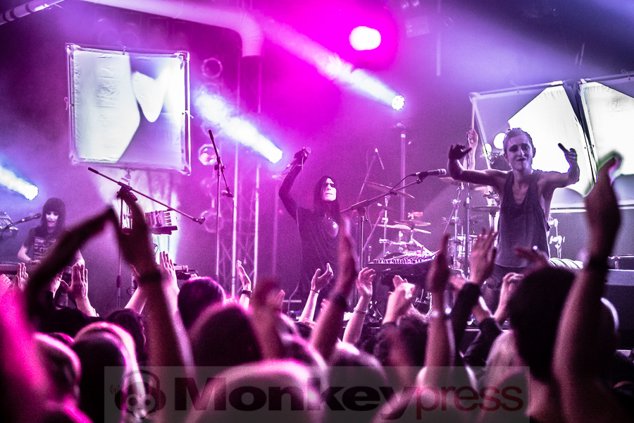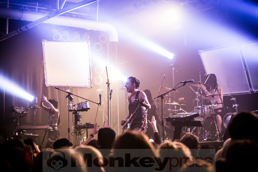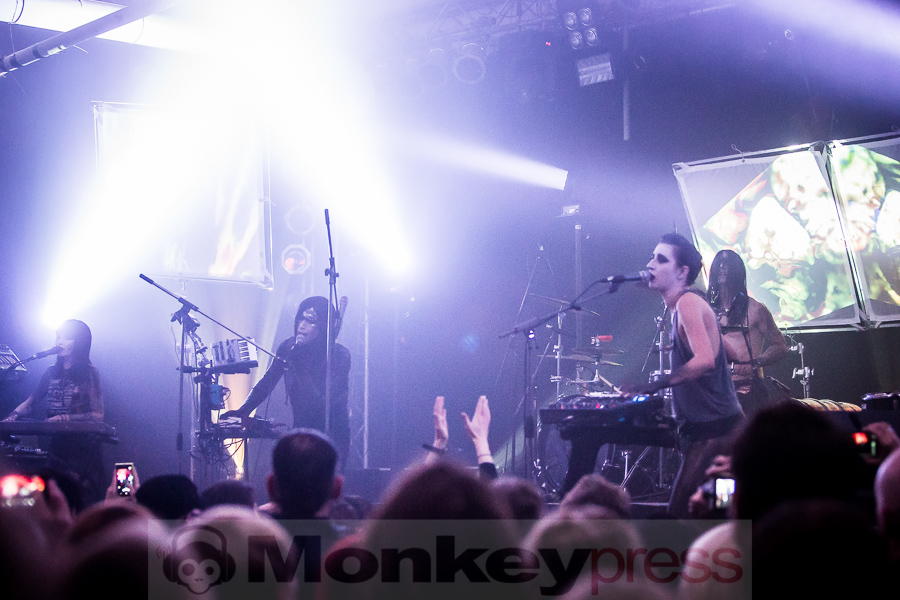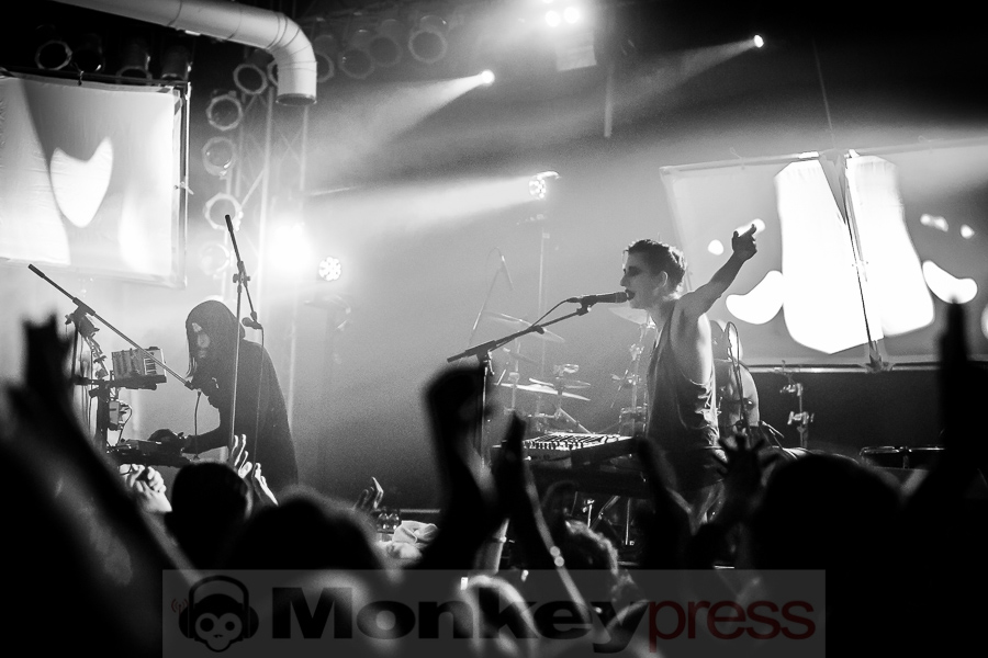 Zwischen Kirmesleuchtspielen und Parkplatzsuche vor Ort fragt sich sicher ein mancher, ob nach einer so langen Abwesenheit die Essigfabrik als Location heute überhaupt so sehr voll werden wird, immerhin galten IAMX bislang noch immer als Szene-Geheimtipp. Wie sehr wir alle unseren verrückten Lieblingssänger vermisst haben, wird jedoch sofort deutlich. So ist die Halle bereits gut eine Stunde vor dem eigentlichen Beginn richtig gut gefüllt und die Spannung auf das, was uns heute nach einer gefühlten Ewigkeit der ungewollten IAMX-Konzert-Abstinenz erwarten wird, ist deutlich spürbar. Um 20:45 Uhr hat das lange Warten dann endlich ein Ende! Ein lauter Knall ertönt, dann surren und zittern synthetische Sounds um unsere Ohren und Bilder flirren beinahe im Sekundentakt über die aufgebauten Leinwände. Unsere Euphorie ist kaum noch zu bändigen und so überschlägt sich der Jubel regelrecht, als Chris, wie so oft in schwarz gehüllt, die Bretter betritt, die für jeden heute die Welt bedeuten. „Hallo meine Freunde“, begrüßt der sympathische Brite seine Anhänger, die sich für ihr Idol zum Teil mit Glitzerbemalung und Federbehang ganz schön in Schale geworfen haben. „Kinder und Sterne küssen und verlieren sich…“. Schon bei den anfänglichen, kindlichen Gesängen von I Come With Knives sind wir sofort verliebt und verlieren uns im Moment, lassen uns nicht nur sorgenfrei treiben, sondern flippen mit Chris und seiner Gespielin Janine Gezang, die sich an den Synthesizern verausgabt, ohne Hemmungen aus. Mit dem nachfolgenden Kracher The Alternative steigert man sich stimmungstechnisch um ein Weiteres und schnell legt der schlaksige Künstler seine düstere Jacke ab, denn die Stimmung steigt hier proportional zur Umgebungstemperatur. Zwischen weiteren Krachern wie Volatile Times, dem wunderbaren Tear Garden, bei dem Chris und Janine die Felle der Livedrums mit allen Kräften bearbeiten und dafür gefeiert werden, Spit It Out oder Bernadette, bei dem Rosenblätter über die Leinwände rieseln und man einen genialen Wechsel zwischen innerer Ruhe und krachender Klang- und Emotionskunst vorfindet, gesellen sich hier und da natürlich auch ausgewählte Stücke des aktuellen Werks Metanoia dazu. Dem Protagonisten und seinen Bühnenmitstreitern ist deutlich anzumerken, wie viel Freude sie gerade auch bei neuen Stücken wie Happiness, Aphrodisiac, bei dem Chris sich immer wieder an den Bühnenrand vortastet, um den Kontakt zu seinen treuen Fans zu suchen, oder dem Klassiker Your Joy Is My Low, bei dem er sogar über sich hinaus wächst und sich von der Menge auf Händen tragen lässt. Was für eine Wahnsinnsstimmung! So ausgelassen hat man schon lange nicht mehr mit IAMX gefeiert, so nah waren sich Fans und Künstler wirklich selten! Und obwohl wir den absoluten Höhepunkt, der einem beim bloßen Dran-Denken schon wieder die feinen Härchen in die Höhe schießen lässt, gerade bereits erlebt haben, lassen sich IAMX noch für ein paar Zugaben zurück auf die Bühne locken. Viele werden sich den 04. November 2015 nun noch dicker und fetter im Kalender markieren, denn es ist ein Tag, an den wir alle gerne zurück denken und sagen werden: „Was für ein emotionsgeladener, genialer Abend!“