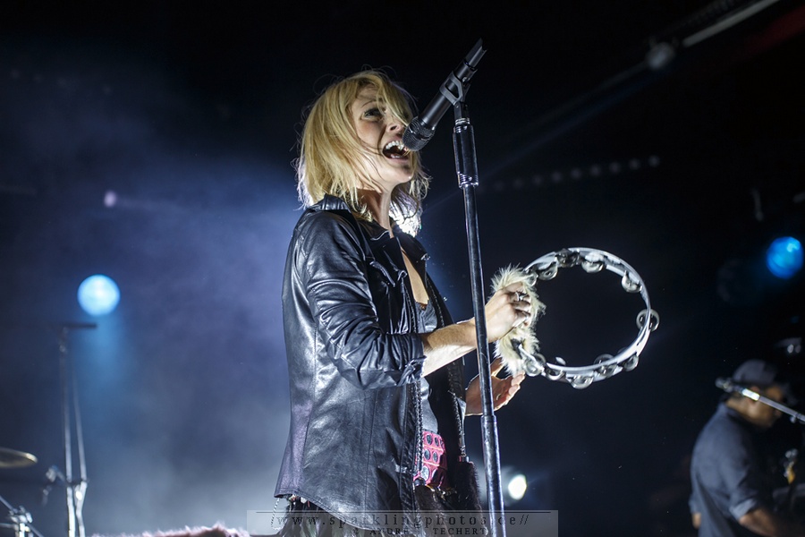 den übrigen Instrumenten, sodass der Rest der Band etwas untergeht, sobald es etwas energischer bearbeitet wird. Dennoch macht das kurze spannungsreiche Set Lust auf mehr und so findet der in diesem Jahr von Lasvegasrecords veröffentlichte Longplayer Spanish Disco in der Umbaupause reißenden Absatz in digitaler Form sowie Vinyl und CD.Dann wird es dunkel und ein Spoken-Word Intro lockt Metric [GALLERY, leider waren nur 3 Bilder seitens der Band erlaubt] -zunächst mit in der Beleuchtung unheimlich anmutenden Tierkopfmasken (Hase, Maus, Pferd und Regenbogeneinhorn) und Taschenlampen ausgerüstet- auf die Bühne. Nach kurzem Innehalten fallen die Masken und Emily wird mit einem leuchtenden pfauenfedernähnlichen Rückenschmuck ausgestattet und intoniert sogleich Lie Lie Lie von der aktuellen Platte Pagans in Vegas. Es geht weiter mit Youth Without Youth vom 2012er Release Synthetica, ehe sie mit Help I’m Alive einen Klassiker von Fantasies aus dem Jahr 2009 spielen. Das Publikum nimmt die Animationen der Band dankbar an: Es wird gehüpft, geklatscht und mitgesungen, was wiederum die Band noch mehr anheizt. Als nächste Songs haben sie Too Bad, So Sad und Cascades von der aktuellen CD in die Liste gepackt, sowie Black Sheep vom Scott Pilgrim vs. The Rest Of The World OST (2010). Mit den gefeierten Satellite Mind, Collect Call und Gold Guns Girls machen sie wieder einen Abstecher in die Fantasies-Ära, bis The Shade aus diesem Jahr den Abschluss den Mainsets bildet. Sehr begeistert aufgenommen wird zudem Emilys kurzer deutschsprachiger a-capella dargebotener Song, den sie vor Gold Guns Girls einschiebt.