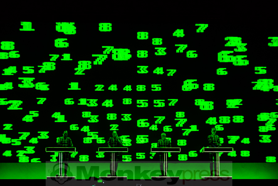 Um genau 20.10 Uhr ertönten die ersten Takte des Intros und die 3D-Beamer projizierten das Kraftwerk Logo auf den schwarzen Vorhang, bis die Spannung schier unendlich stieg. Zehn Minuten später war es dann endlich soweit. Noch hinter verschlossenem Vorhang ertönte die bereits sehnsüchtig erwartete Roboterstimme, die verkündete: „Meine Damen und Herren, Ladies and Gentleman. Heute Abend: die Mensch Maschine. Kraftwerk.“ Der Vorhang lüftete sich und machte den Blick frei auf die vier Herren, die hinter ihren illuminierten Pulten standen: Ralf Hütter (Keyboards und Vocals), Fritz Hilpert (Audio Operator), Henning Schmitz (Audio Operator) und Falk Grieffenhagen (Video Operator). Beim ersten Stück Nummern flogen dem Zuschauer die Zahlen in der Videoprojektion ins Gesicht, der Bass drückte in den Magen und schon war man gefangen in der phantastischen Welt von Kraftwerk.