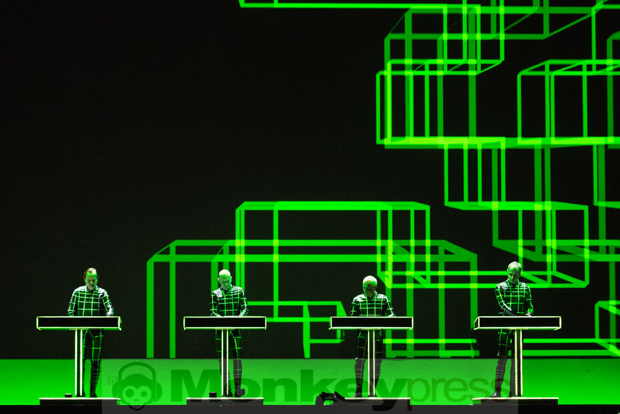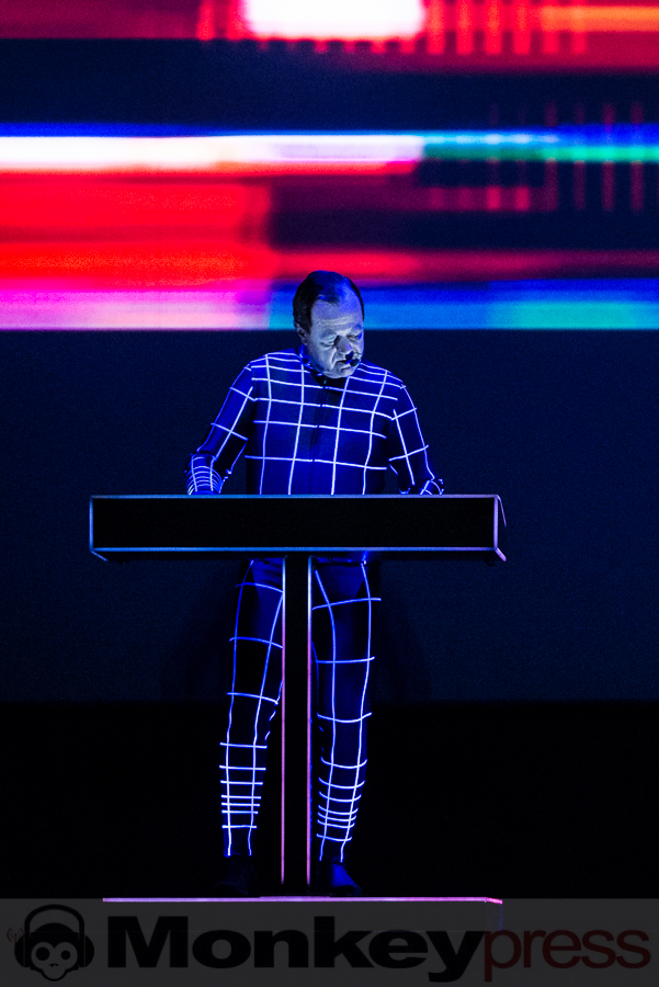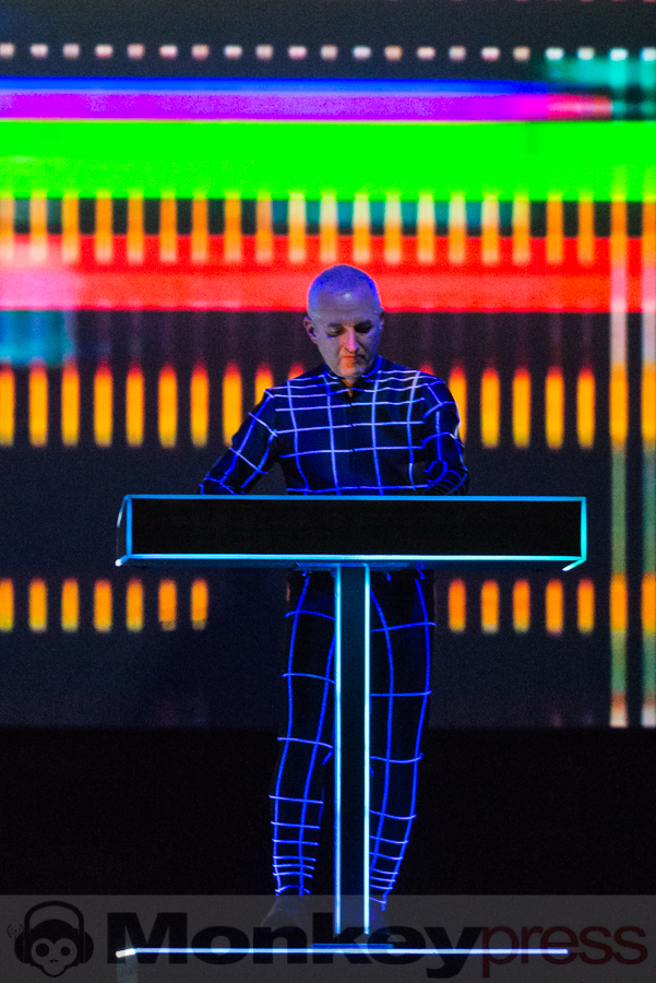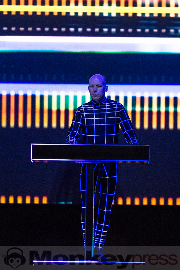 Fließend war dann der Übergang zu Computerwelt, das visionäre, fast prophetische Lied aus 1982, in dem bereits die Zukunft vorausgesagt wurde, in der in jedem Eigenheim Computer regieren und die Menschheit ausspioniert werden (siehe NSA Skandal). Computerliebe brachte anschließend mit seinen trancigen Beats das mit 3D-Brillen bewaffnete Publikum endgültig zum Tanzen. Bei Die Mensch-Maschine des gleichnamigen Albums von 1978 kam der Vocodergesang Hütters erstmals voll zur Geltung, während grafische Elemente auf der Leinwand umher flitzten und die Zuschauer fast zu erschlagen drohten. Gottlob nur rein virtuell. Eine sehr interessante 12″ Version des Stückes Spacelab mit retro-futuristischem Video verzückte nicht nur Science Fiction Liebhaber, sondern auch die Fans, die sich im Takt der Musik bewegten.