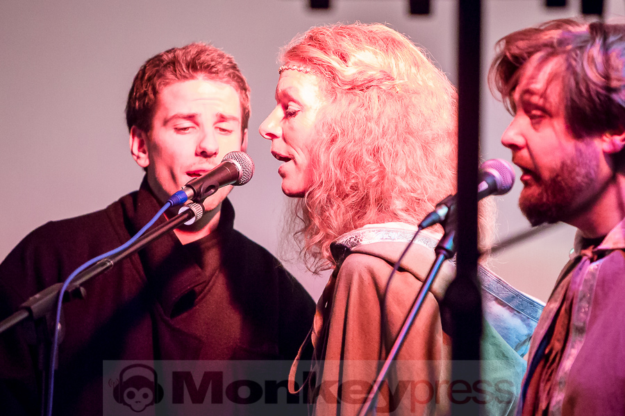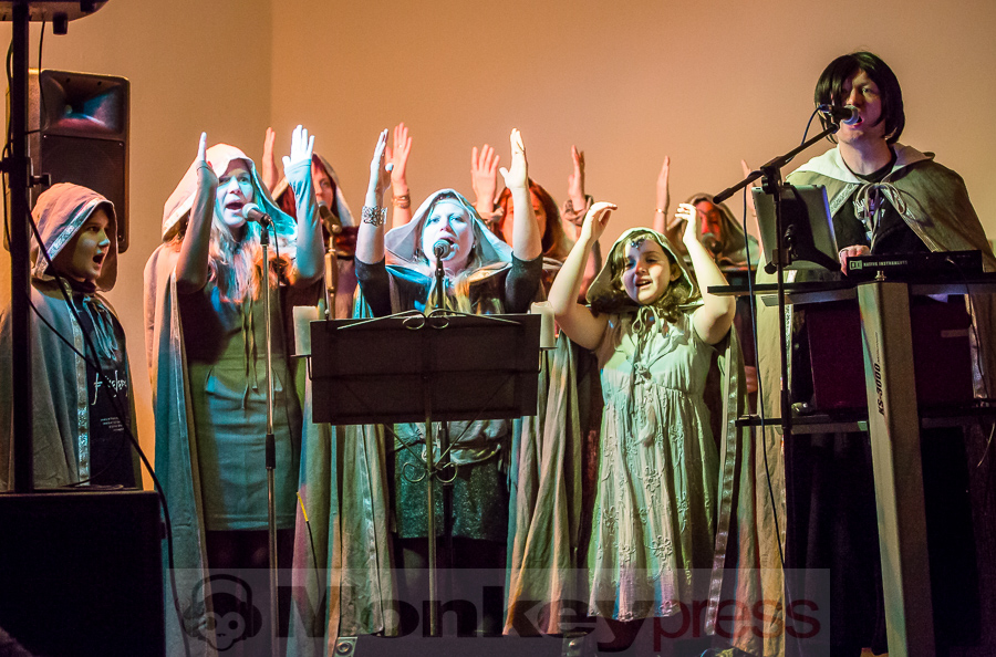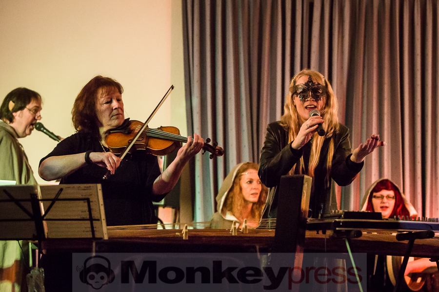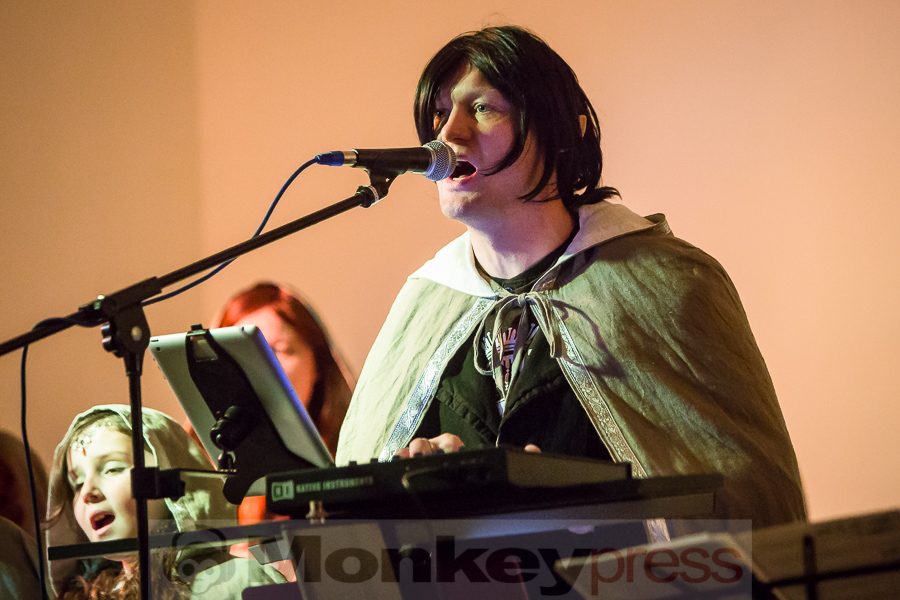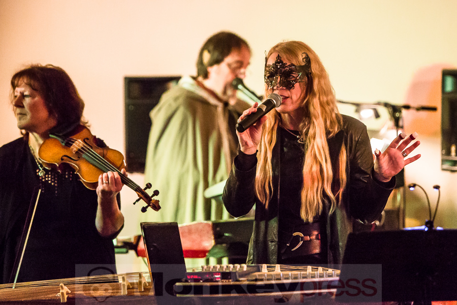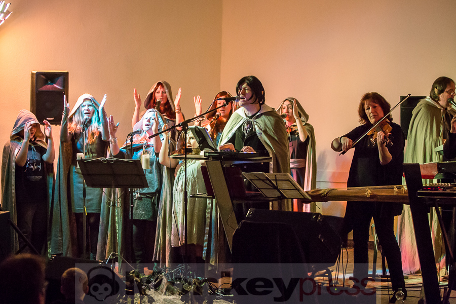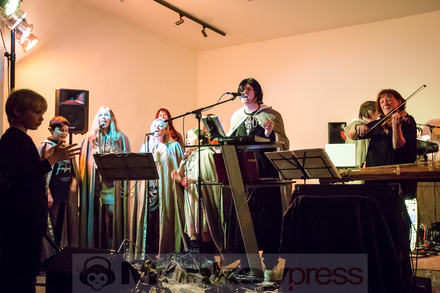 Nachdem der kleine Konzertsaal im Walbecker Schloss am Samstagabend ob des großen Andrangs beinahe geplatzt wäre, kann man sich am Spätnachmittag des darauffolgenden Sonntags wieder frei bewegen. Wie zum heimeligen Geschichtenlauschen am Lagerfeuer sitzen die gespannten und zum Teil selbst als Elben oder Zwerge verkleideten Gäste auf Stühlen oder im Schneidersitz auf dem Boden und erfreuen sich der musikalischen Vielfalt, die uns hier durch Faelend während des rund 2-stündigen Auftrittes geboten wird. Und das ist wirklich einiges! Ob sphärisch und tragend, elektronisch voranschreitend, mal düster, mal hell, oft getragen von Sängerin Monika Stienens klarer und angenehmer Stimme, die an vielen Stellen von einem Chor aus großen und kleinen, jüngeren und älteren Elben unterstützt wird. Ganz besonders fasziniert sind wir -neben den großartigen und abwechslungsreichen Stücken von Faelend, die zwar zumeist auf Englisch gesungen werden, aber immer wieder Wörter der elbischen Kunstsprache (Sindarin) enthalten und dadurch umso geheimnisvoller wirken- von der Darbietung des jungen Dorions (Jason Kehnen, 12 Jahre), der sich mit seiner glockenhellen Stimme bei Pippin’s Song in unsere Herzen singt. Das was Faelend, die in der Originalbesetzung aus den Geschwistern Monika und Frank Stienen sowie dem aus Okinawa stammenden Ben Paderna bestehen, hier heute auf die Beine stellen, ist wirklich groß. Nach nur wenigen Stücken sind wir vollkommen in die mysteriöse Welt Tolkiens eingetaucht, sehen uns vor dem inneren Auge im zauberhaften Mittelerde stehen, hören uns mit den anderen singen, jubeln, wiegen uns im Takt, tanzen, um an anderer Stelle inne zu halten und aufmerksam zu lauschen. So hätte das Finale, das nach knapp zwei Stunden und einer kleinen Pause erreicht ist, mit dem Song Children of Ilúvatar nicht bezeichnender und besser sein können. Monika, die den elbischen Namen Anóriel trägt, ruft uns alle zu sich und gemeinsam lauthals singen wir nicht nur, sondern machen uns gemeinsam auf den Weg in eine andere, eine bessere Welt, in die wir uns bei diesem letzten gemeinsamen Marsch hineindenken. Gänsehaut pur!