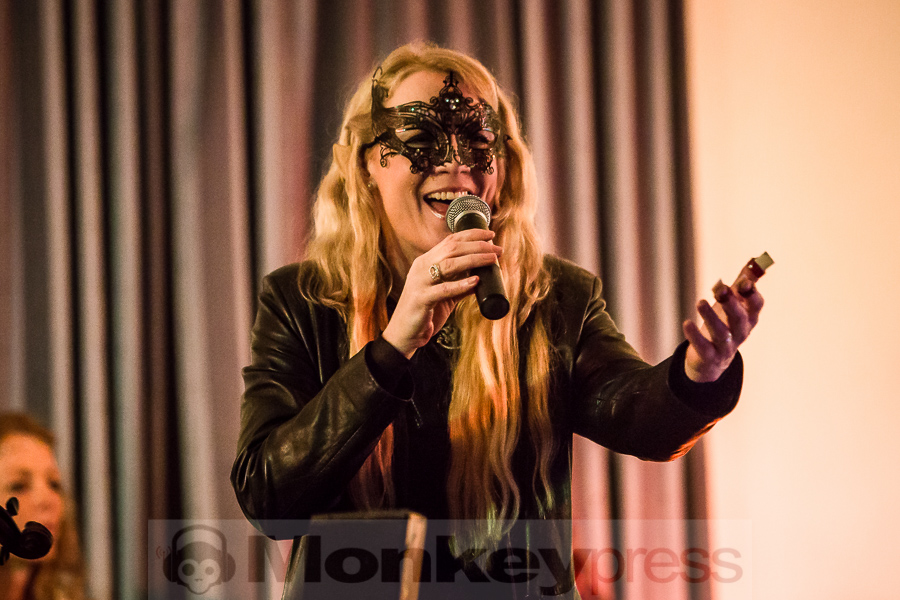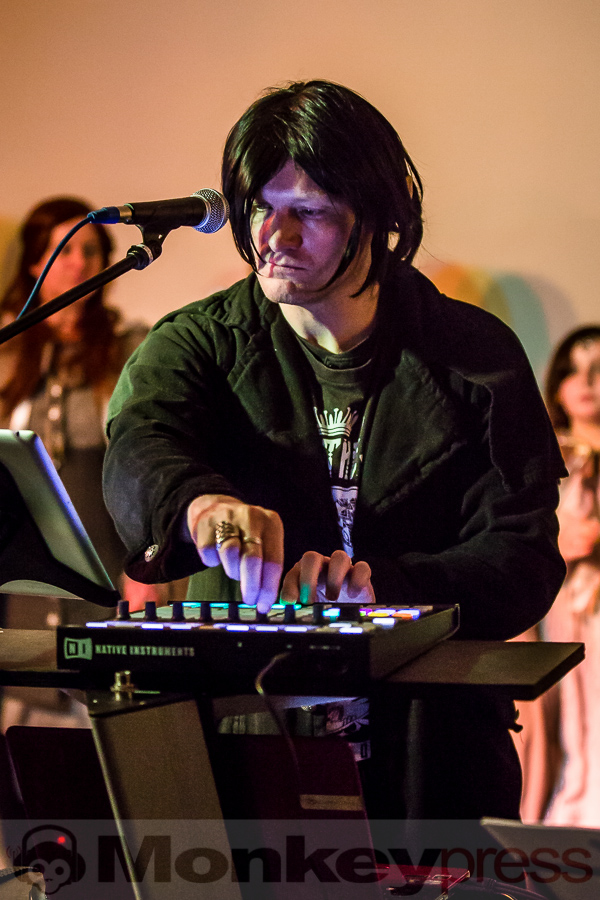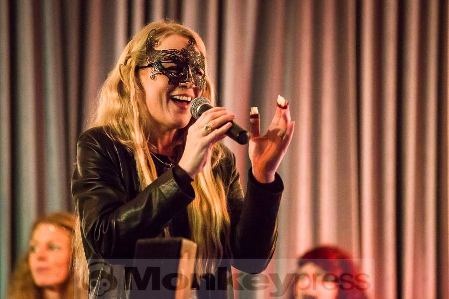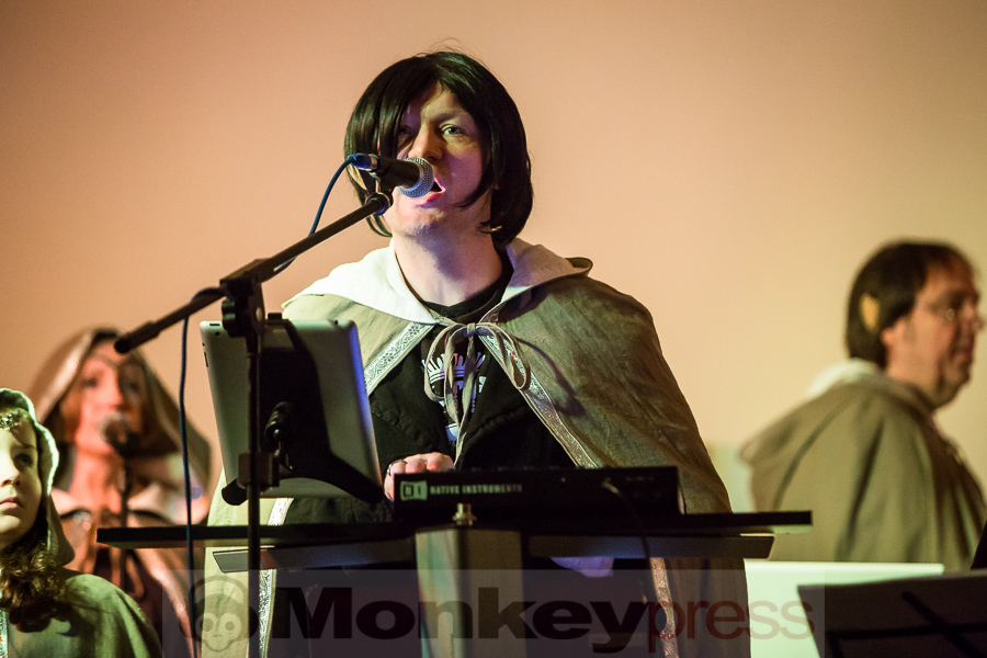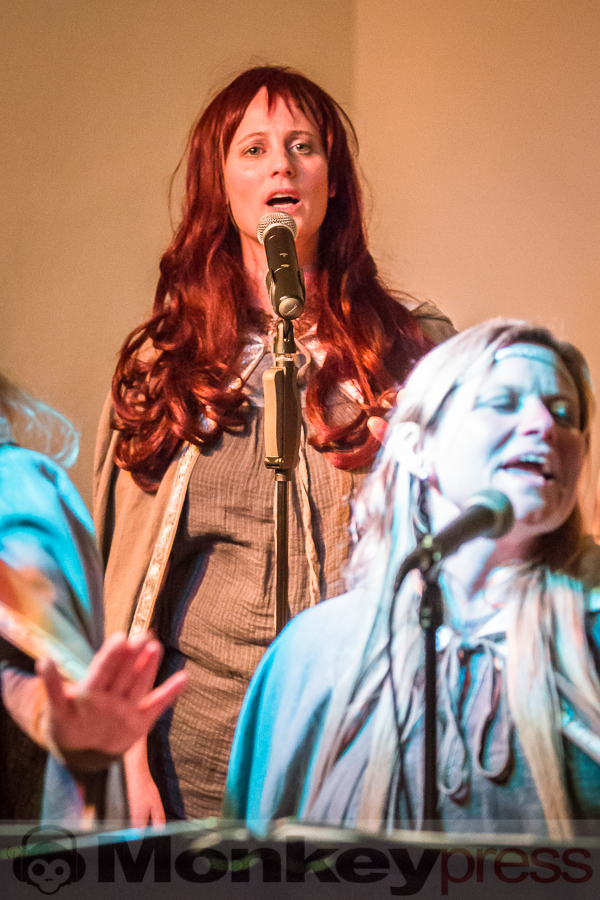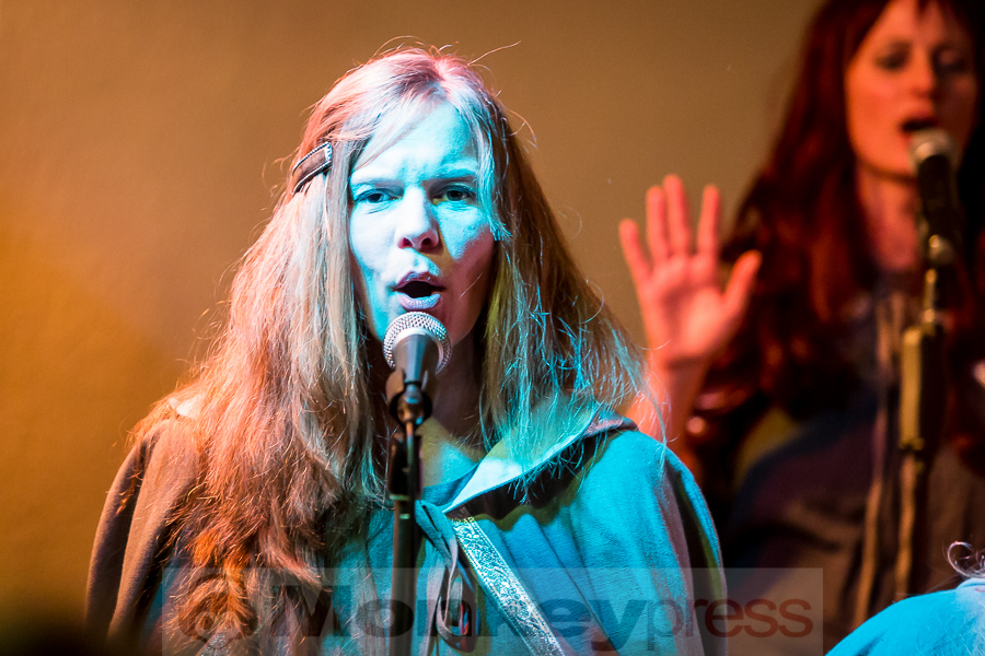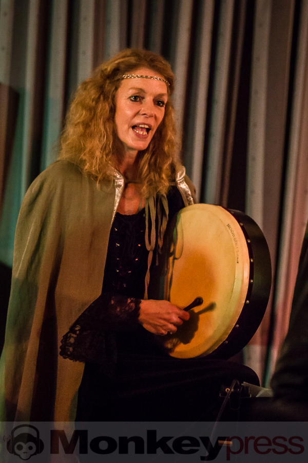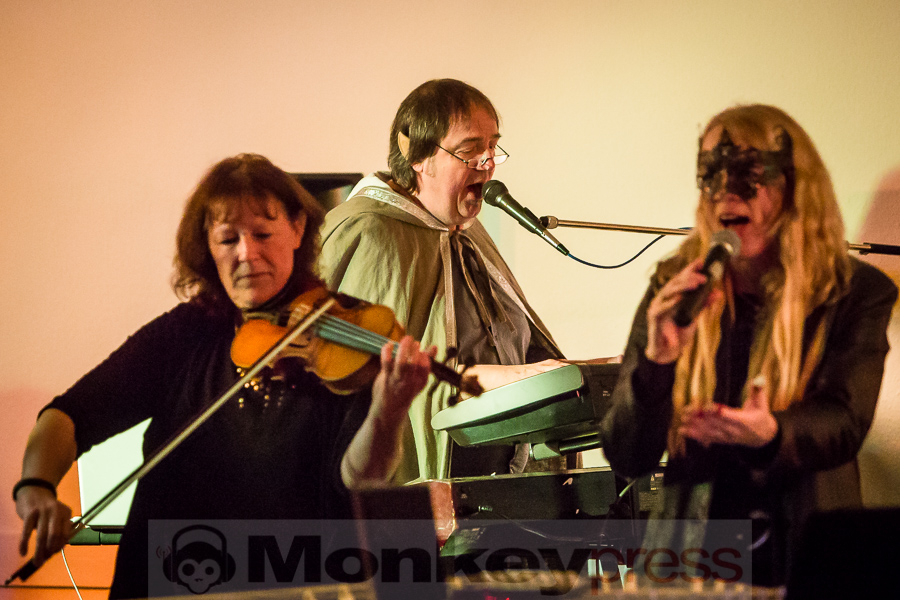 Nachdem der kleine Konzertsaal im Walbecker Schloss am Samstagabend ob des großen Andrangs beinahe geplatzt wäre, kann man sich am Spätnachmittag des darauffolgenden Sonntags wieder frei bewegen. Wie zum heimeligen Geschichtenlauschen am Lagerfeuer sitzen die gespannten und zum Teil selbst als Elben oder Zwerge verkleideten Gäste auf Stühlen oder im Schneidersitz auf dem Boden und erfreuen sich der musikalischen Vielfalt, die uns hier durch Faelend während des rund 2-stündigen Auftrittes geboten wird. Und das ist wirklich einiges! Ob sphärisch und tragend, elektronisch voranschreitend, mal düster, mal hell, oft getragen von Sängerin Monika Stienens klarer und angenehmer Stimme, die an vielen Stellen von einem Chor aus großen und kleinen, jüngeren und älteren Elben unterstützt wird. Ganz besonders fasziniert sind wir -neben den großartigen und abwechslungsreichen Stücken von Faelend, die zwar zumeist auf Englisch gesungen werden, aber immer wieder Wörter der elbischen Kunstsprache (Sindarin) enthalten und dadurch umso geheimnisvoller wirken- von der Darbietung des jungen Dorions (Jason Kehnen, 12 Jahre), der sich mit seiner glockenhellen Stimme bei Pippin’s Song in unsere Herzen singt. Das was Faelend, die in der Originalbesetzung aus den Geschwistern Monika und Frank Stienen sowie dem aus Okinawa stammenden Ben Paderna bestehen, hier heute auf die Beine stellen, ist wirklich groß. Nach nur wenigen Stücken sind wir vollkommen in die mysteriöse Welt Tolkiens eingetaucht, sehen uns vor dem inneren Auge im zauberhaften Mittelerde stehen, hören uns mit den anderen singen, jubeln, wiegen uns im Takt, tanzen, um an anderer Stelle inne zu halten und aufmerksam zu lauschen. So hätte das Finale, das nach knapp zwei Stunden und einer kleinen Pause erreicht ist, mit dem Song Children of Ilúvatar nicht bezeichnender und besser sein können. Monika, die den elbischen Namen Anóriel trägt, ruft uns alle zu sich und gemeinsam lauthals singen wir nicht nur, sondern machen uns gemeinsam auf den Weg in eine andere, eine bessere Welt, in die wir uns bei diesem letzten gemeinsamen Marsch hineindenken. Gänsehaut pur!