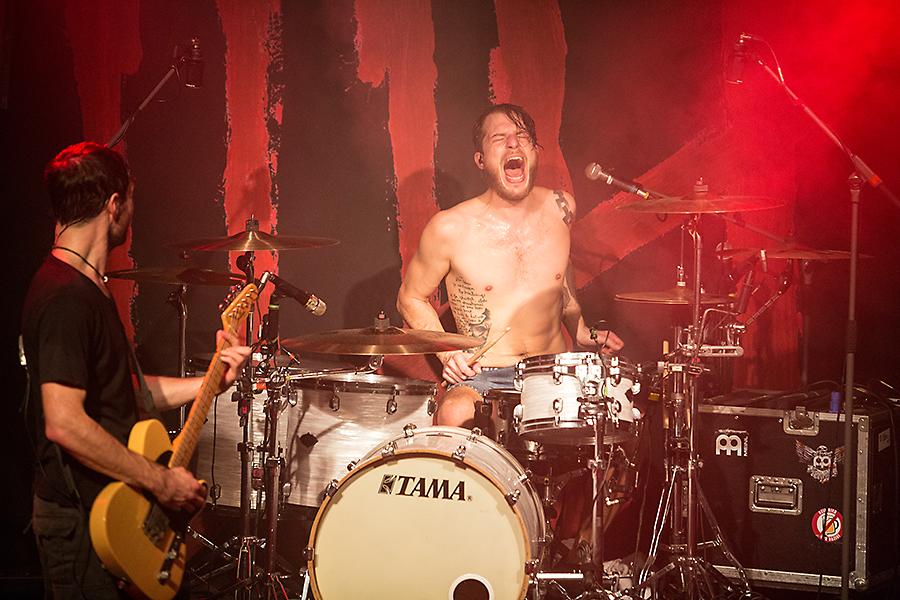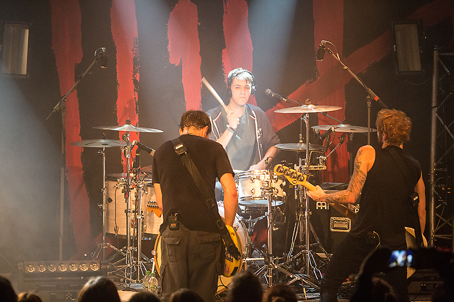 Es war beeindruckend, wie viel Stimmung bei den 300 angereisten Personen im Publikum aufkam, als die Drei über die Bühne rockten. Immer wieder sorgten Daniel Friedl (Panzer), Max Zimmer und Sebastian Hafner (Sibbi) mit Slapstick Einlagen für Unterhaltung zwischen den Stücken. Eine tolle Nummer gab es vor dem Song Silence is killing me: Panzer fragte das Publikum, ob einer oder eine dabei wäre, der/die Max am Schlagzeug vertreten könnte. Jemand, der geübt hatte und es sich zutrauen würde auf die Bühne zu kommen. Philip war der einzige, der dezent und ruhig den Arm hob. Und er hatte es drauf! Zusammen mit Sibbi und Panzer spielte er die Nummer am Schlagzeug nahezu perfekt. Auch gab es heute einen echten Running-Gag, da erst festgestellt wurde, dass einige Düsseldorfer im Dortmunder Publikum waren und dann immer wieder darauf hingewiesen wurde. Panzer, Sibbi und Max sorgten wirklich für eine „Hammer-Stimmung“. Wer hier nicht ins Schwitzen kam, war nicht wirklich anwesend. Panzer spielte auch wieder seine Nummer mitten im Publikum und trotz der Enge wurde nicht auf eine Wall Of Death verzichtet. Nach guten 1,5 Stunden gab es dann auch noch drei Zugaben. Bei der vorletzten legten alle Besucher den Arm über die Schulter des Nachbarn und dann wurde im Rhythmus gesprungen. Mit Down Down Down ging dann auch dieses Konzert der Itchys zu Ende. Bevor es allerdings raus aus dem FZW ging, wurde noch schnell der Merch-Stand geplündert.