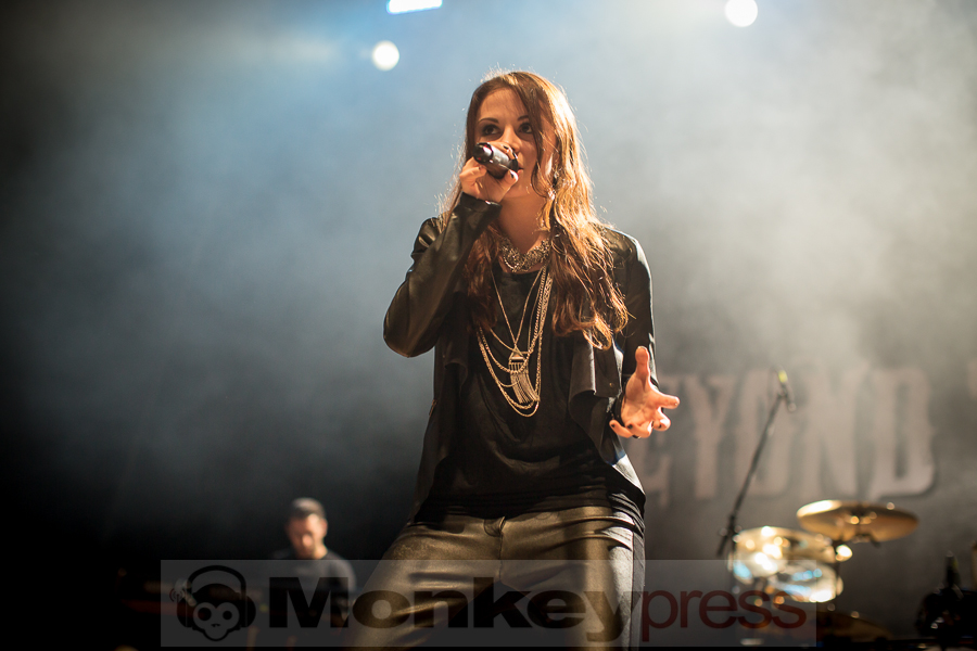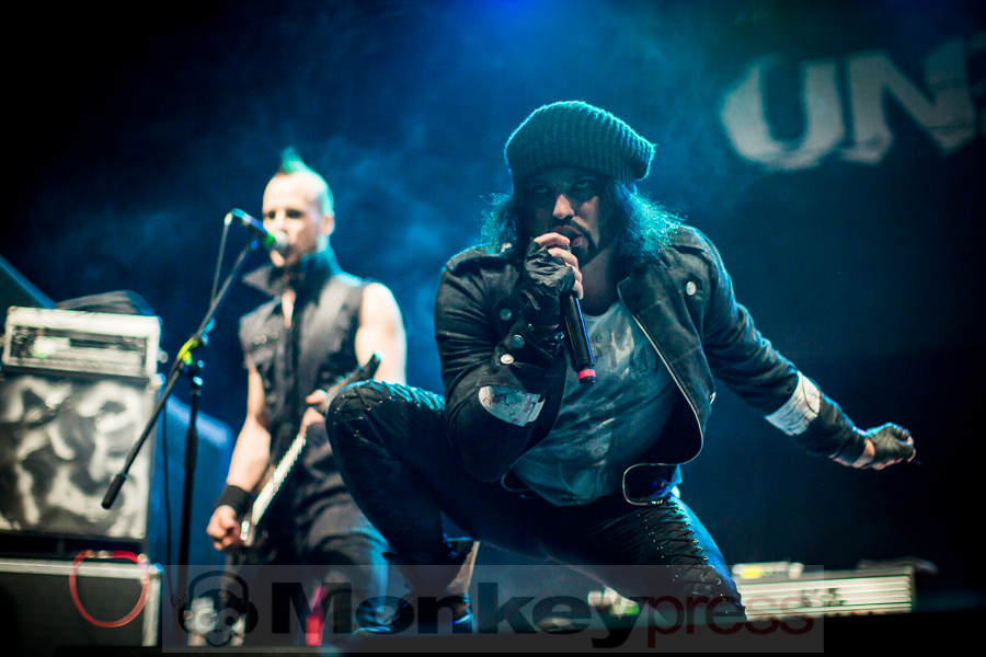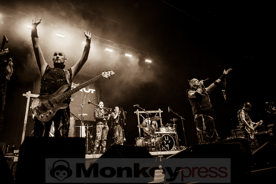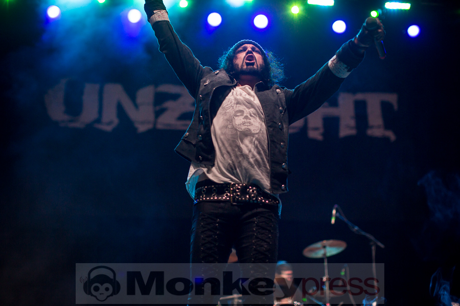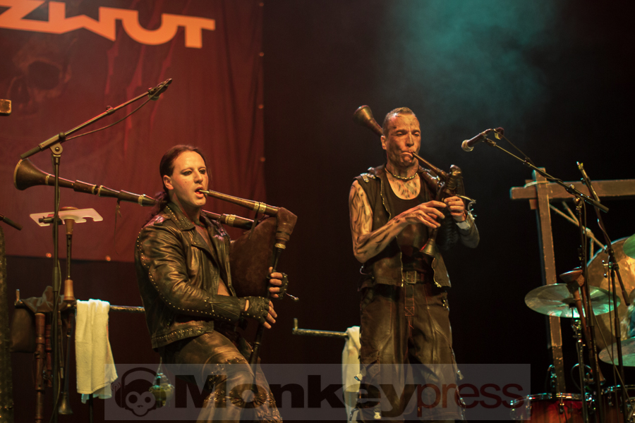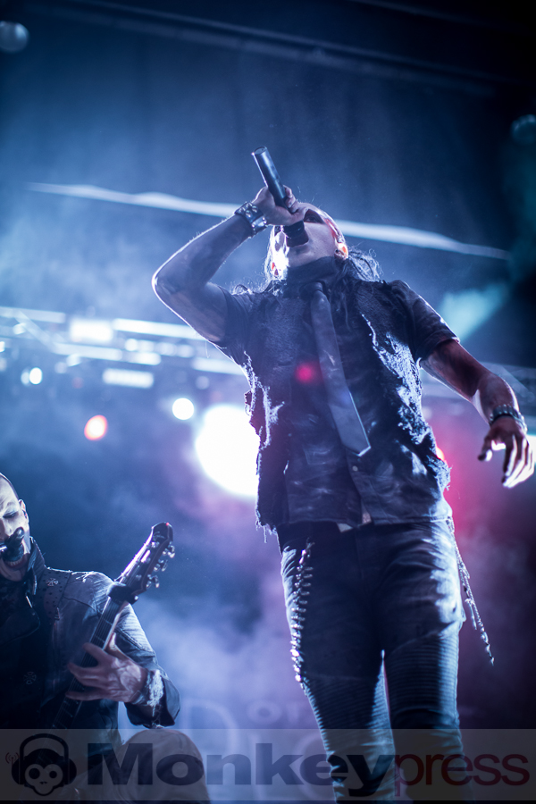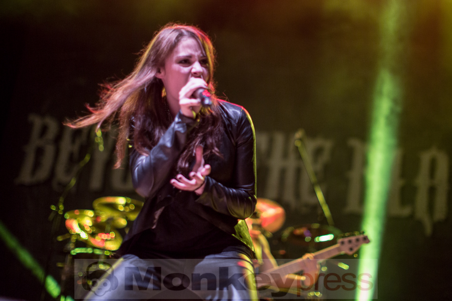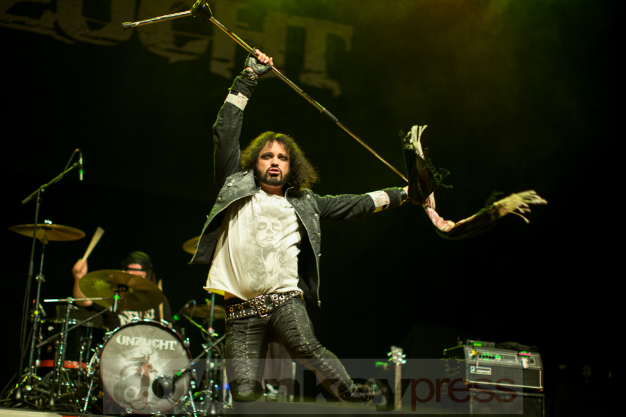 Pünktlich um 16:45 Uhr startete das diesjährige Dark Storm Festival mit Unzucht aus Hannover. Die Band existiert seit 2009 und ist stilistisch zwischen Gothic Rock und Dark Rock einzuordnen. 3 Alben sind bereits erschienen, zuletzt Venus Luzifer (2014). Bereits im Laufe der ersten Songs füllte sich der große Saal. Mit deutschen Texten und hartem Gitarrensound gelang es Unzucht sogleich das Publikum in die richtige Stimmung zu versetzen. Langeweile blieb aus. In den 30 Minuten durften die Gäste gleich richtiges Festivalfeeling erleben. Die Mittelalter-Industrial-Band Tanzwut stand als nächstes auf dem Programm. Die Band existiert seit 1999 und ist hervorgegangen aus Corvus Corax, wobei Tanzwut jedoch mehr elektronische Elemente in ihre Musik einfließen lassen. Auffällig sind dennoch die Verwendung von mittelalterlichen Instrumenten wie Dudelsäcken, Marktsackpfeifen und Schalmeien. Letztes Jahr erschien ihr 9. Album Freitag der 13.. Tanzwut hat hierzulande eine große Fangemeinde und somit war es für die Band auch nicht schwer, die Besucher in ihren Bann zu ziehen. Der Saal war voll. Begeistert riss das Publikum die Arme hoch und winkte im Takt. Zu den deutschen Texten konnten die Besucher auch gut Mitsingen. Abwechslungsreiche Melodien untermalten den Auftritt. Nun wurde es Zeit für den ersten Auftritt im kleinen Saal. Die Hamburger Band Eisfabrik bewegt sich stilistisch zwischen Dark Electro und Future Pop. 2 Alben sind dieses Jahr erschienen: When Winter Comes und Eisplanet. In den vergangenen Wochen waren sie als Support von Project Pitchfork auf Tour. Die Bandmitglieder und Keyboards waren weiß gekleidet. Doch die Stimmung während der Show war alles andere als eisig. Zahlreiche Gäste wollten Eisfabrik sehen und die durchweg tanzbaren Songs begeisterten die Fans. Eine halbe Stunde später trat die Mannheimer Symphonic-Metal-Band Beyond The Black auf die große Bühne. Die Band konnte mit ihrem im Februar 2015 erschienenen Debütalbum Songs of Love and Death bereits beachtliche Erfolge erzielen. Vor einigen Monaten folgte eine Clubtour sowie Auftritte bei diversen Festivals. Neugierig versammelten sich nun viele Gäste vor der Bühne. Harter Metal-Sound gepaart mit der kraftvollen Stimme von Sängerin Jennifer Haben sorgten für ein gewaltiges Klangerlebnis.