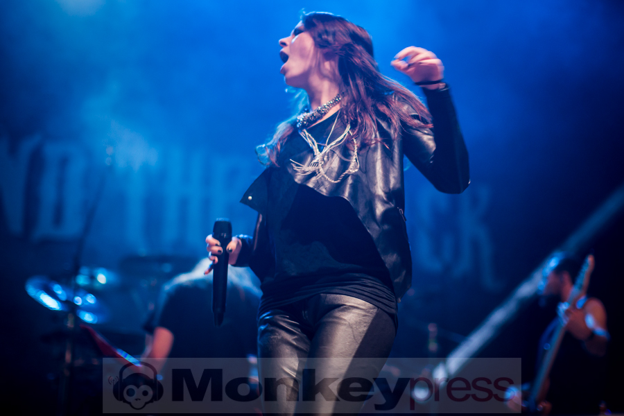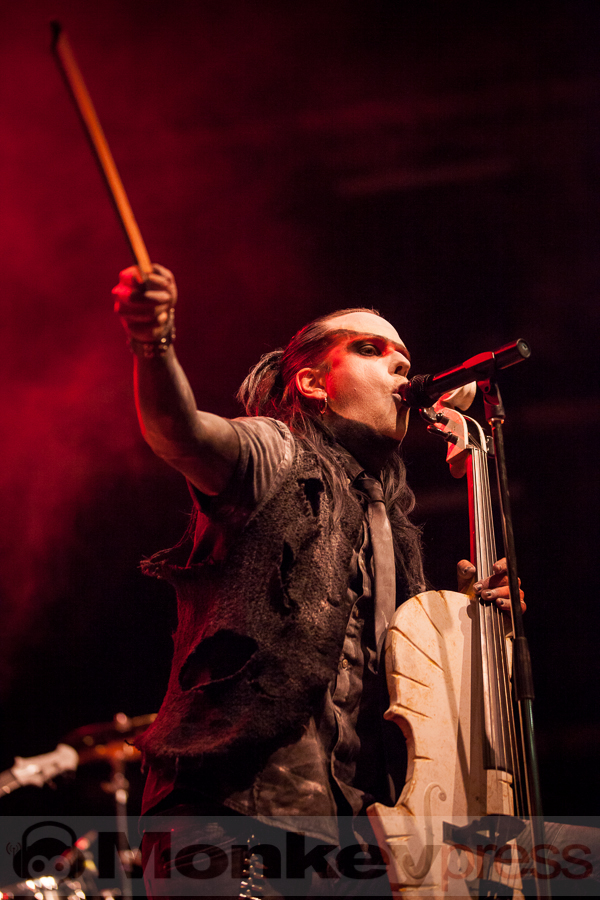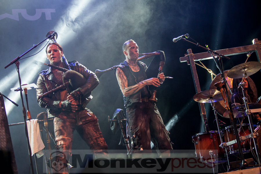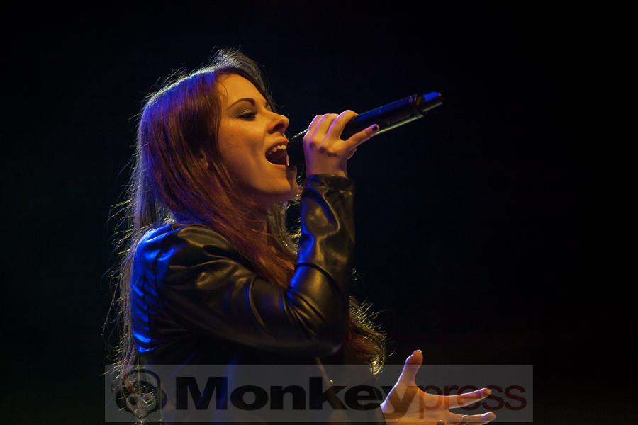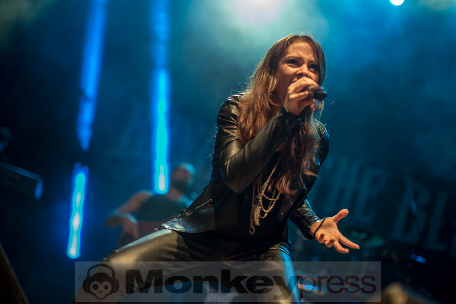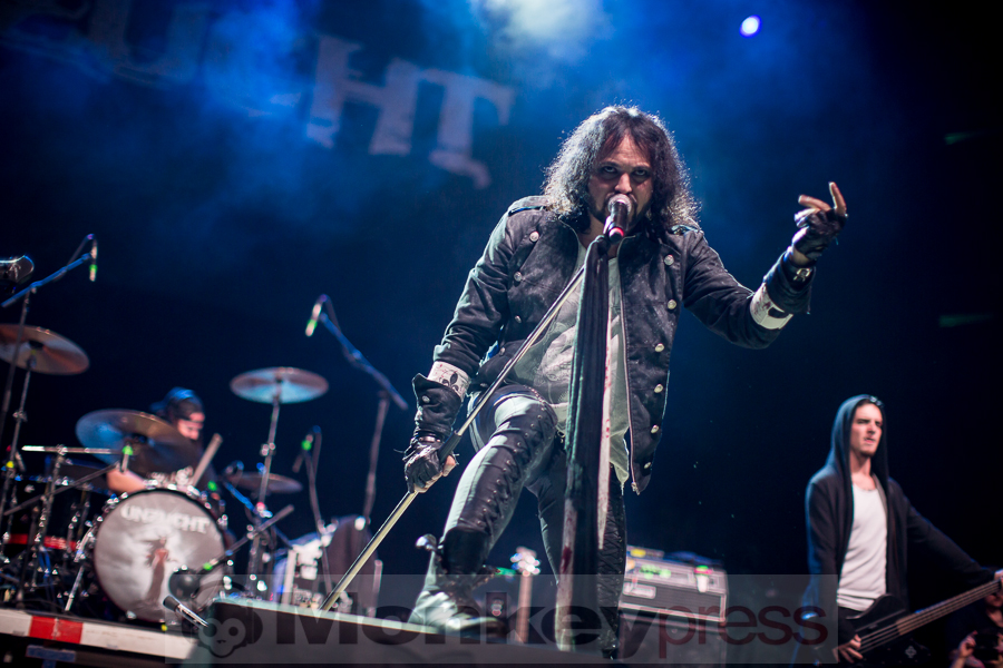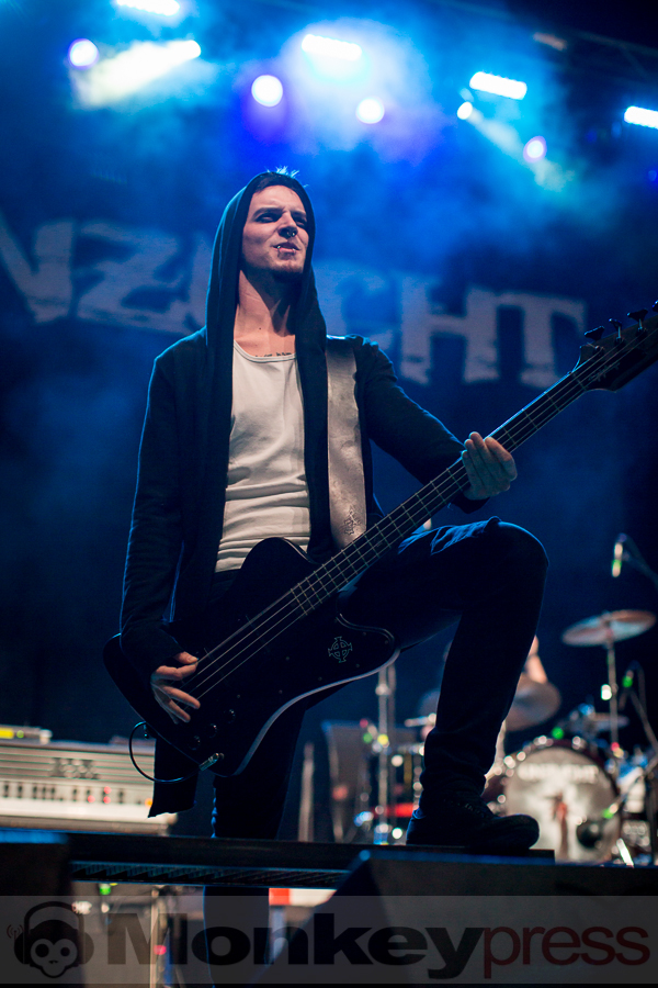 Pünktlich um 16:45 Uhr startete das diesjährige Dark Storm Festival mit Unzucht aus Hannover. Die Band existiert seit 2009 und ist stilistisch zwischen Gothic Rock und Dark Rock einzuordnen. 3 Alben sind bereits erschienen, zuletzt Venus Luzifer (2014). Bereits im Laufe der ersten Songs füllte sich der große Saal. Mit deutschen Texten und hartem Gitarrensound gelang es Unzucht sogleich das Publikum in die richtige Stimmung zu versetzen. Langeweile blieb aus. In den 30 Minuten durften die Gäste gleich richtiges Festivalfeeling erleben. Die Mittelalter-Industrial-Band Tanzwut stand als nächstes auf dem Programm. Die Band existiert seit 1999 und ist hervorgegangen aus Corvus Corax, wobei Tanzwut jedoch mehr elektronische Elemente in ihre Musik einfließen lassen. Auffällig sind dennoch die Verwendung von mittelalterlichen Instrumenten wie Dudelsäcken, Marktsackpfeifen und Schalmeien. Letztes Jahr erschien ihr 9. Album Freitag der 13.. Tanzwut hat hierzulande eine große Fangemeinde und somit war es für die Band auch nicht schwer, die Besucher in ihren Bann zu ziehen. Der Saal war voll. Begeistert riss das Publikum die Arme hoch und winkte im Takt. Zu den deutschen Texten konnten die Besucher auch gut Mitsingen. Abwechslungsreiche Melodien untermalten den Auftritt. Nun wurde es Zeit für den ersten Auftritt im kleinen Saal. Die Hamburger Band Eisfabrik bewegt sich stilistisch zwischen Dark Electro und Future Pop. 2 Alben sind dieses Jahr erschienen: When Winter Comes und Eisplanet. In den vergangenen Wochen waren sie als Support von Project Pitchfork auf Tour. Die Bandmitglieder und Keyboards waren weiß gekleidet. Doch die Stimmung während der Show war alles andere als eisig. Zahlreiche Gäste wollten Eisfabrik sehen und die durchweg tanzbaren Songs begeisterten die Fans. Eine halbe Stunde später trat die Mannheimer Symphonic-Metal-Band Beyond The Black auf die große Bühne. Die Band konnte mit ihrem im Februar 2015 erschienenen Debütalbum Songs of Love and Death bereits beachtliche Erfolge erzielen. Vor einigen Monaten folgte eine Clubtour sowie Auftritte bei diversen Festivals. Neugierig versammelten sich nun viele Gäste vor der Bühne. Harter Metal-Sound gepaart mit der kraftvollen Stimme von Sängerin Jennifer Haben sorgten für ein gewaltiges Klangerlebnis.