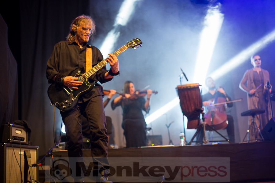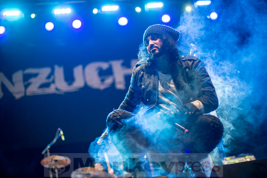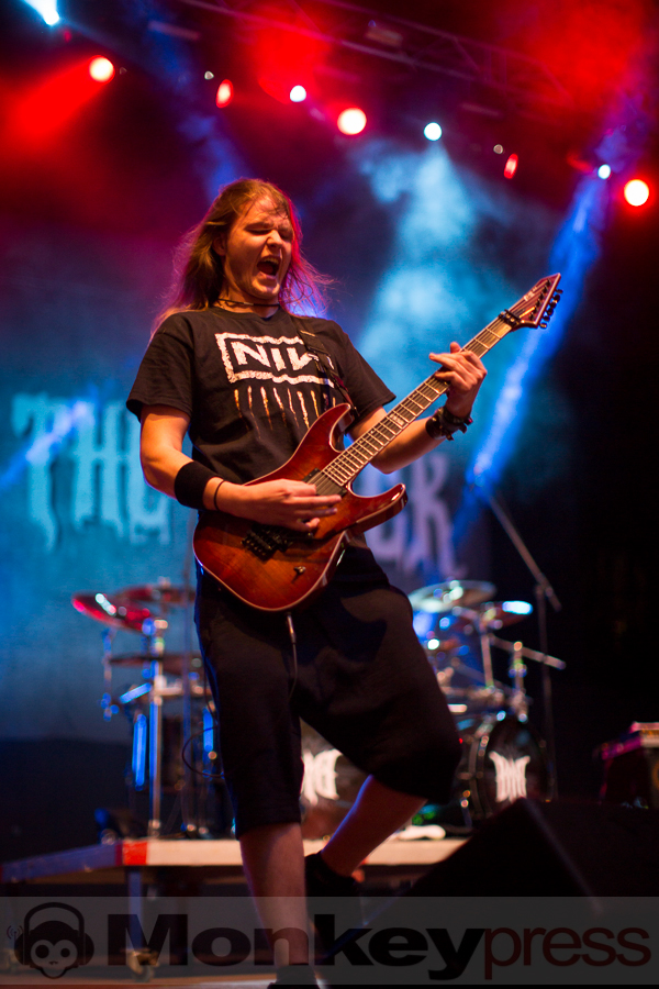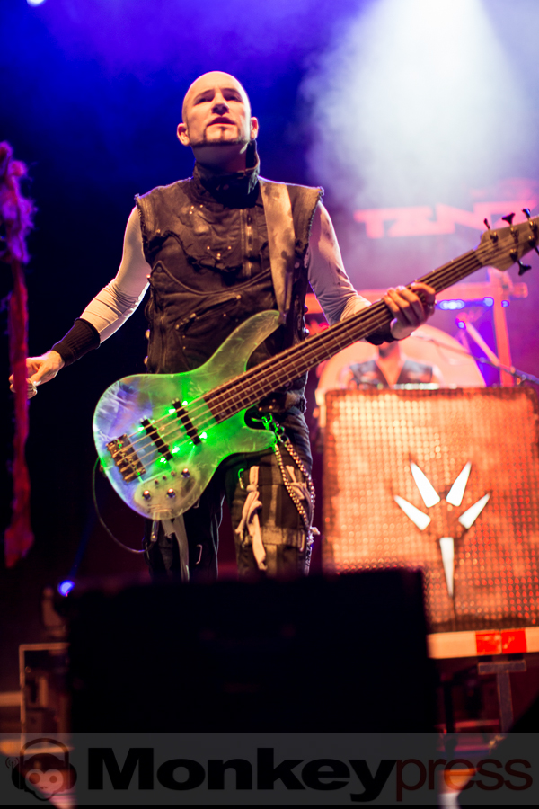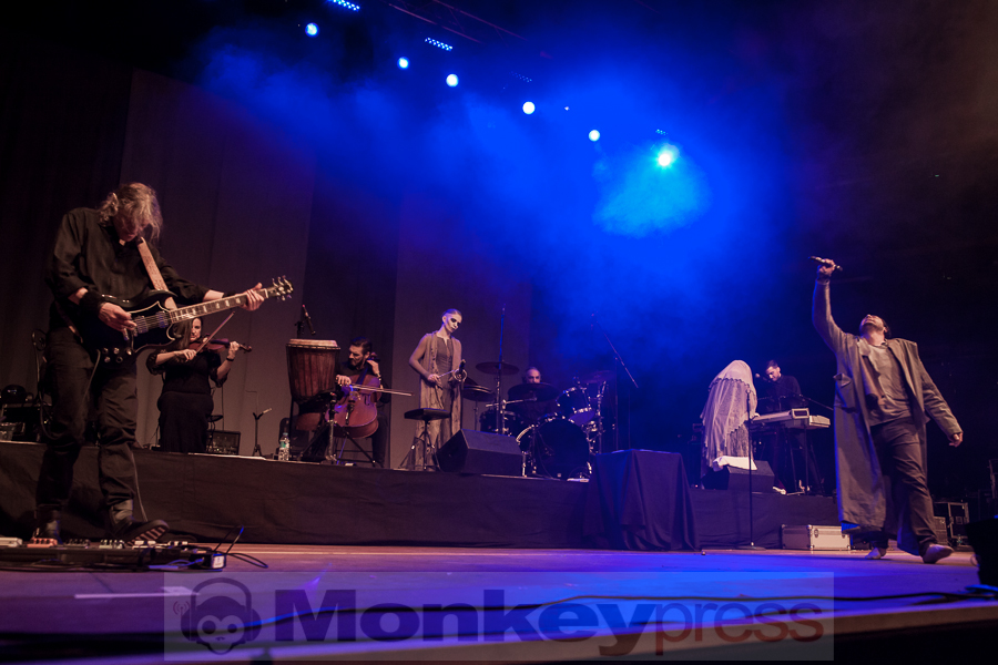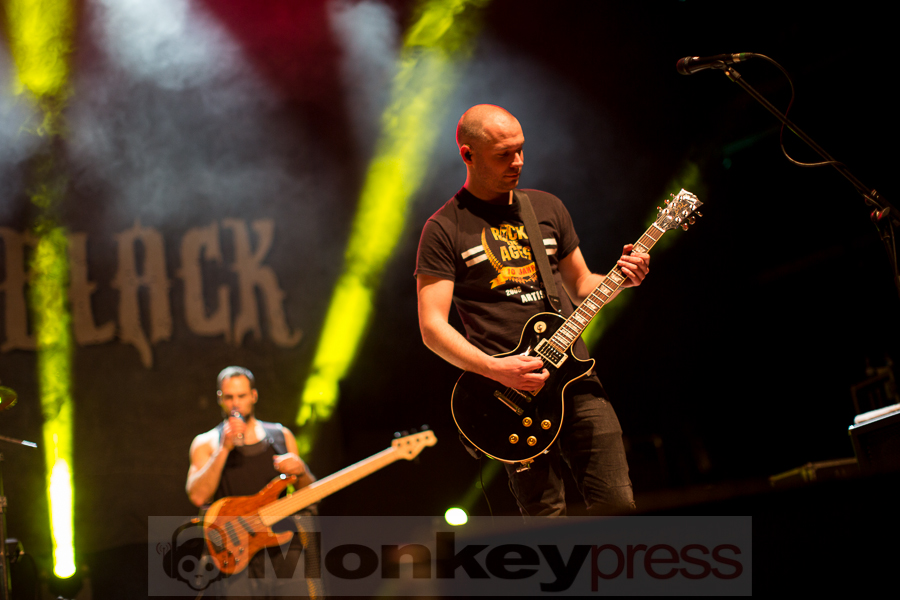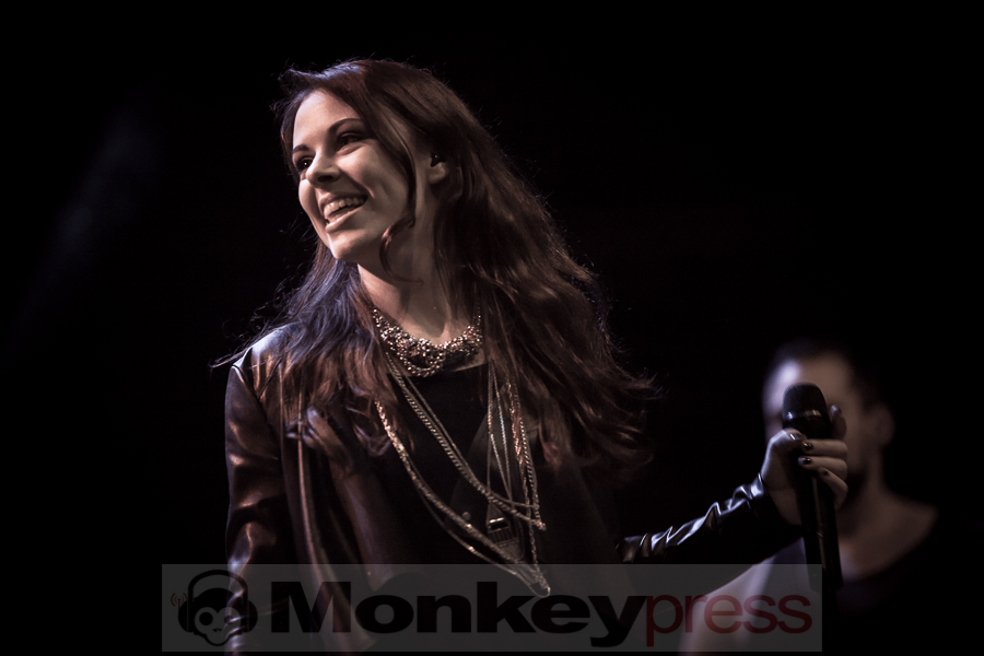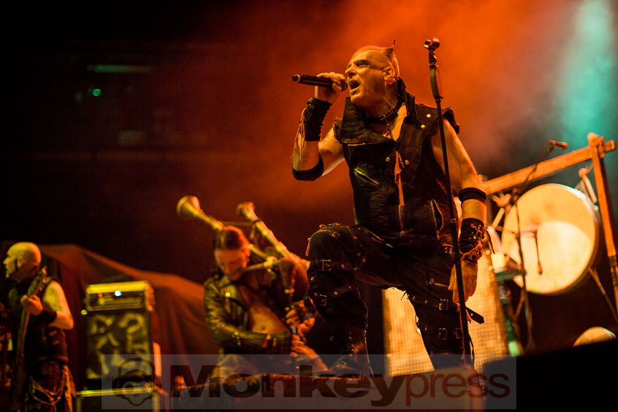 Pünktlich um 16:45 Uhr startete das diesjährige Dark Storm Festival mit Unzucht aus Hannover. Die Band existiert seit 2009 und ist stilistisch zwischen Gothic Rock und Dark Rock einzuordnen. 3 Alben sind bereits erschienen, zuletzt Venus Luzifer (2014). Bereits im Laufe der ersten Songs füllte sich der große Saal. Mit deutschen Texten und hartem Gitarrensound gelang es Unzucht sogleich das Publikum in die richtige Stimmung zu versetzen. Langeweile blieb aus. In den 30 Minuten durften die Gäste gleich richtiges Festivalfeeling erleben. Die Mittelalter-Industrial-Band Tanzwut stand als nächstes auf dem Programm. Die Band existiert seit 1999 und ist hervorgegangen aus Corvus Corax, wobei Tanzwut jedoch mehr elektronische Elemente in ihre Musik einfließen lassen. Auffällig sind dennoch die Verwendung von mittelalterlichen Instrumenten wie Dudelsäcken, Marktsackpfeifen und Schalmeien. Letztes Jahr erschien ihr 9. Album Freitag der 13.. Tanzwut hat hierzulande eine große Fangemeinde und somit war es für die Band auch nicht schwer, die Besucher in ihren Bann zu ziehen. Der Saal war voll. Begeistert riss das Publikum die Arme hoch und winkte im Takt. Zu den deutschen Texten konnten die Besucher auch gut Mitsingen. Abwechslungsreiche Melodien untermalten den Auftritt. Nun wurde es Zeit für den ersten Auftritt im kleinen Saal. Die Hamburger Band Eisfabrik bewegt sich stilistisch zwischen Dark Electro und Future Pop. 2 Alben sind dieses Jahr erschienen: When Winter Comes und Eisplanet. In den vergangenen Wochen waren sie als Support von Project Pitchfork auf Tour. Die Bandmitglieder und Keyboards waren weiß gekleidet. Doch die Stimmung während der Show war alles andere als eisig. Zahlreiche Gäste wollten Eisfabrik sehen und die durchweg tanzbaren Songs begeisterten die Fans. Eine halbe Stunde später trat die Mannheimer Symphonic-Metal-Band Beyond The Black auf die große Bühne. Die Band konnte mit ihrem im Februar 2015 erschienenen Debütalbum Songs of Love and Death bereits beachtliche Erfolge erzielen. Vor einigen Monaten folgte eine Clubtour sowie Auftritte bei diversen Festivals. Neugierig versammelten sich nun viele Gäste vor der Bühne. Harter Metal-Sound gepaart mit der kraftvollen Stimme von Sängerin Jennifer Haben sorgten für ein gewaltiges Klangerlebnis.