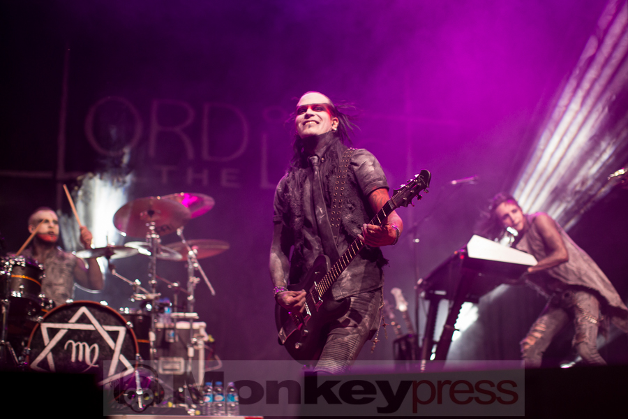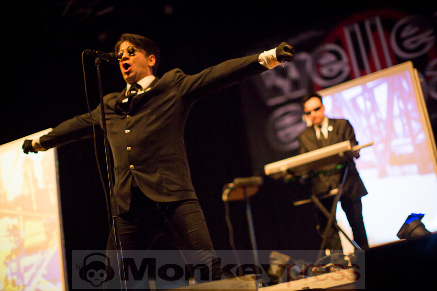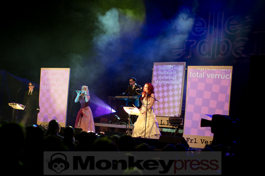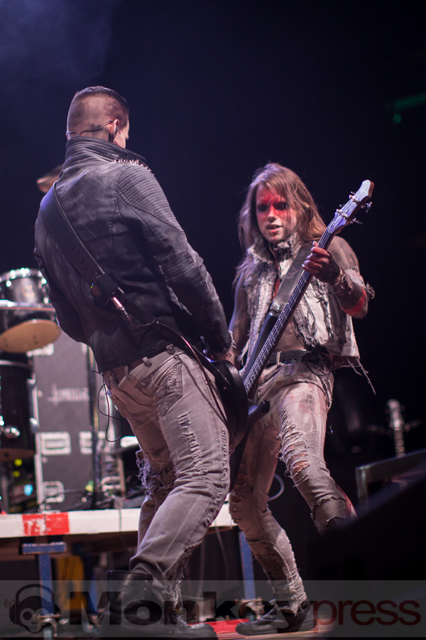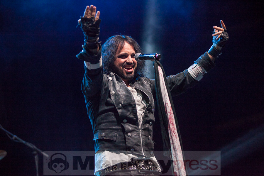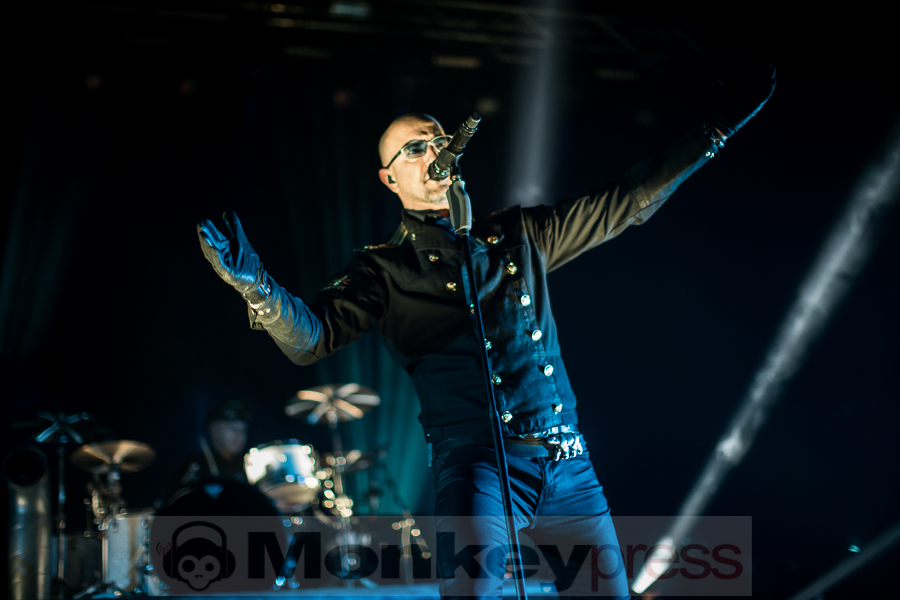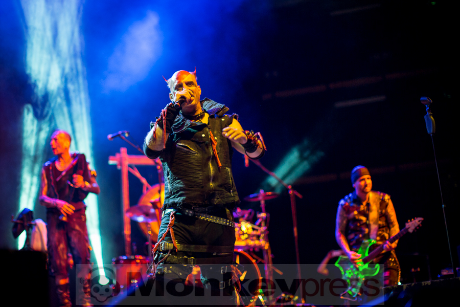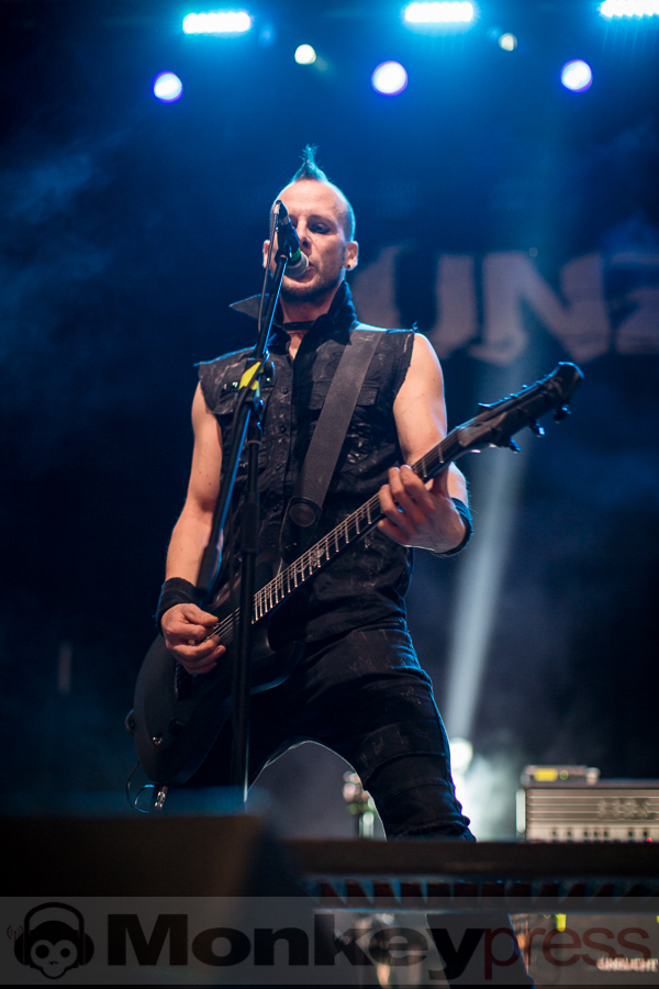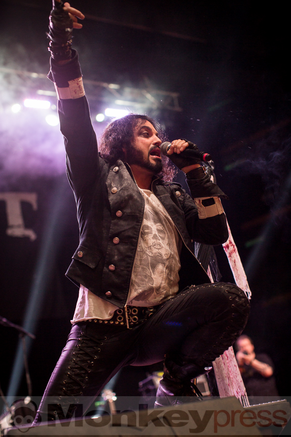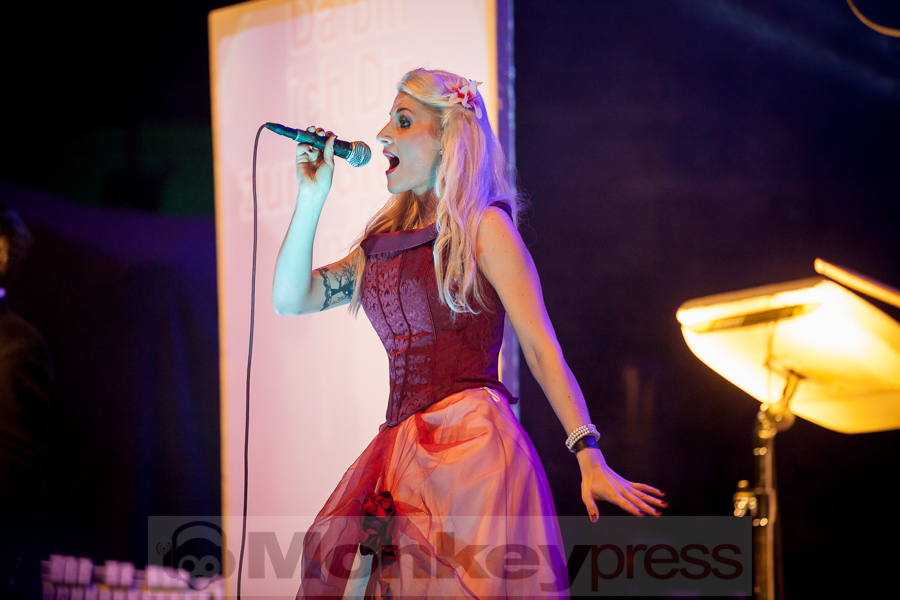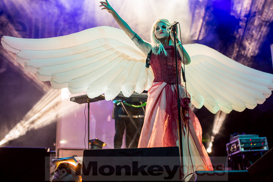 Im kleinen Saal blieb es anschließend elektronisch. Noisuf-X war nun an der Reihe. Das Rhythm ’n’ Noise Projekt ist ein Nebenprojekt des X-Fusion Kopfes Jan L. 2005 erschien das erste Album Antipode, im letzten Jahr erschien das bereits 7. Album Invasion. Die Bühne war nun in Nebel gehüllt und im Hintergrund gab es eine Videoleinwand. Die Tracks von Noisuf-X waren durchgängig tanzbare Instrumentalstücke. Genau das Richtige für Fans experimenteller Musik, die sich nun dicht vor die Bühne drängten. Um 19:40 Uhr trat die Hamburger Band Lord Of The Lost auf die große Bühne. Die Band wurde 2007 von Sänger Chris Harms 2007 zunächst als Soloprojekt gegründet. Stilistisch kann Lord Of The Lost dem Dark Rock zugeordnet werden. Mit Swan Songs, einem Akustik/Klassik-Werk, veröffentlichte die Band dieses Jahr das 5. Studioalbum. Lord Of The Lost erfreuen sich weiter zunehmender Beliebtheit und so sicherten sich die vielen treuen Fans schon frühzeitig einen Platz in den vordersten Reihen. Die Bandmitglieder waren wie gewohnt bei Liveauftritten speziell geschminkt. Voller Energie legten sich die Männer von Lord Of The Lost gleich ins Zeug und präsentierten in 50 Minuten einen guten Querschnitt ihrer Songs. Gegen 19:55 Uhr trat Faderhead auf die kleine Bühne. Hinter Faderhead steckt der deutsche Musiker Sami Mark Yahya. Seit 2006 wurden zahlreiche Alben veröffentlicht, zuletzt Atoms & Emptiness (2014). Faderhead vereinigt viele Stiele, so unter anderem Aggrotech, Electro Pop und House. Live wurde Sami Mark Yahya an den Keyboards unterstützt. Wieder war Tanzen angesagt und Faderhead gaben nun alles. Mit ihren abwechslungsreichen Songs brachten sie die Fans so richtig in Fahrt. Im großen Saal folgte anschließend das Minimal-Elektro-Projekt Welle: Erdball aus Hannover. Die Band setzt vorwiegend auf deutsche Texte und verwendet u.a. elektronische Hilfsmittel wie den Commodore 64. Unlängst erschien die EP 1000 Engel, dessen Titeltrack heute auch der Eröffnungssong war. Lady Lila stand hierbei mit riesigen ausgebreiteten Engelsflügeln auf der Bühne. Weitere Ohrwürmer wie Arbeit Adelt, VW Käfer sowie Schweben, Fliegen und Fallen mit abwechselndem Gesang durch Frontmann Honey und Lady Lila folgten. Bei der Performance wurden Fahnen geschwenkt und Ballons in das begeisterte Publikum geworfen.