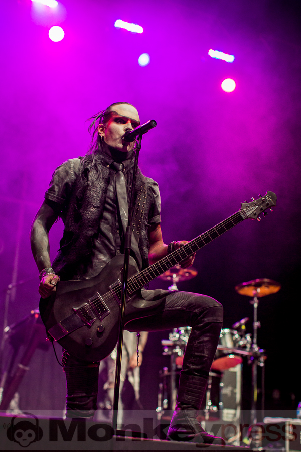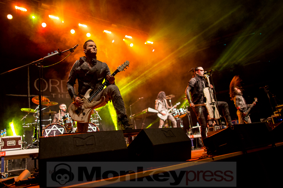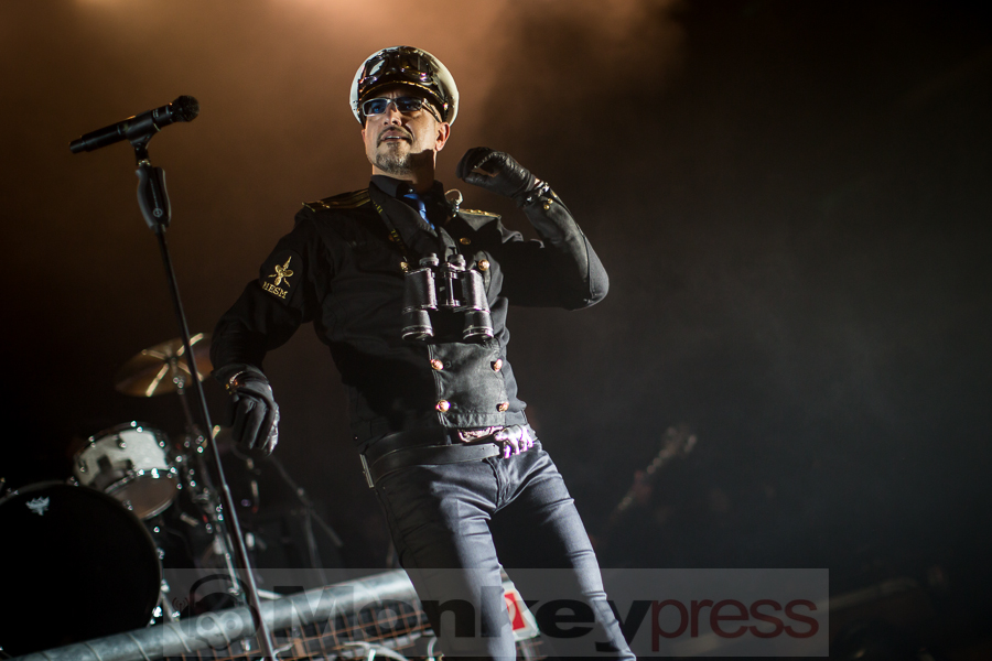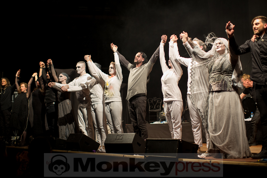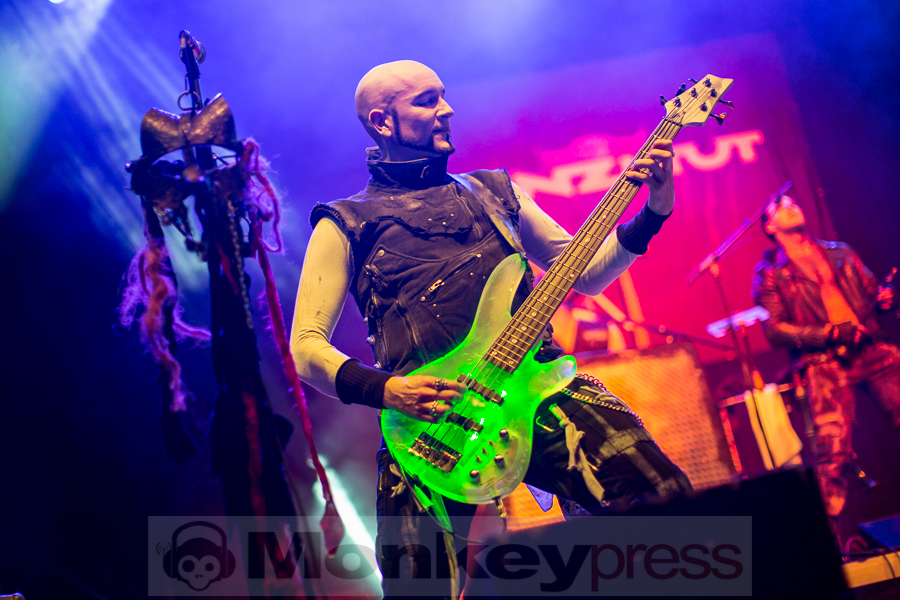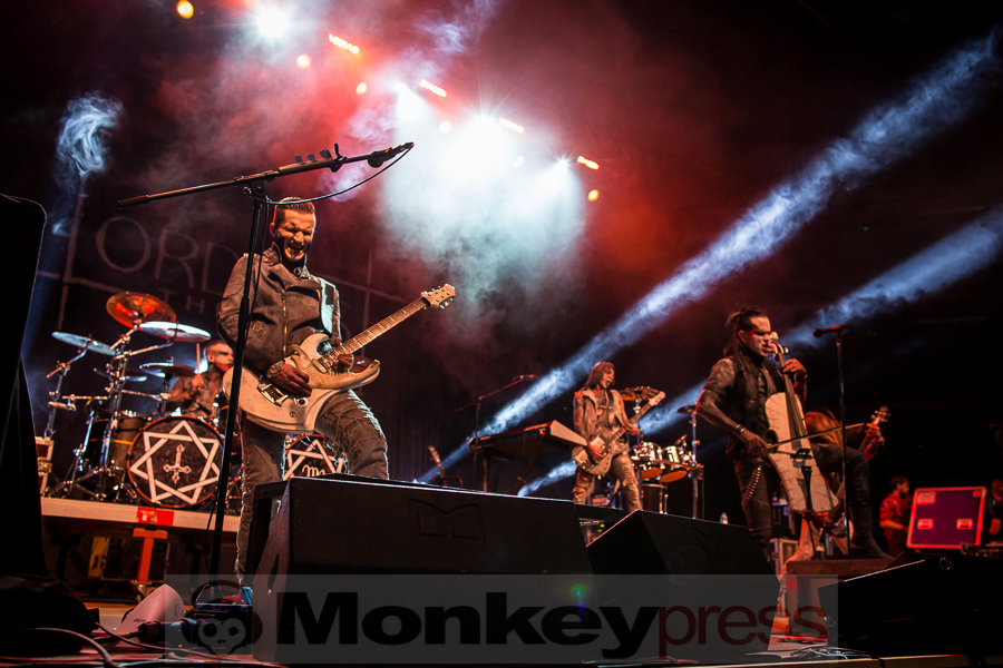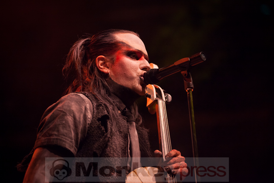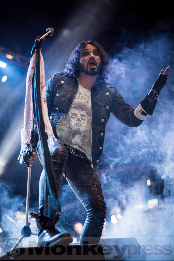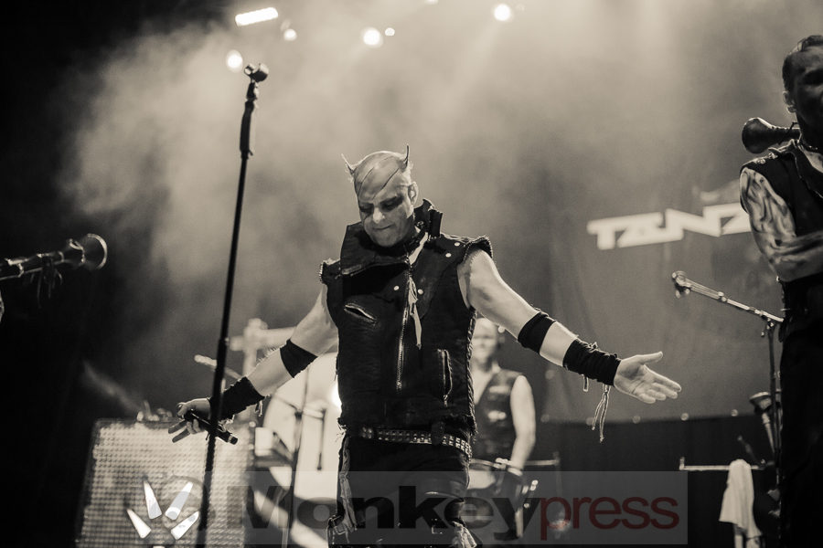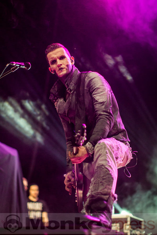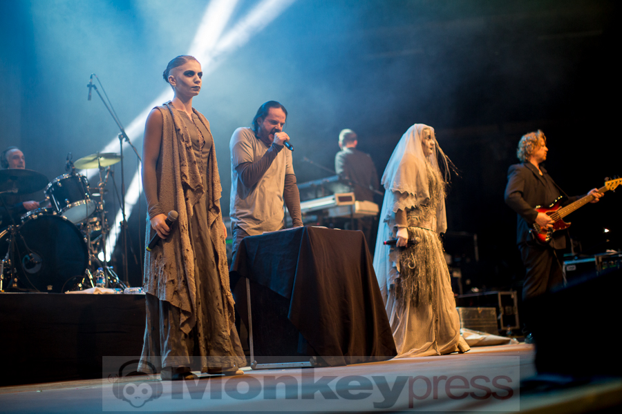 Im kleinen Saal blieb es anschließend elektronisch. Noisuf-X war nun an der Reihe. Das Rhythm ’n’ Noise Projekt ist ein Nebenprojekt des X-Fusion Kopfes Jan L. 2005 erschien das erste Album Antipode, im letzten Jahr erschien das bereits 7. Album Invasion. Die Bühne war nun in Nebel gehüllt und im Hintergrund gab es eine Videoleinwand. Die Tracks von Noisuf-X waren durchgängig tanzbare Instrumentalstücke. Genau das Richtige für Fans experimenteller Musik, die sich nun dicht vor die Bühne drängten. Um 19:40 Uhr trat die Hamburger Band Lord Of The Lost auf die große Bühne. Die Band wurde 2007 von Sänger Chris Harms 2007 zunächst als Soloprojekt gegründet. Stilistisch kann Lord Of The Lost dem Dark Rock zugeordnet werden. Mit Swan Songs, einem Akustik/Klassik-Werk, veröffentlichte die Band dieses Jahr das 5. Studioalbum. Lord Of The Lost erfreuen sich weiter zunehmender Beliebtheit und so sicherten sich die vielen treuen Fans schon frühzeitig einen Platz in den vordersten Reihen. Die Bandmitglieder waren wie gewohnt bei Liveauftritten speziell geschminkt. Voller Energie legten sich die Männer von Lord Of The Lost gleich ins Zeug und präsentierten in 50 Minuten einen guten Querschnitt ihrer Songs. Gegen 19:55 Uhr trat Faderhead auf die kleine Bühne. Hinter Faderhead steckt der deutsche Musiker Sami Mark Yahya. Seit 2006 wurden zahlreiche Alben veröffentlicht, zuletzt Atoms & Emptiness (2014). Faderhead vereinigt viele Stiele, so unter anderem Aggrotech, Electro Pop und House. Live wurde Sami Mark Yahya an den Keyboards unterstützt. Wieder war Tanzen angesagt und Faderhead gaben nun alles. Mit ihren abwechslungsreichen Songs brachten sie die Fans so richtig in Fahrt. Im großen Saal folgte anschließend das Minimal-Elektro-Projekt Welle: Erdball aus Hannover. Die Band setzt vorwiegend auf deutsche Texte und verwendet u.a. elektronische Hilfsmittel wie den Commodore 64. Unlängst erschien die EP 1000 Engel, dessen Titeltrack heute auch der Eröffnungssong war. Lady Lila stand hierbei mit riesigen ausgebreiteten Engelsflügeln auf der Bühne. Weitere Ohrwürmer wie Arbeit Adelt, VW Käfer sowie Schweben, Fliegen und Fallen mit abwechselndem Gesang durch Frontmann Honey und Lady Lila folgten. Bei der Performance wurden Fahnen geschwenkt und Ballons in das begeisterte Publikum geworfen.