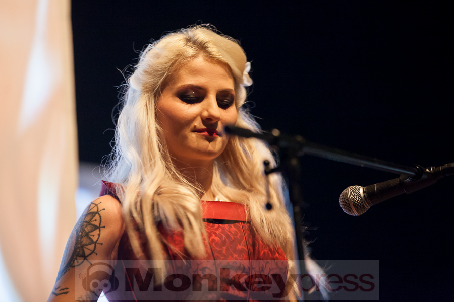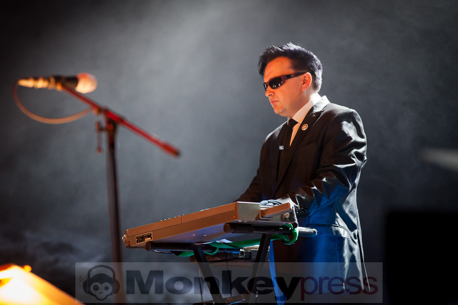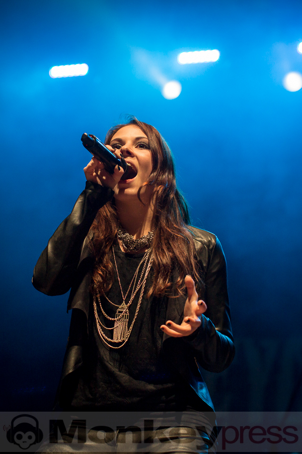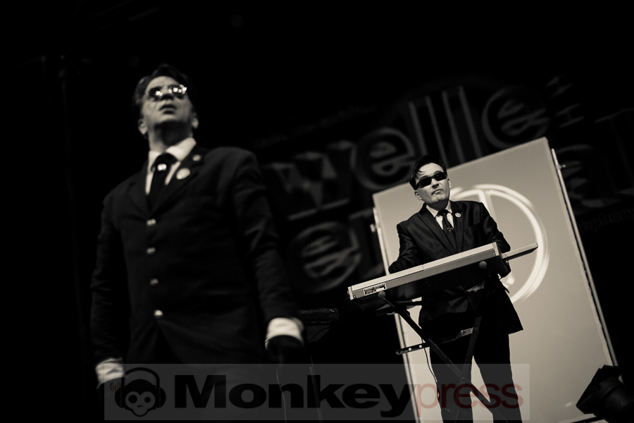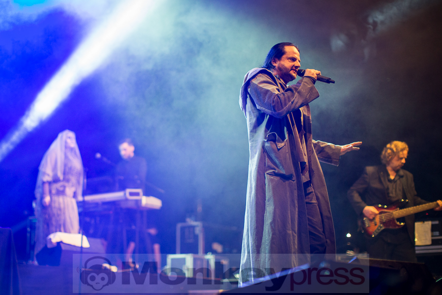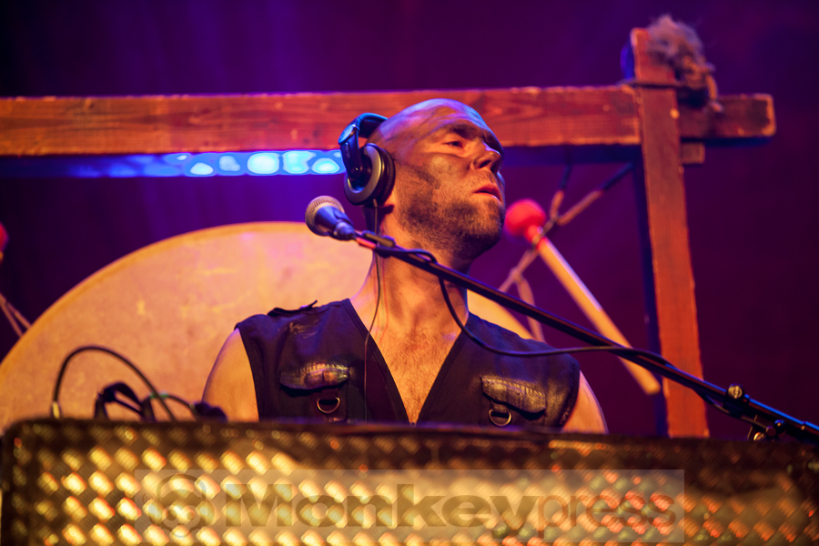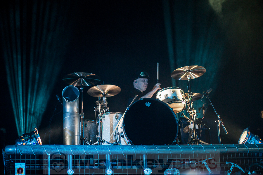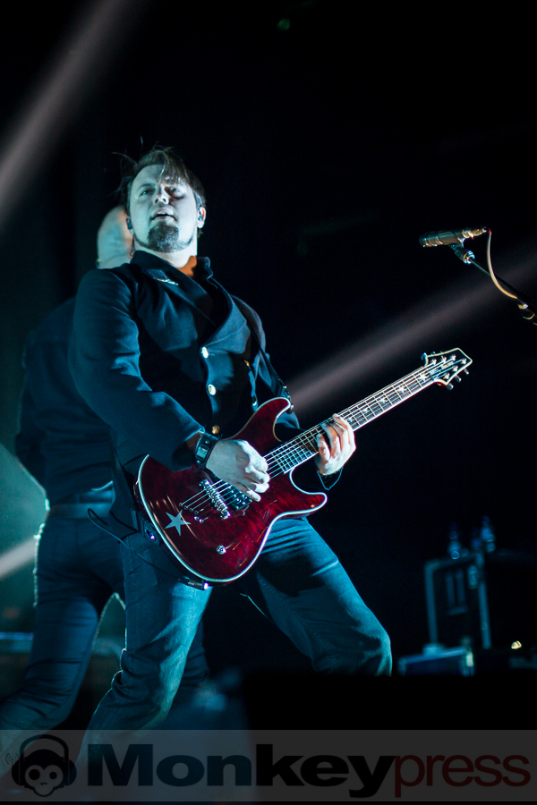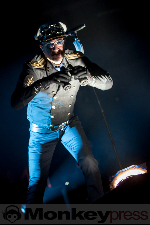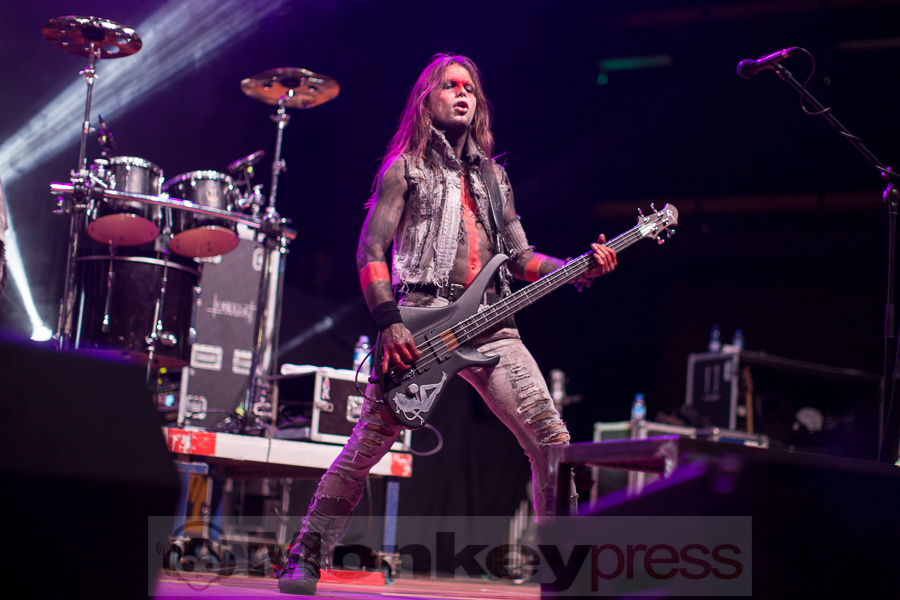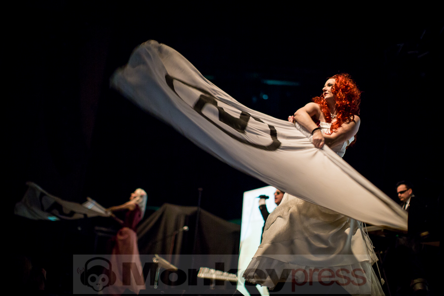 Im kleinen Saal blieb es anschließend elektronisch. Noisuf-X war nun an der Reihe. Das Rhythm ’n’ Noise Projekt ist ein Nebenprojekt des X-Fusion Kopfes Jan L. 2005 erschien das erste Album Antipode, im letzten Jahr erschien das bereits 7. Album Invasion. Die Bühne war nun in Nebel gehüllt und im Hintergrund gab es eine Videoleinwand. Die Tracks von Noisuf-X waren durchgängig tanzbare Instrumentalstücke. Genau das Richtige für Fans experimenteller Musik, die sich nun dicht vor die Bühne drängten. Um 19:40 Uhr trat die Hamburger Band Lord Of The Lost auf die große Bühne. Die Band wurde 2007 von Sänger Chris Harms 2007 zunächst als Soloprojekt gegründet. Stilistisch kann Lord Of The Lost dem Dark Rock zugeordnet werden. Mit Swan Songs, einem Akustik/Klassik-Werk, veröffentlichte die Band dieses Jahr das 5. Studioalbum. Lord Of The Lost erfreuen sich weiter zunehmender Beliebtheit und so sicherten sich die vielen treuen Fans schon frühzeitig einen Platz in den vordersten Reihen. Die Bandmitglieder waren wie gewohnt bei Liveauftritten speziell geschminkt. Voller Energie legten sich die Männer von Lord Of The Lost gleich ins Zeug und präsentierten in 50 Minuten einen guten Querschnitt ihrer Songs. Gegen 19:55 Uhr trat Faderhead auf die kleine Bühne. Hinter Faderhead steckt der deutsche Musiker Sami Mark Yahya. Seit 2006 wurden zahlreiche Alben veröffentlicht, zuletzt Atoms & Emptiness (2014). Faderhead vereinigt viele Stiele, so unter anderem Aggrotech, Electro Pop und House. Live wurde Sami Mark Yahya an den Keyboards unterstützt. Wieder war Tanzen angesagt und Faderhead gaben nun alles. Mit ihren abwechslungsreichen Songs brachten sie die Fans so richtig in Fahrt. Im großen Saal folgte anschließend das Minimal-Elektro-Projekt Welle: Erdball aus Hannover. Die Band setzt vorwiegend auf deutsche Texte und verwendet u.a. elektronische Hilfsmittel wie den Commodore 64. Unlängst erschien die EP 1000 Engel, dessen Titeltrack heute auch der Eröffnungssong war. Lady Lila stand hierbei mit riesigen ausgebreiteten Engelsflügeln auf der Bühne. Weitere Ohrwürmer wie Arbeit Adelt, VW Käfer sowie Schweben, Fliegen und Fallen mit abwechselndem Gesang durch Frontmann Honey und Lady Lila folgten. Bei der Performance wurden Fahnen geschwenkt und Ballons in das begeisterte Publikum geworfen.