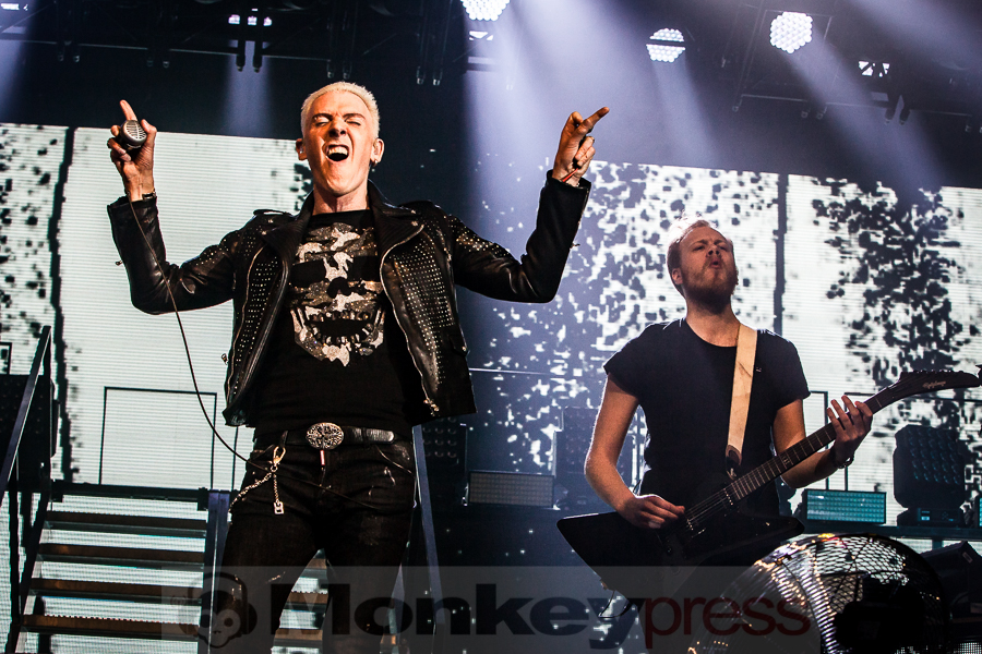 Und gerade als wir uns während der kurzen Umbaupause im Anschluss in unserem Warten etwas ausruhen wollen, schießt ein lauter, grell leuchtender Knall durch Mark und Bein. Es geht los! Wir überschlagen uns fast im Jubel, als die ersten Töne erklingen und wenig später der charismatische Scooter Fronter H.P. Baxxter auf die Bretter stürmt und den neuen Hit Oi! ins Gemenge pfeffert. Seine treuen Fans steigen direkt darauf ein und gröhlen die markanten Textstellen aus vollem Halse mit. Und während der platinblonde Mastermind uns immer mehr anfeuert, schleichen seine in roten Lack gehüllten Gespielinnen auf der Bühne auf und ab, lassen ihre weiblichen Reize spielen und sorgen für ordentlich Aufsehen. Ab hier ist die Show, wie so oft bei Auftritten dieser genretechnisch gesehenen Ausnahmeformation, ein wahrer Selbstläufer. Kracher wie One (Always Hardcore), How Much Is The Fish?, Nessaja oder Posse (I Need You On The Floor) gehen Hand in Hand mit neuen Hits wie Riot oder Mary Got No Lamb und lassen das Stimmungsbarometer und unsere Hände in die Höhe schnellen. Ruhig herumstehen oder sitzen tut hier niemand mehr, stattdessen steckt man sich energisch immer weiter an, noch ausdrucksstarker und inbrünstiger zu tanzen und mitzusingen. Die stark befeierte Szene lässt zudem hier und da immer mal wieder Feuer oder Druckluft in die Lüfte schnellen, was unsere Blicke immer wieder fixiert und uns begeistert. Hier passt wirklich eins zum anderen – eine wirklich geniale Sause, die wir hier fast ausnahmslos auf demselben Level feiern. Einzig das Sisters of Mercy Cover Marian, das H.P. mit den Worten „Goth is still alive“ eröffnet, fällt qualitativ etwas ab. Aber das macht nichts…immerhin zählt der Wille und dass der Electro-Pionier im privaten Stübchen doch einige Bands der düsteren Szene bevorzugt, sollte ebenfalls kein Geheimnis sein. Schwamm drüber! Dafür können wir bei Maria (I like it loud) wieder ordentlich abfeiern und endlich im überdimensionierten Chor die heute so oft geübten „Dö Dö Dö Dödödö Dö Dö“- Gesänge passend platzieren. Was für eine Wahnsinnsstimmung, was für eine Wahnsinnsshow! Und auch wenn das Parkett wenig später leerer wird… zuende ist die Party noch lange nicht, denn die Herren lassen es sich selbstverständlich nicht nehmen, noch ein paar weitere Songgranaten ins feierwütige Gemenge zu senden. Scooter überzeugen ein weiteres Mal auf voller Linie und lassen hier und heute jeden strahlen und glücklich ins noch junge Wochenende starten. Oi!