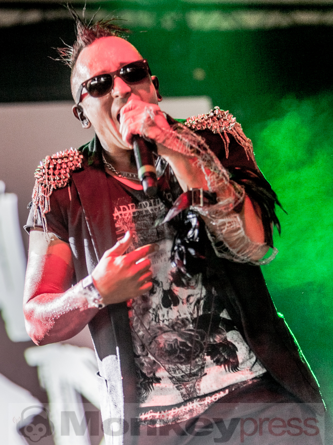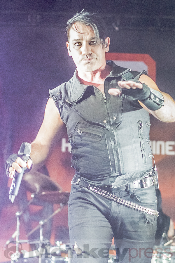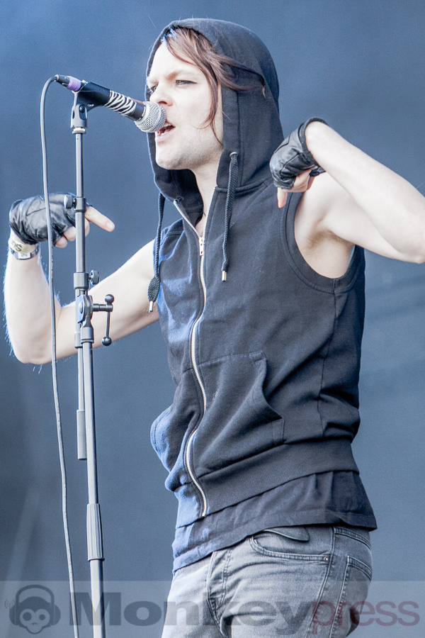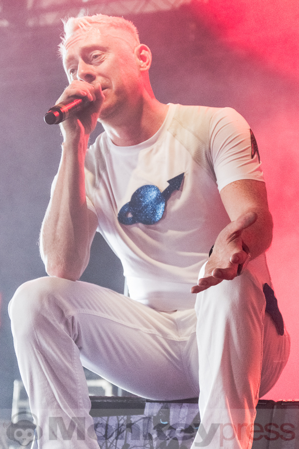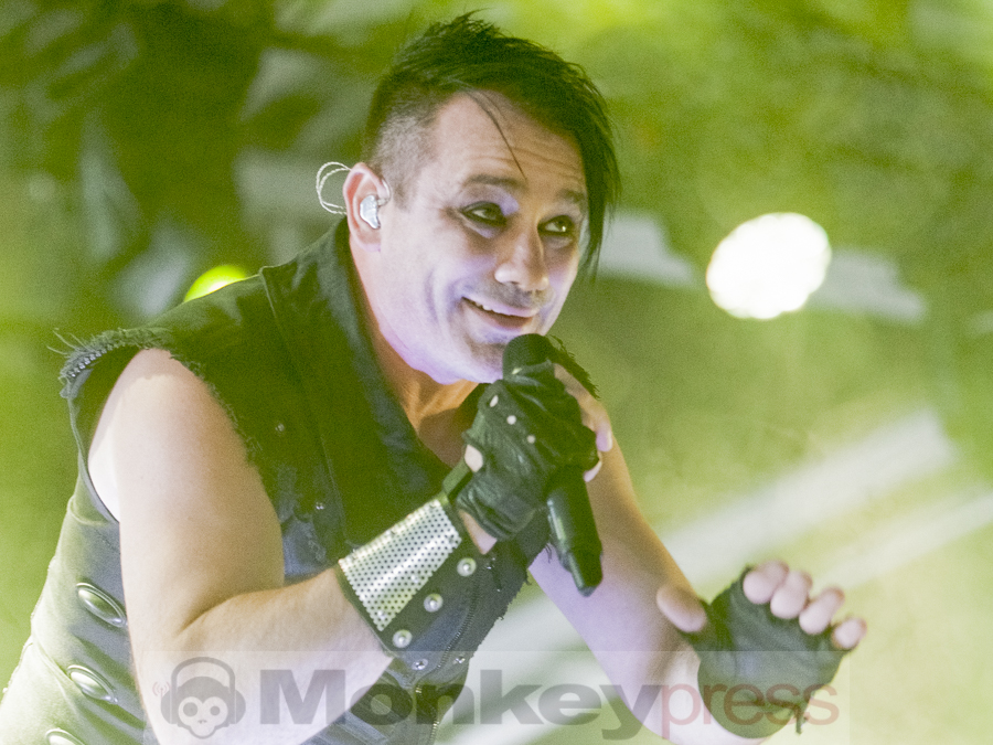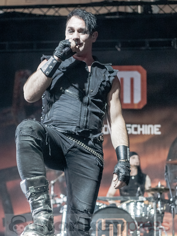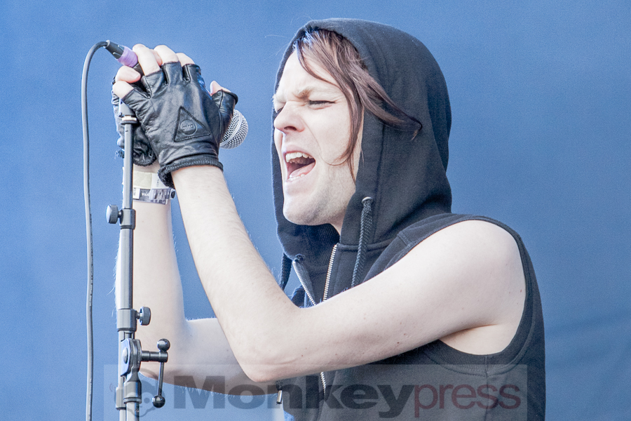 Im Hangar begann das Elektro-Brett nun mit Centhron, draußen machte sich eine Band bereit, die man sonst eher als Headliner im Hangar gewohnt war: Andy LaPlegua legte mit Combichrist los wie die Feuerwehr. Eröffnet mit Slakt spielten sie ein sehr Rock-orientiertes Set, bei dem man nicht denken würde, dass die Band ursprünglich sehr elektronisch unterwegs war. Aber auch dieses Gesicht steht der Band sehr gut, was auch Stücke wie Get Your Body Beat gut zeigen konnten. Ein energiegeladenes Set durch und durch, bei dem alle Beteiligten alles gaben, Bewegung auf und vor der Bühne, das konnte sich sehr gut sehen und hören lassen.
