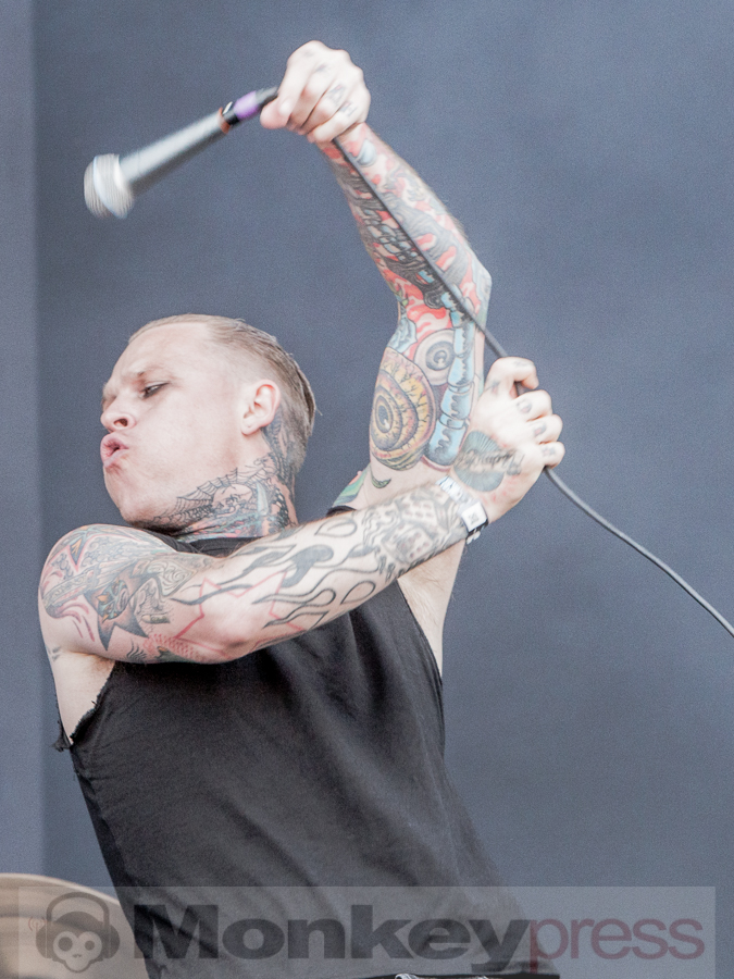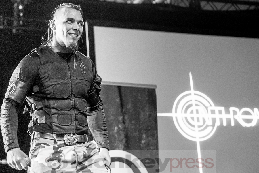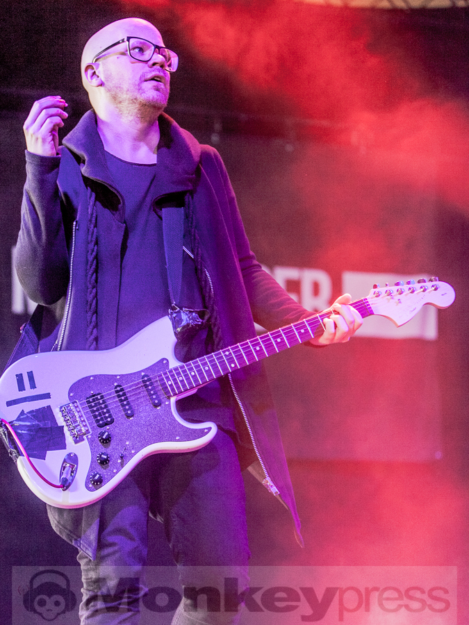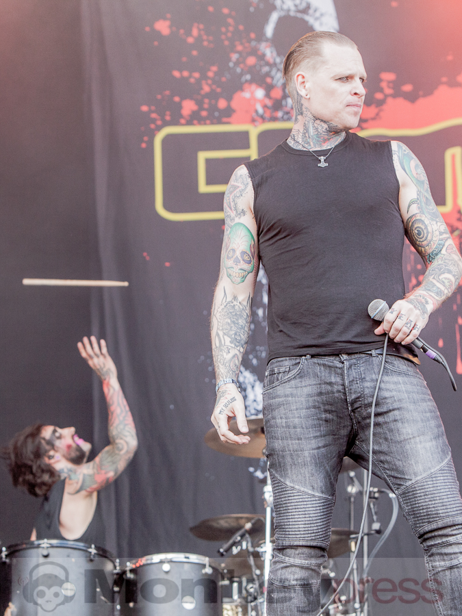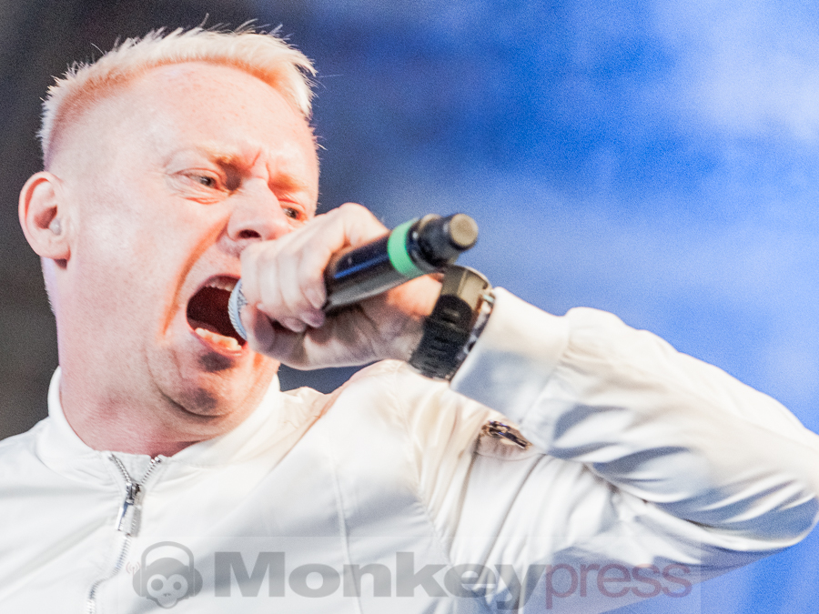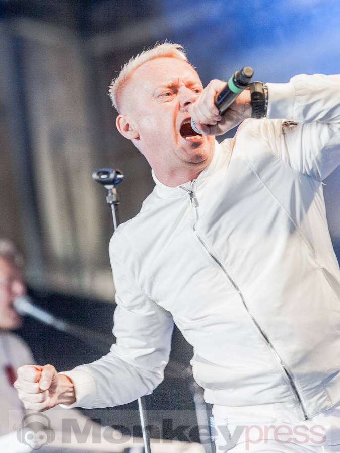 Im Hangar begann das Elektro-Brett nun mit Centhron, draußen machte sich eine Band bereit, die man sonst eher als Headliner im Hangar gewohnt war: Andy LaPlegua legte mit Combichrist los wie die Feuerwehr. Eröffnet mit Slakt spielten sie ein sehr Rock-orientiertes Set, bei dem man nicht denken würde, dass die Band ursprünglich sehr elektronisch unterwegs war. Aber auch dieses Gesicht steht der Band sehr gut, was auch Stücke wie Get Your Body Beat gut zeigen konnten. Ein energiegeladenes Set durch und durch, bei dem alle Beteiligten alles gaben, Bewegung auf und vor der Bühne, das konnte sich sehr gut sehen und hören lassen.