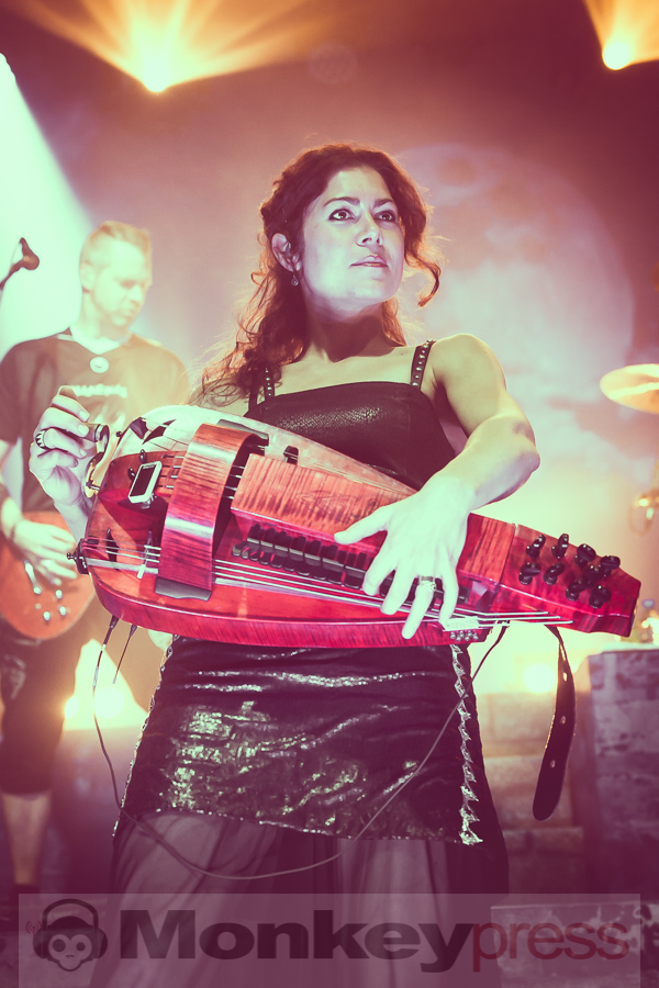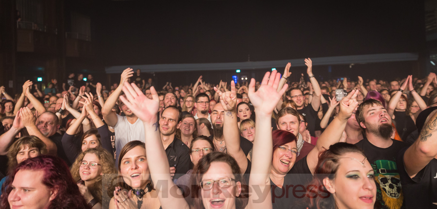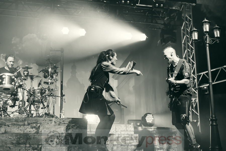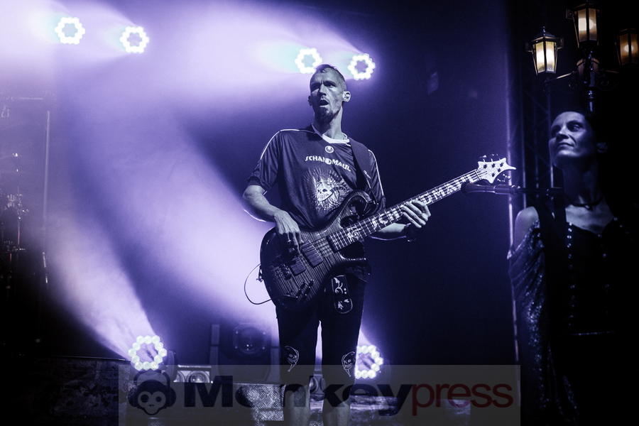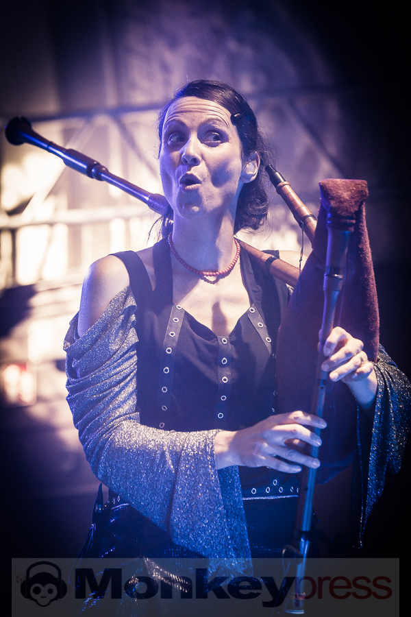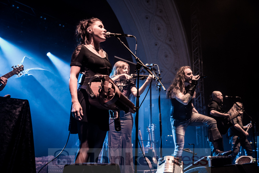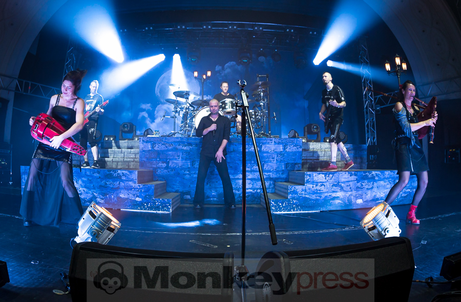 Während auf der Bühne in kürzester Zeit umgebaut wurde, hörte man im Backstage-Bereich, wie einige Instrumente bereits eingestimmt wurden. Die Vorfreude stieg dadurch noch mehr an. Unter viel Applaus und Gegröle kamen die Mitglieder von Schandmaul einzeln auf die Bühne. Die stimmige und tolle Beleuchtung offenbarte ein einzigartiges Bühnenbild – Eine Stadt im Hintergrund, die Podeste als Kaimauer und auf der Bühne ein paar Straßenlaternen, das Publikum sollte das Meer darstellen, welches auch zu späterer Stunde immer wieder zu Aktionen aufgefordert wurde. Die Fans sind vom ersten Ton an mit dabei und machen mit. Als das erste Lied Orleans verklungen war, bedankte sich Sänger Thomas Lindner erstmal beim Publikum für Platz 1, des neuen Albums, in den Charts. Schandmaul präsentierten einen guten Mix aus neuem und altem Liedgut, wobei bei den älteren Stücken die Fans textsicherer waren und lauthals mitsangen. So auch bei Drachentöter, es wird vom ersten Ton an mitgegrölt und gejubelt und bis zum Ende mitgesungen. Zwischen den einzelnen Songs gab Fronter Thomas immer wieder eine passende kurze Geschichte zum Besten, die das nächste Stück ankündigte. Bis in die hintersten Reihen sangen die Fans mit, sprangen auf und nieder, kamen der Aufforderung der Band nach, das Meer mit schwingenden Armen nachzuahmen und huldigten der Darbietungen immer mit viel Applaus. Während Anna und Birgit sich auf der Bühne unter sehr viel Jubel ein Instrumental-Duell bei der Akkustikversion Käptn Coma lieferten, nahmen sich die Leute in die Arme und sprangen zusammen zum Takt der Musik. Beim Teufel-Trinklied schmetterte der ganze Saal den Text mit und statt „Zugabe“-Rufen nach dem vermeintlich letzten Lied Dein Anblick sang das Publikum den Refrain „die Sonne, die Sterne tragen Kunde von dir, jeder Lufthauch erzählt mir von dir…“ immer weiter, bis die Band für die Zugabe zurück auf die Bühne kam – Gänsehautfeeling pur. Bevor dann das letzte Lied angestimmt wurde, kam noch der Fangesang „oh oh oh Schandmaul“ – Thomas sichtlich gerührt, ließ den Moment auf sich wirken, bis er den Schlussakkord anstimmte. Ein sehr schönes Konzert, mit vielen Gänsehaut-Momenten, schöner Bühnenkulisse, super Lichtshow und Akustik, tollen Fans die mitmachten, Schandmaul wie auch Krayenzeit durch den Abend trugen und mit zwei Bands, die zu unterhalten wussten.