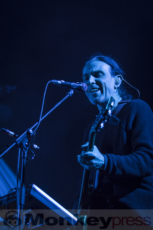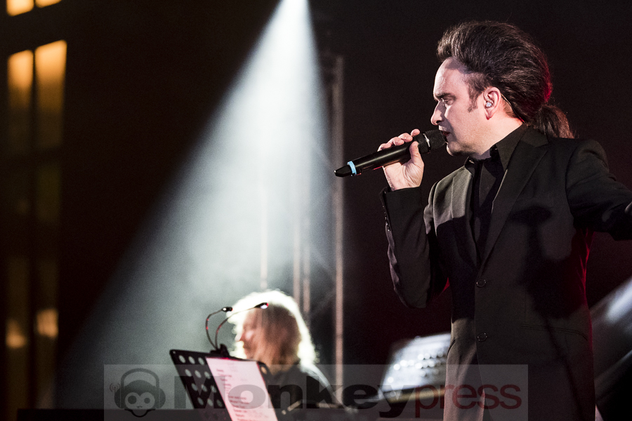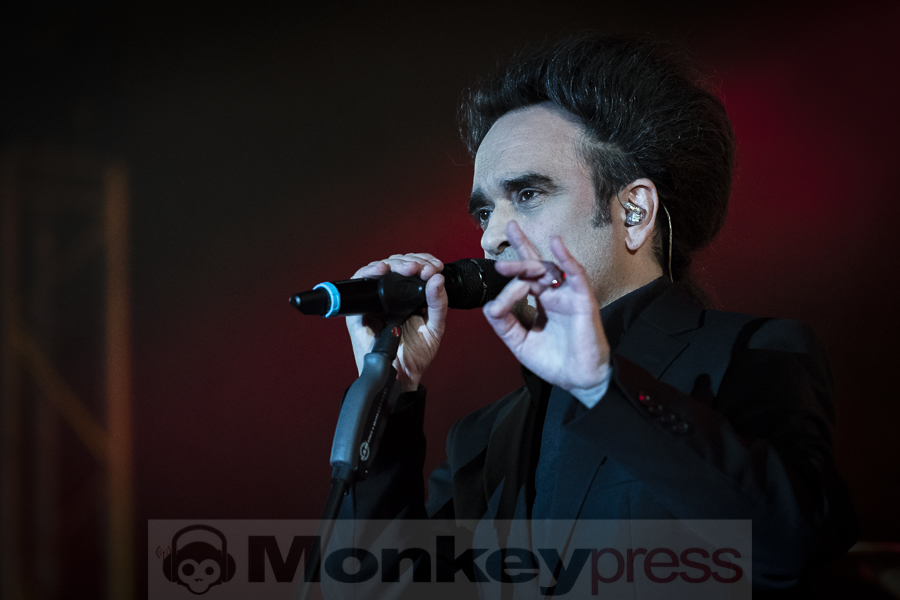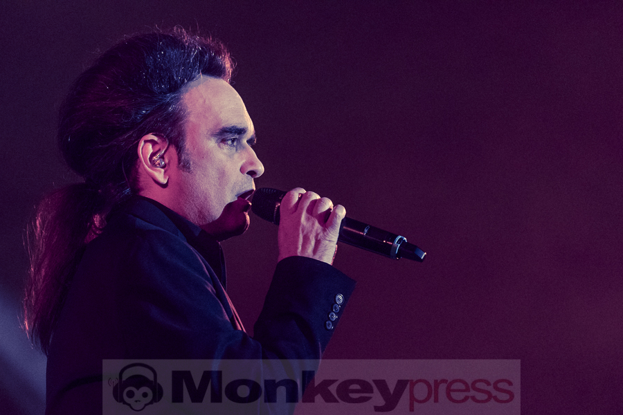 Ja, es war kalt. Konnte man sich auch denken, denn wer bekommt schon eine so große Halle mitten im Januar ausreichend beheizt? Kuschelsocken und der eine oder andere Wein am Getränkestand waren an diesem Abend also Pflicht und taten der Konzertfreude keinen Abbruch. Beginnend mit Away verzauberte ein ernst wirkender, aber bestens gelaunter Herr Veljanov sein Publikum und führte mit Colour-ize und einer bestens dazu abgestimmten Lichtshow weiter durch den Abend. Da das Duo nicht allein seine Stücke präsentieren, sondern auch Lieder aus den jeweiligen Soloprojekten präsentieren wollte, enterte schon bald Sabine Lutzenberger die Bühne und performte gemeinsam mit den Lakaien die Helium Vola-Stücke Mahnung, Dormi und Seelig. Die Kleidung von Frau Lutzenberger hätte wohl etwas besser gewählt sein können, gab der Schnitt ihrer Hose doch unfreiwillige Einblicke. Egal, stimmlich hat die Frau so einiges drauf, was auch eine schlecht sitzende Hose verzeihen lässt. Wer jetzt dachte „Ach, jetzt gibt es bestimmt ein Päuschen“, der irrte. Es folgte der Lakaien-Klassiker Over And Done, gefolgt von zwei Veljanov Solo-Stücken. Keine schlechte Mischung, die der erste Konzertteil da zu bieten hatte.