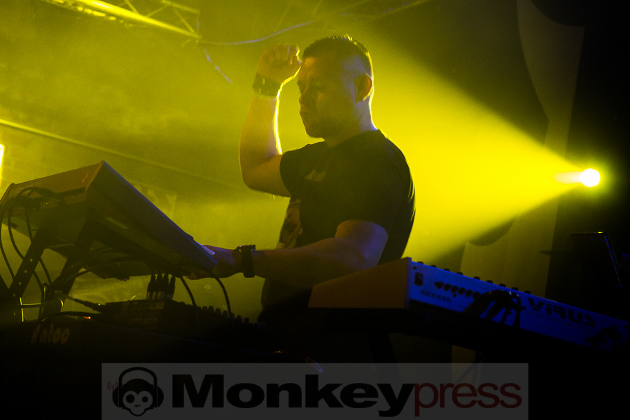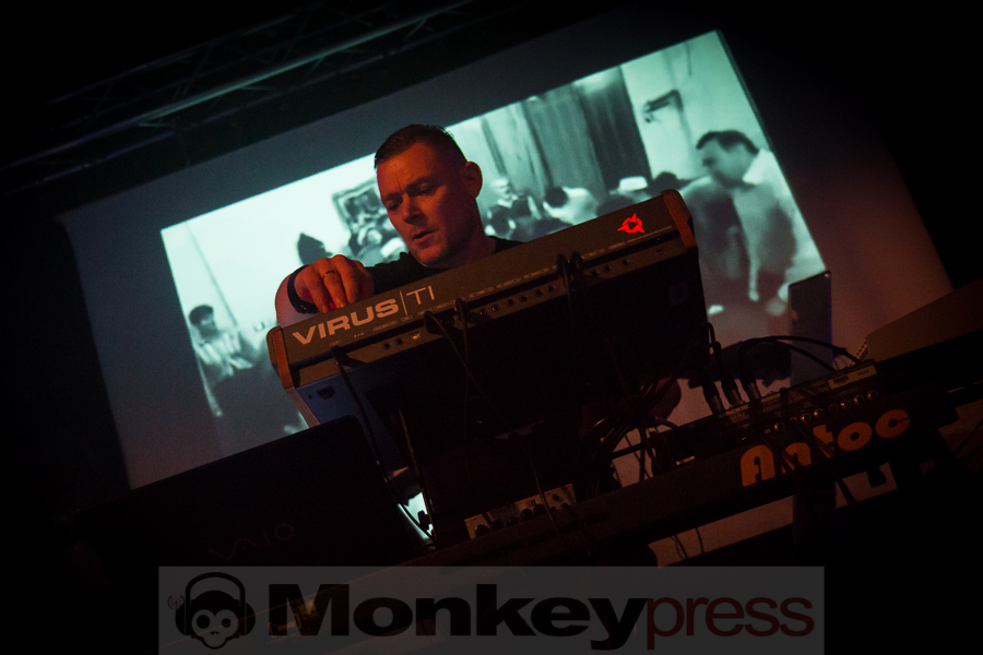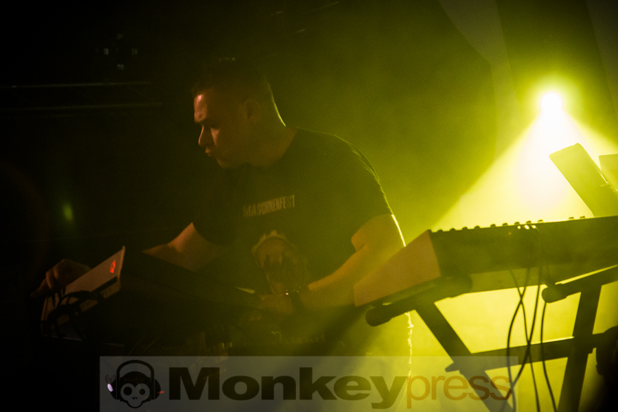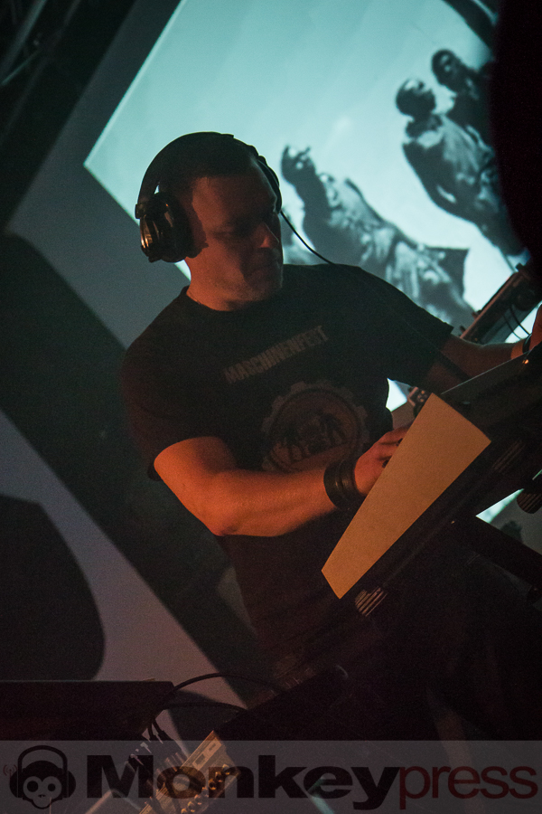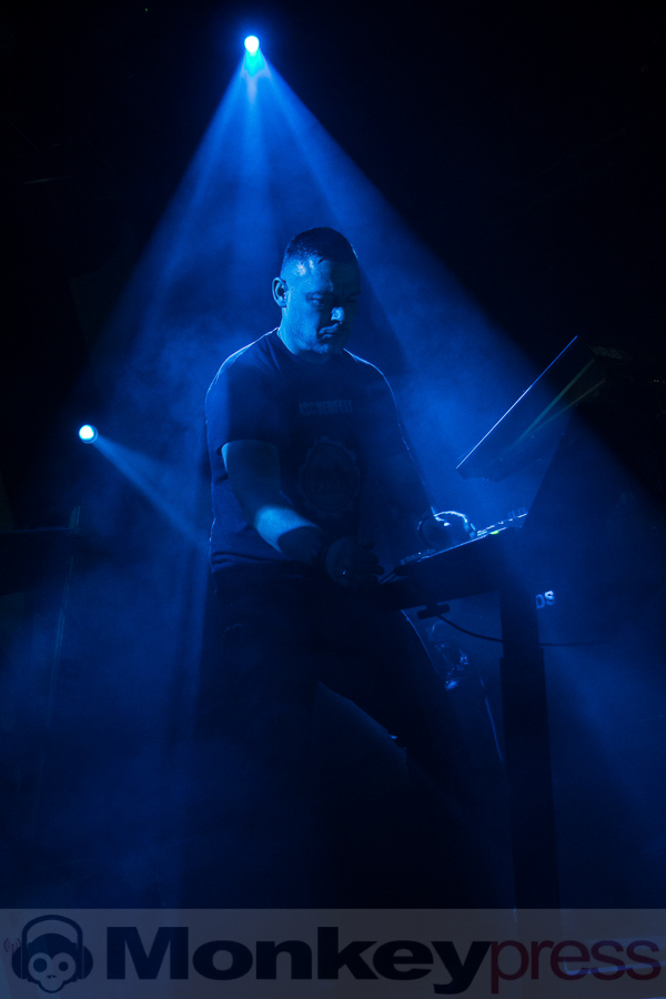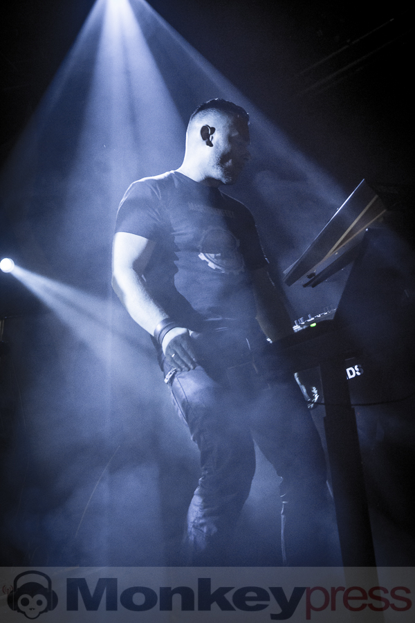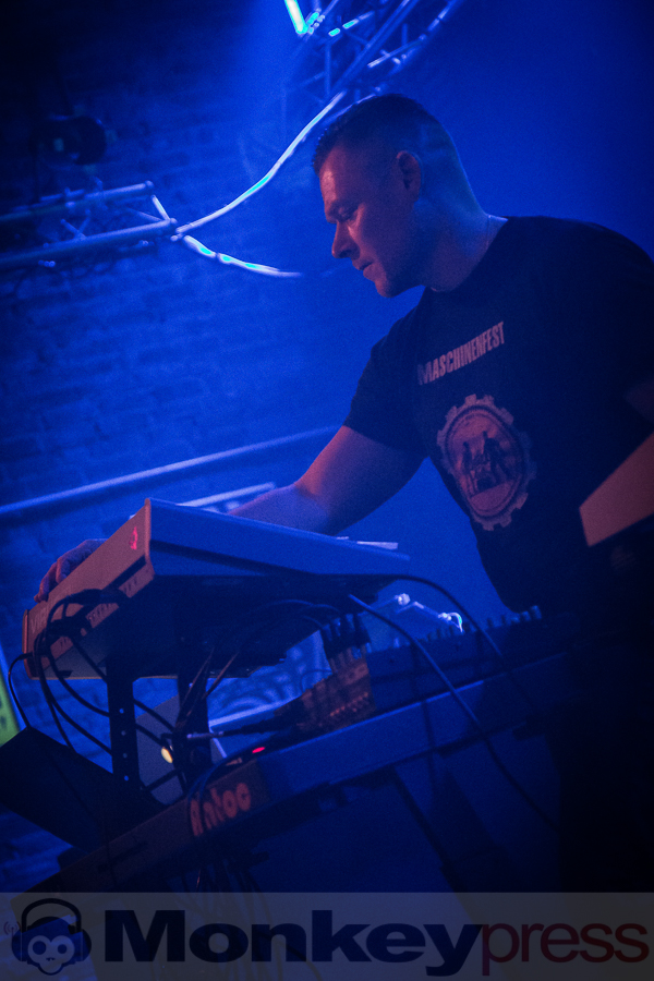 Um kurz nach halb Zehn legen Binary Park nach kurzem Umbau mit ihrem Set los. Torben Schmidt und Alfred Gregl machen bereits seit den frühen 90ern zusammen Musik, die Idee ein gemeinsames Elektro-Industrial Projekt zu starten entstand jedoch erst 2009. Nach ein paar Demos entschieden beide, dass ein Sänger her muss, welcher mit Huw Jones schnell gefunden war. Zwar ist sein Gesang ein wenig gewöhnungsbedürftig, dennoch finden sich im Publikum einige Fans der Band, die für Bewegung in den Reihen sorgen. Insgesamt ein solider Auftritt, auch wenn ich mir gewünscht hätte dass Binary Park den ein oder anderen instrumentalen Song in die Setlist aufgenommen hätten. Nach gut einer halben Stunde verabschiedet sich das Trio mit einem brandneuen Song, welcher auf dem kommenden Album zu hören sein wird.
