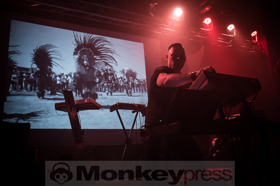 Etwas früher als geplant startet das Ein-Mann-Projekt Mortaja alias Bert Lehmann in den Konzertabend. Fette Bässe bestimmen den Ambient / Experimental / Industrial Sound, welcher per Videoanimationen von spirituellen / religiösen Ritualtänzen untermalt wird. Für Freunde des Maschinenfests oder des Schlagstromfestivals wohl ein gelungener Auftakt.