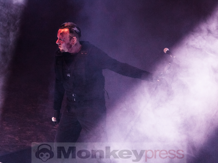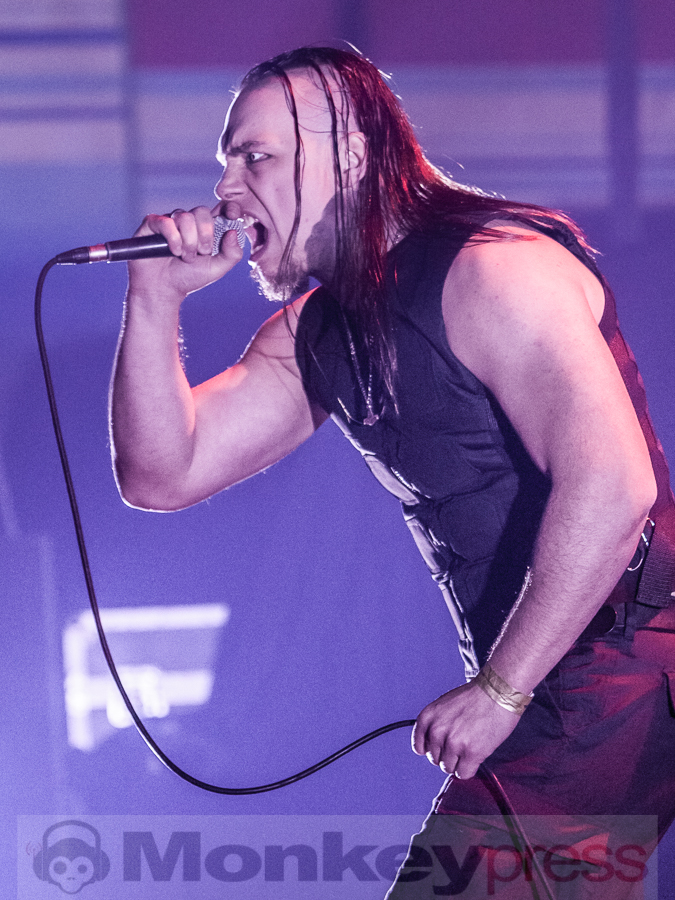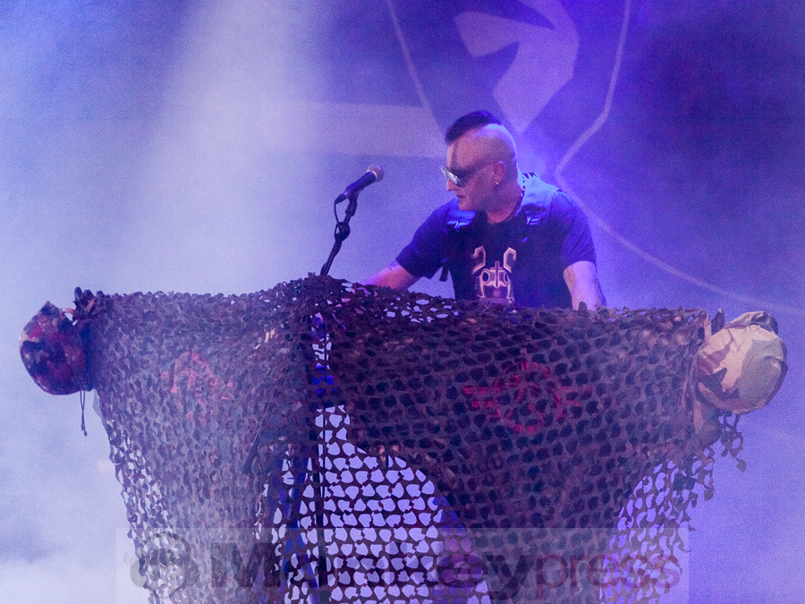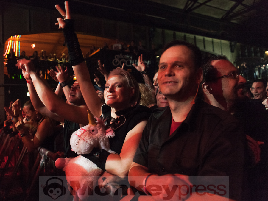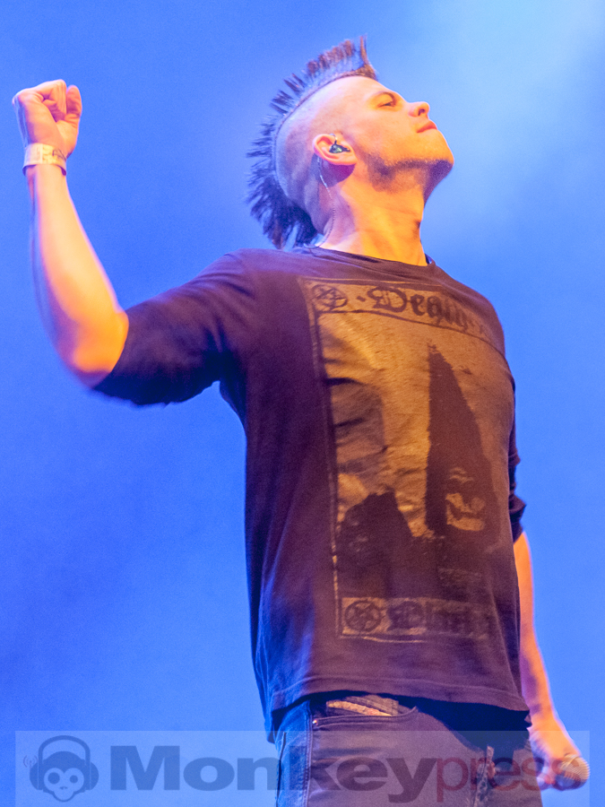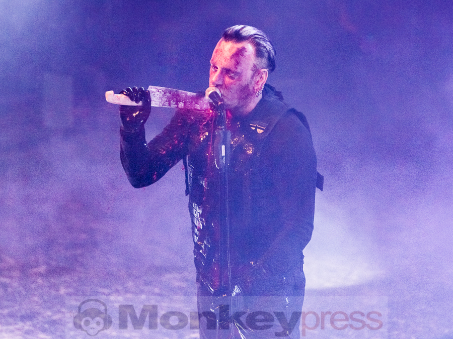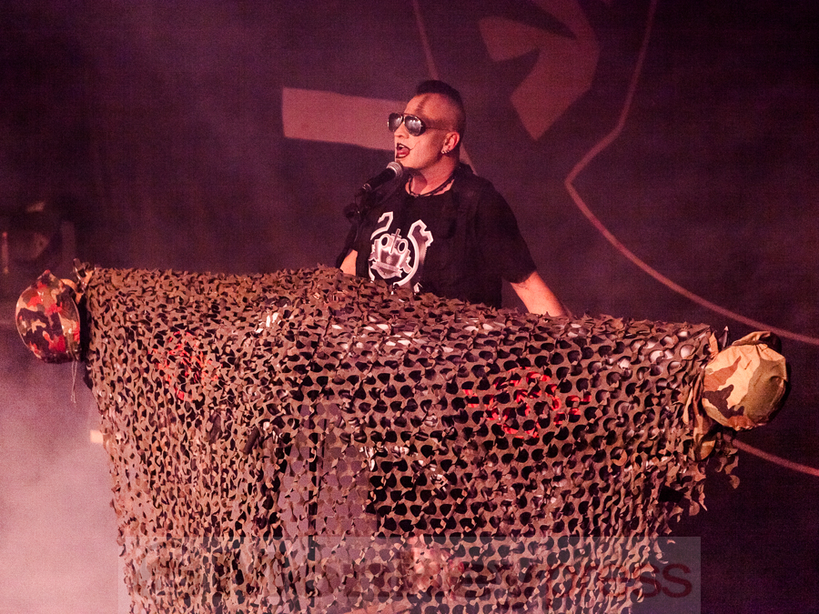 Für den nächsten echten Aha-Effekt sorgte gegen 20 Uhr Olli von Agonoize, dummerweise eher unfreiwillig. Er wollte seinen Fans ganz nahe sein – beachtete dabei allerdings nicht, dass zwischen Bühnenrand und Publikum noch ein Fotograben liegt. Dieser war aufgrund der folgenden Kunstblut-Show zur Sicherheit mit einer Plane abgehängt, Olli stieg auf eben diese Plane – und schwupps, weg war er. Sah nicht gesund aus, den folgenden Auftritt zog „Germany’s most extreme electro act“ aber in aller Professionalität und wieder mit vielen Showelementen durch.