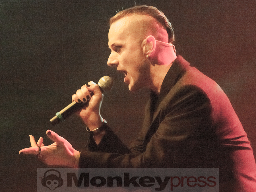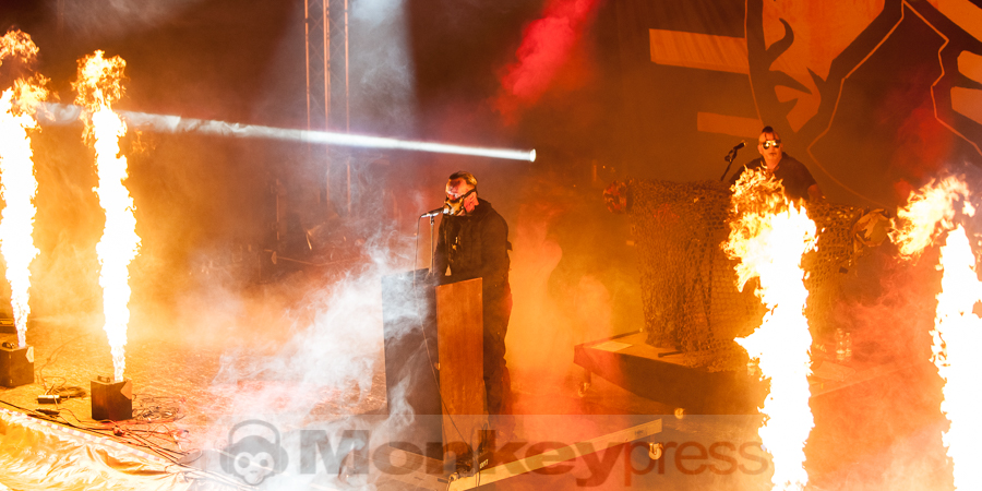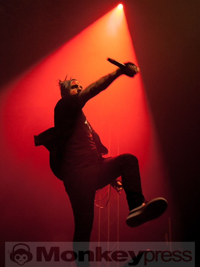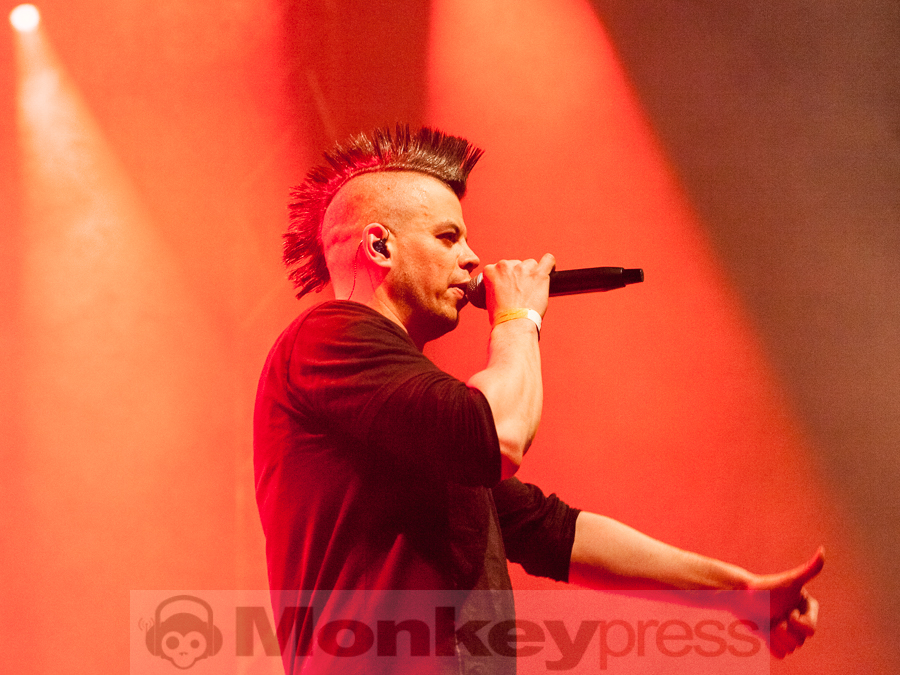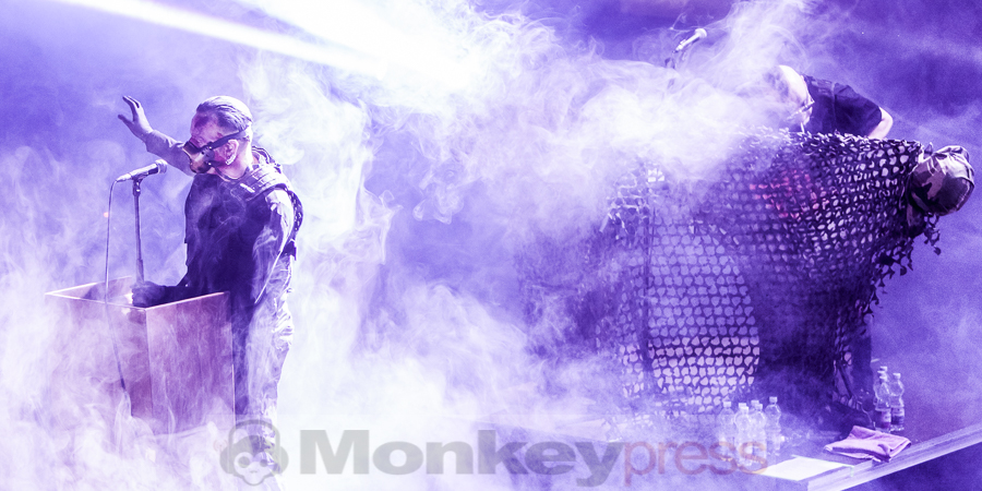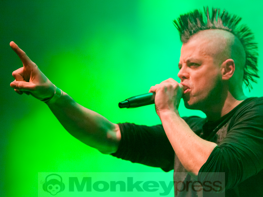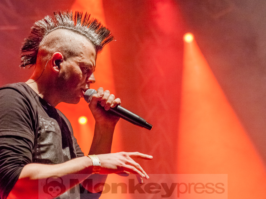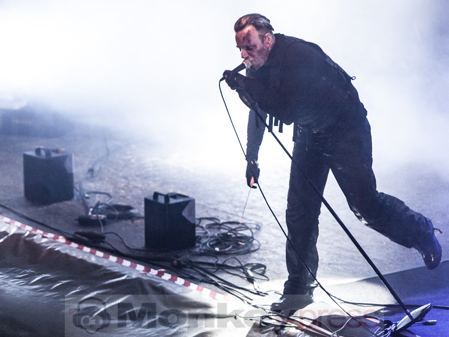 Für den nächsten echten Aha-Effekt sorgte gegen 20 Uhr Olli von Agonoize, dummerweise eher unfreiwillig. Er wollte seinen Fans ganz nahe sein – beachtete dabei allerdings nicht, dass zwischen Bühnenrand und Publikum noch ein Fotograben liegt. Dieser war aufgrund der folgenden Kunstblut-Show zur Sicherheit mit einer Plane abgehängt, Olli stieg auf eben diese Plane – und schwupps, weg war er. Sah nicht gesund aus, den folgenden Auftritt zog „Germany’s most extreme electro act“ aber in aller Professionalität und wieder mit vielen Showelementen durch.