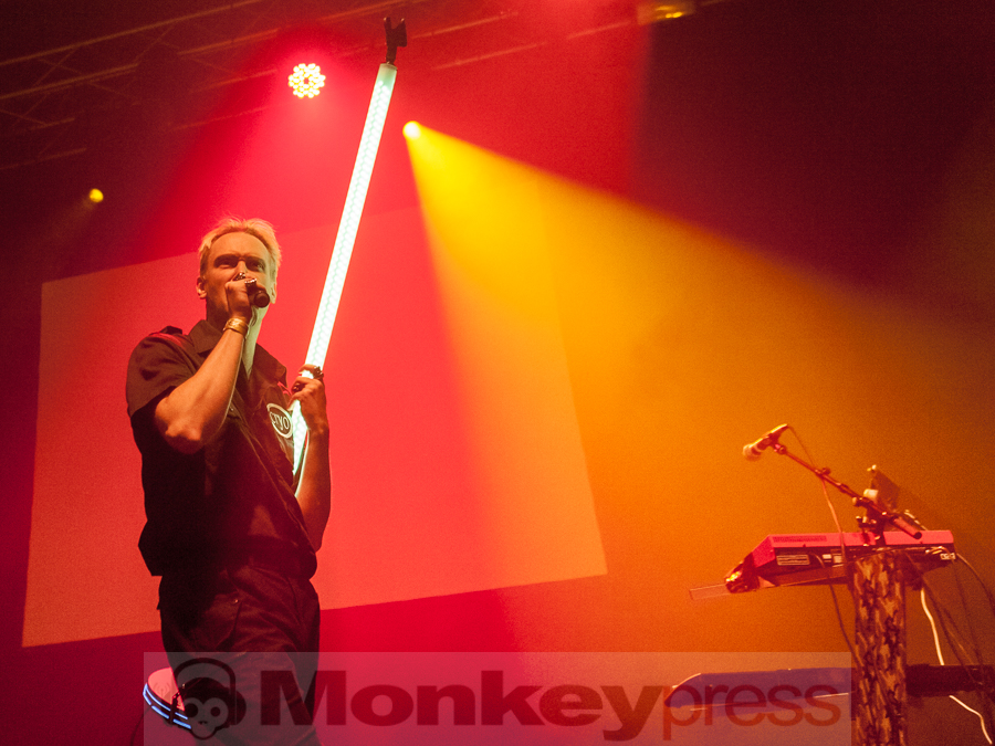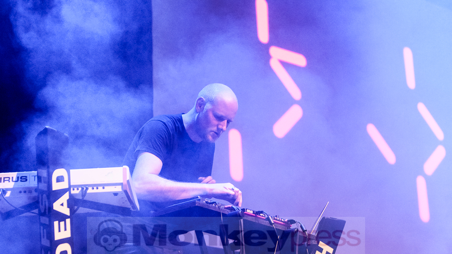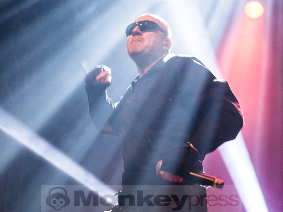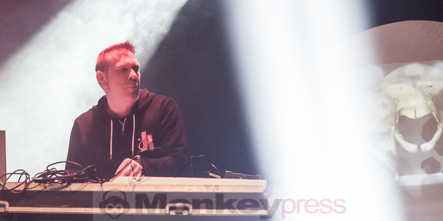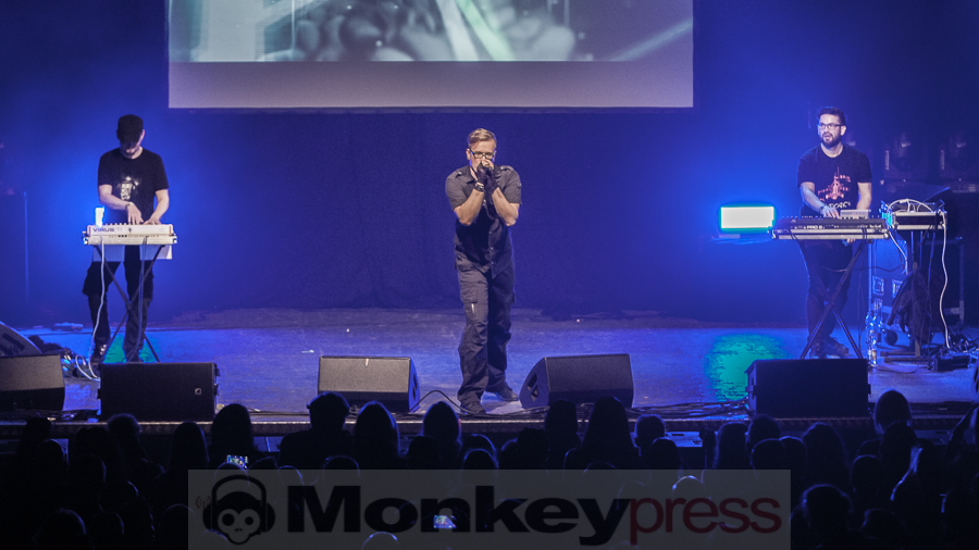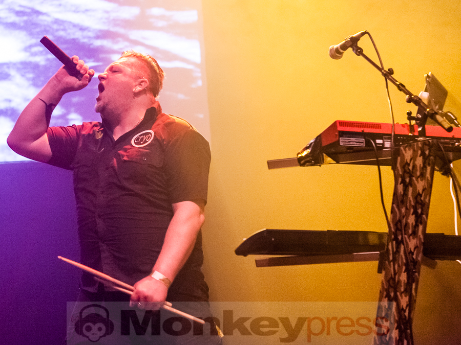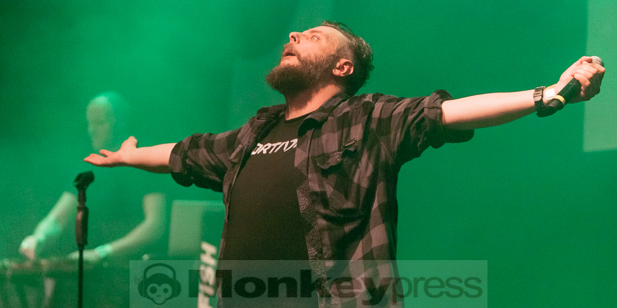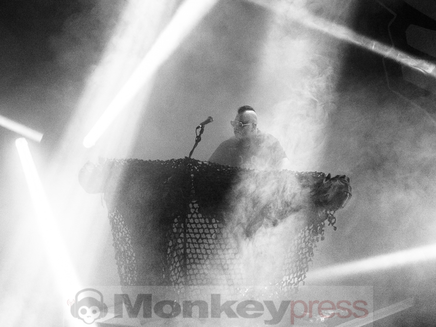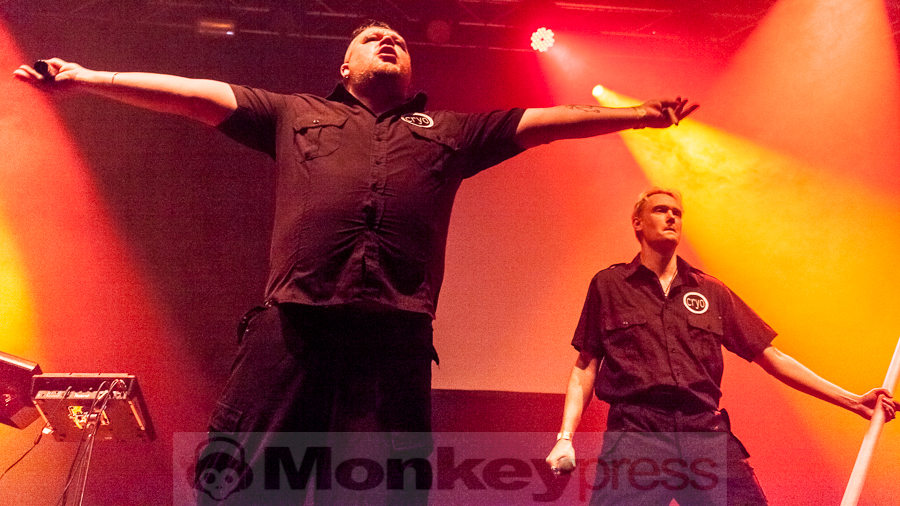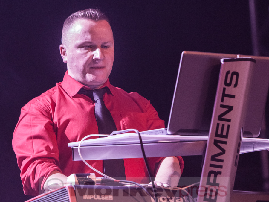 Wobei die klassische EBM, welche der Headliner Front 242 in den 80ern produziert hat, nichts mehr mit dem zu tun hat, was live begutachtet werden kann. Leider, denken viele. Wer sich auf das Spektakel mit wabernden Synthies, zahlreichen nicht immer nötigen Noise-Layern und dem Berliner Tim Kroker am „Klackzeug“ (von „Schlag“zeug kann ja bei Front 242 schon ewig keine Rede mehr sein) vorurteilsfrei einlässt, bekam das gewohnte Set aus den Vorjahren in einwandfreier Qualität geboten.