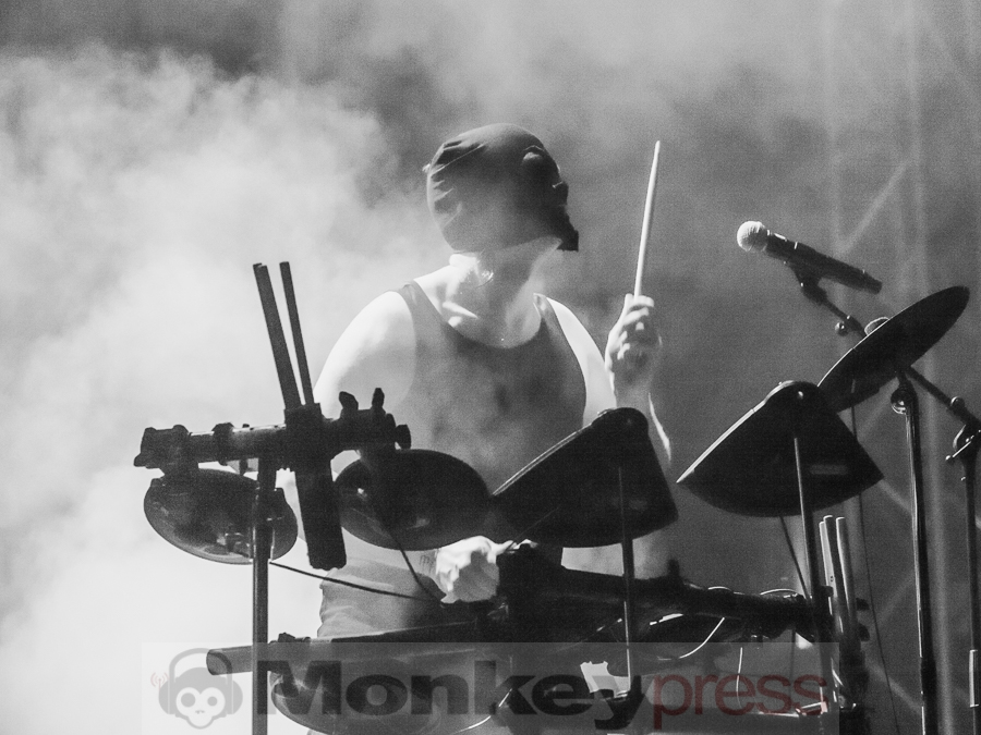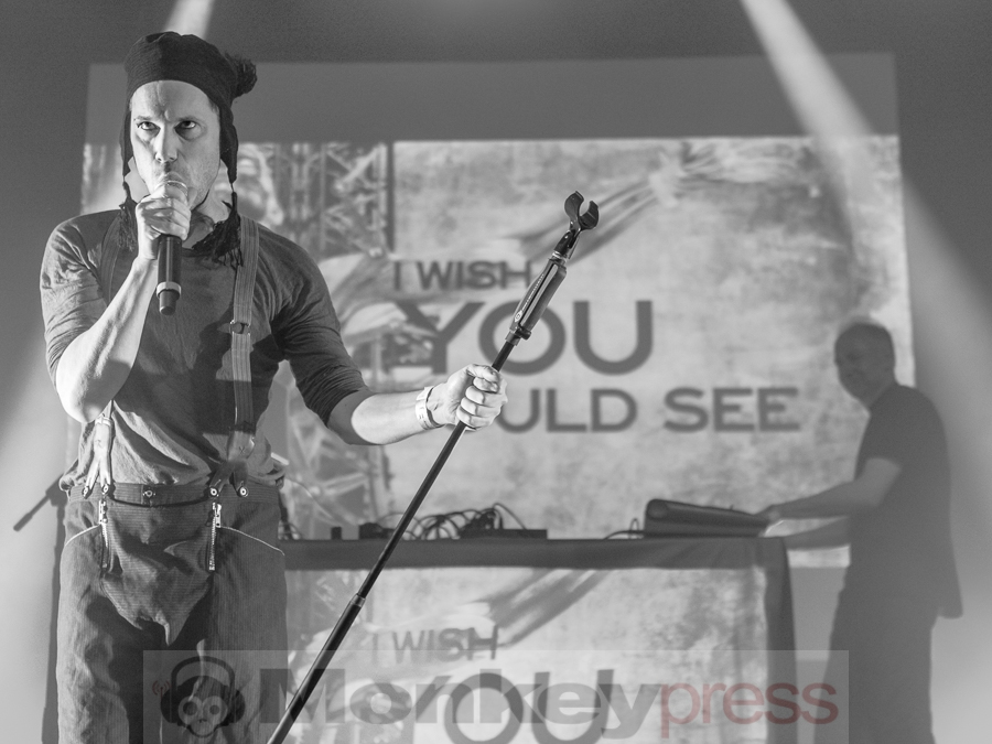 Apropos Eindruck hinterlassen: Wenn dies an diesen Festivaltag einer Gruppe gelang, dann Wulfband. Das schwedische Newcomer-Brutalo-EBM-Projekt gab endlich sein NRW-Livedebüt – und was für eines. Der Typ mit Bankräubermaske am Schlagwerk und der Typ mit Wischmob vor dem Gesicht am Mikro (ihre Namen und Identitäten halten die beiden seit jeher geheim) brachten 30 Minuten lang kaum verständliche und völlig schwachsinnige deutschsprachige Texte sowie pure Energie auf die Stage. Dabei unterstützt von einer perfekt auf den Sound abgestimmten, hektisch flackernden Lichtshow. Leider gab es während des Auftritts technische Probleme mit dem Drumset, was den Schwung zwischenzeitlich ein wenig herausnahm. Egal: Die Pogo-Fraktion hatte ihre Freude. Alle anderen ließen sich mitreißen – oder starrten so verwirrt wie gebannt in Richtung Bühne.