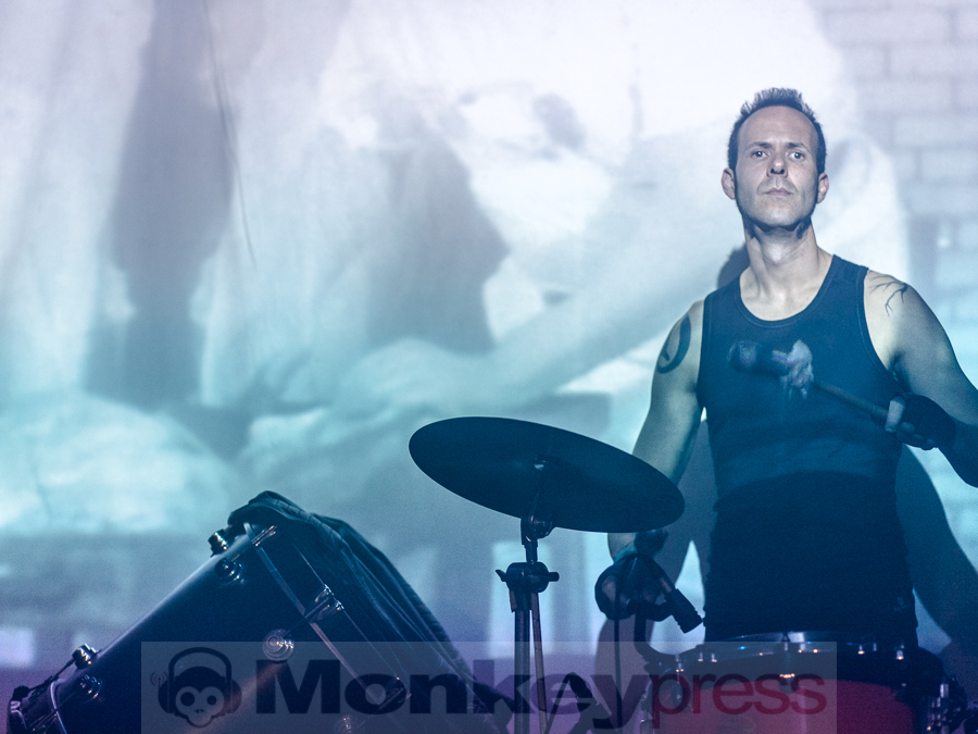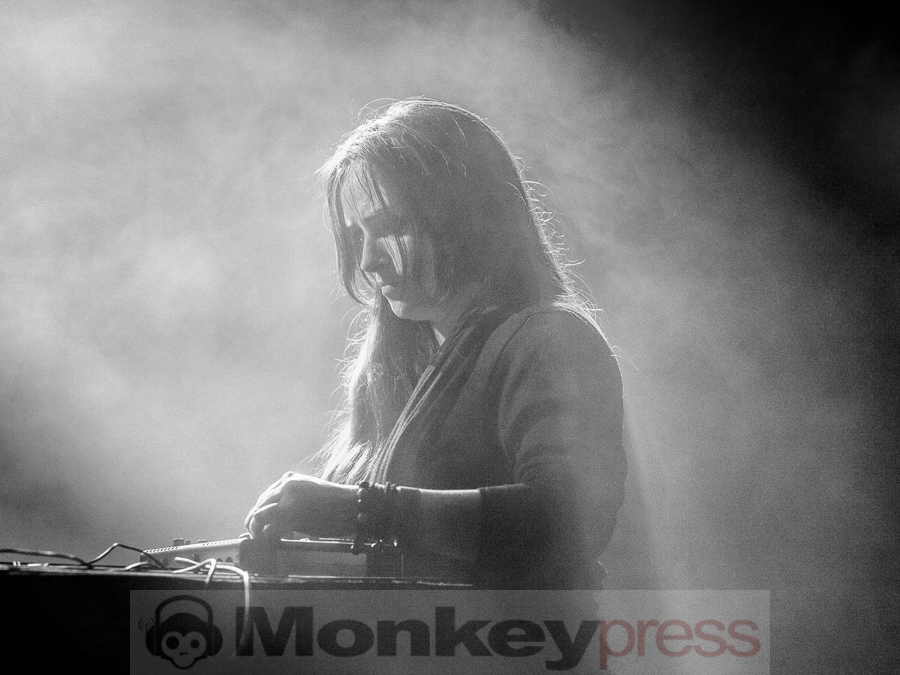 Nachdem um 18:30 Uhr die Türen aufgingen, eröffneten um 19:20 Uhr Empusae den Abend in Duo-Besetzung. Dabei waren nicht nur die Musiker ein Duo, sondern auch die aufgeführten Stücke, denn dieser waren es in den 40 Minuten Spielzeit lediglich zwei – in Form des neuen Albums Lueur, dessen Stücke Überlänge haben. Als Duo standen sie da, als er an allerhand Gerätschaften, Knöpfen und einem kleinen Saiteninstrument Klanglandschaften entstehen ließ, während sie für die Videoprojektionen sorgte. Ambiente Elektro-Klänge wurden präsentiert, man konnte sich in den Klängen verlieren, und doch begegneten immer mal wieder verstörende Zwischentöne. Trotz der nur zwei gespielten Stücke war es ein abwechslungsreiches Set von rund 40 Minuten.