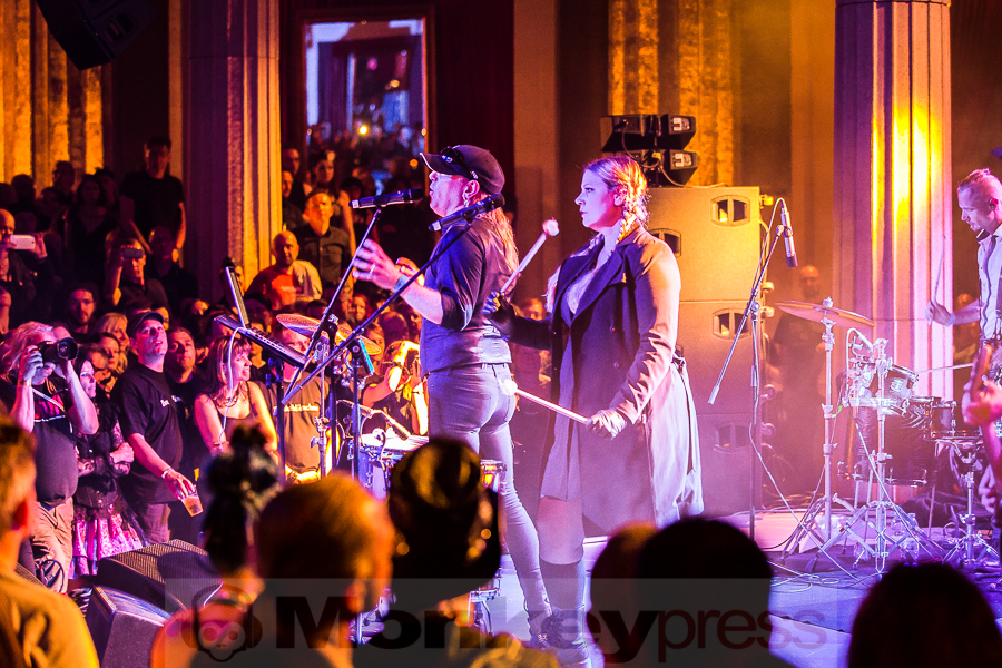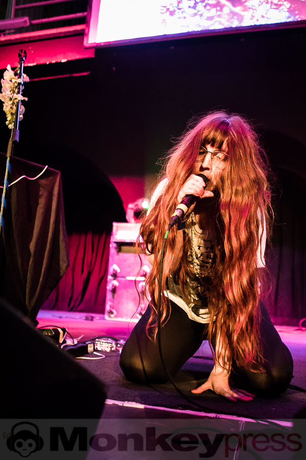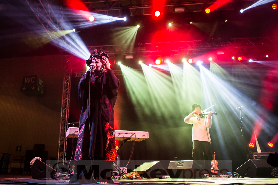 Das erste Mitternachts-Special des Wave-Gotik-Treffens 2017 steht an und viele freuen schon sich auf die außergewöhnliche Kooperation von The Dresden Dolls Frontfrau Amanda Palmer und The Legendary Pink Dots Mastermind Edward Ka-Spel. Diese startet aber erst einmal mit einem kleinen Dämpfer, denn das Pedal von Amanda Palmers Piano ist defekt, das Instrument somit nicht nutzbar. Aber welch ein Glück: Wir haben es hier mit absoluten Profis zu tun und so überspielen die drei Vollblutmusiker das Ganze absolut unterhaltsam. Vorläufig präsentiert uns Geiger Patrick Q. Wright aber noch genau diesen einen von ihm geforderten Ton und bevor dieser dann nach einer ganzen Weile doch zu eintönig wird, fügt er ihm vorsichtshalber noch einen zweiten hinzu. Es folgt ein Song komplett ohne Piano, bei dem Amanda schon einmal ihre tolle Stimme unter Beweis stellen kann. Dann naht auch schon Hilfe. Das deutlich größere Pedal, das eben noch bei Devilment gute Dienste geleistet hat, wird angeschlossen, kurz mit „auf die Größe kommt es aber nicht an“ von Amanda kommentiert. Dann entfließen dem Instrument endlich erste Töne und die drei können ihre Songs des gerade erschienenen Debütalbums I Can Spin A Rainbow in seiner vollen Pracht darbieten. Die Songs sind zwar eher ruhig, aber dafür sehr intensiv und damit wahlweise wie gemacht oder völlig fehl am Platz für diese fortgeschrittene Stunde. Einige der Zuschauer gehen langsam in Richtung Partyhallen (oder ins hoffentlich nahe gelegene Bett), während die Interessierten den Rest der Darbietung förmlich an den Lippen von Amanda und Edward hängen und sich der feinen Klang-Atmosphäre hingeben. (MG)