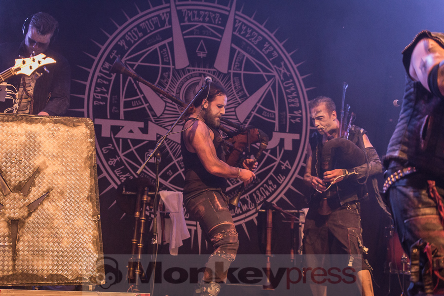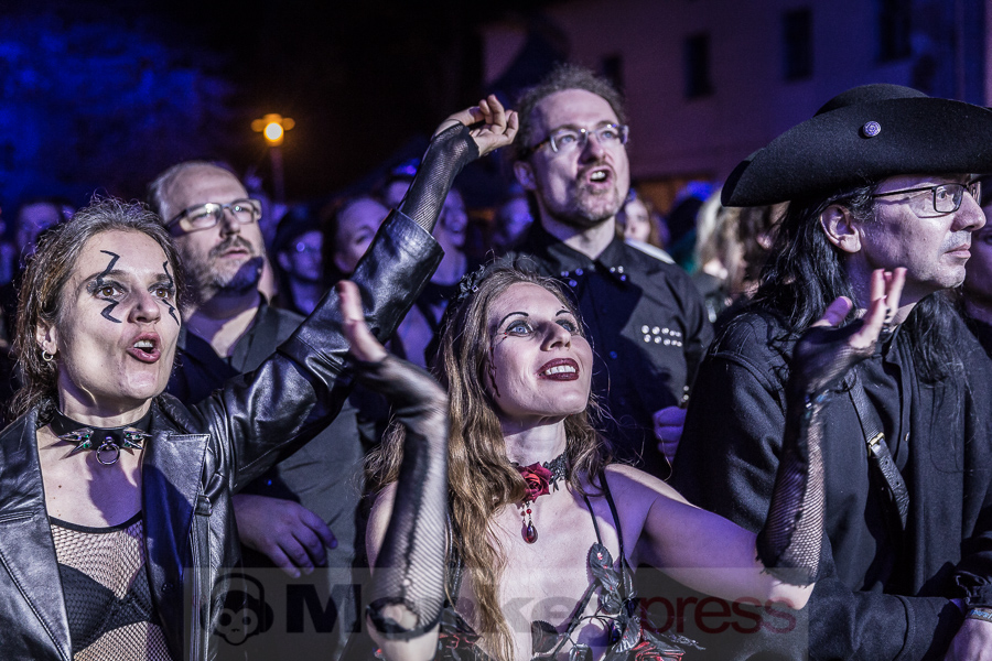 Kurz vor 22 Uhr betreten Teufel und seine Mannen die Bühne im Heidnischen Dorf, etwa 20 Minuten später als das eng getaktete WGT-Programm vorgesehen hat. Besser spät als nie, sagt sich da der altgediente Festivalbesucher, von so etwas lässt man sich ja nicht die Laune verderben. Nichtsdestotrotz werden die Berliner schon sehnsüchtig von den mehreren Hundert Fans erwartet. Das hängt zum einen damit zusammen, dass Tanzwut am Eröffnungsabend natürlich Headliner im Heidnischen Dorf sind, zum anderen haben sich die Jungs in den letzten Jahren auf dem WGT doch etwas rar gemacht, nachdem sie jahrelang praktisch zum Inventar des Treffens gehört haben. Als Intro hat die Band Freude Schöner Götterfunken erwählt. Das ruft Erinnerungen wach. Es wird eng auf der kleinen Bühne, als die 8-köpfige Besetzung, einer nach dem anderen, heraus in den lauen Sommerabend tritt. Viel Platz für große Show und Performances wird die Band wohl nicht haben. Aber das tut der Stimmung vor der Bühne keinen Abbruch, denn Tanzwut haben mehr zu bieten als Pyro und Akrobatik: Gemeinschaft, Nostalgie, epische Geschichten und eingängigen mit Dudelsäcken garnierten Rock. Neben den Songs vom aktuellen Album Schreib es mit Blut musste deswegen auch niemand auf die alten Klassiker verzichten. Ein stimmungsvoller Höhepunkt am Freitagabend. (DS)