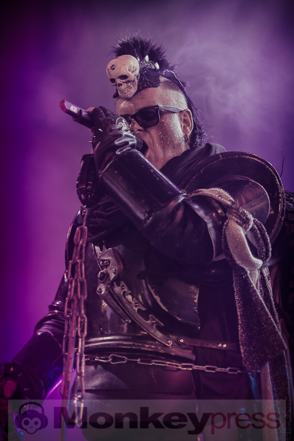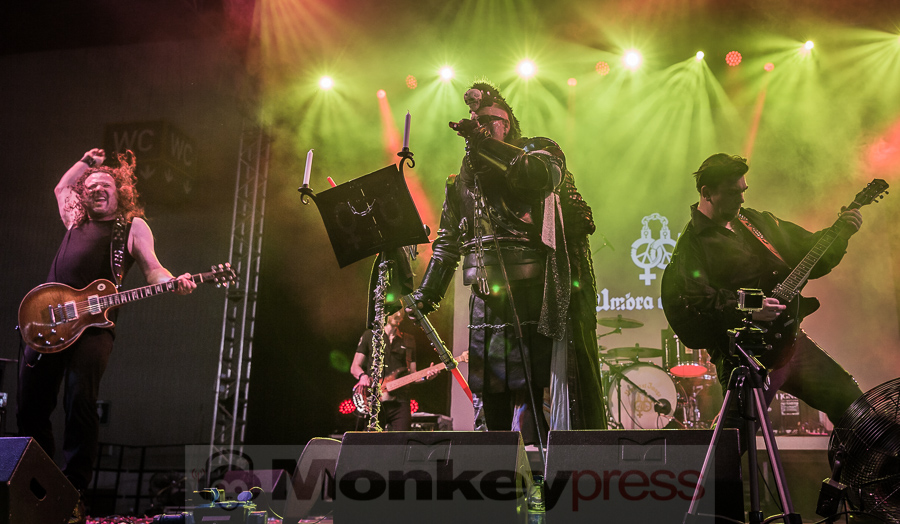 Die agra füllte sich recht schnell, denn als Opener waren die Karlsruher Umbra et Imago gebucht. Gleich zu Beginn wurde bekannt gegeben, dass die Badener fleißig an einem neuen Album basteln, das schon im Oktober diesen Jahres mit dem Namen Das unsterbliche Buch erscheinen wird und welches als Teil einer Triologie produziert wird. Seit 3 Jahren waren Umbra et Imago nicht mehr auf dem WGT und sind einfach nur stolz als Opener in den Freitag zu starten. Gut gelaunt wollen sie heute allen Feierwütigen ihr besonderes Programm präsentieren. Eine besondere Augenweide ist auch dieses Mal wieder Madeleine Le Roy, die sich in weißer Spitze gehüllt auf der Bühne räkelt und Mozart bei dem einen oder anderen Duett unterstützt. Der charismatische Frontmann schafft es dabei mühelos, das Publikum zum Tanzen und Feiern zu animieren. Um der Hitze, die an diesem Tag auch die agra voll im Griff hat, etwas entgegen zu setzen, wirft er die eine oder andere geöffnete Flasche Wasser zur Abkühlung ins Publikum. Auf einer Videoleinwand werden stimmungsvolle Videosequenzen gezeigt. Nebelschwaden verwandeln die Bühne in einen mystischen Ort. Wer die Band wegen ihrer erotischen Bühnenshows kennt, wird wohl etwas enttäuscht sein, denn die dargebotene Show besticht durch reduzierte Darbietungen ohne große Showelemente. Dies tut der Freude der treuen Fans direkt vor der Bühne jedoch keinen Abbruch. Es wird getanzt und geklatscht und der doch noch etwas verhaltene Rest des Publikums startet gut gelaunt in den Freitag. (CM)