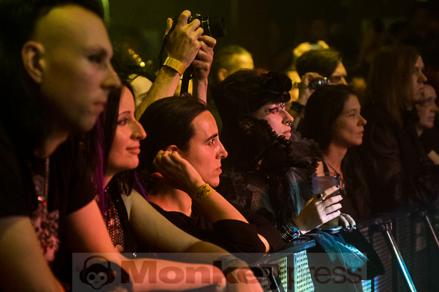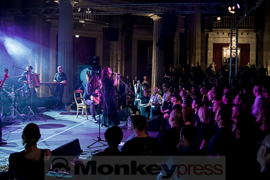 Die Kuppelhalle des Volkspalasts war gut gefüllt, als gegen 22:45 Uhr das Intro von Ordo Rosarius Equilibrio zum letzten Konzert des Abends einsetzte. Dass die NeoFolk-Band überhaupt spielen konnte war schon ein kleines Wunder, denn ihr Flug wurde am späten Vorabend gecancelled, so dass man in Stockholm übernachten musste und erst kurz vor dem geplanten Auftritt in Leipzig ankam. Neben Tomas und Rose-Marie standen noch Frederik Leijström am Bass und Nicolas van Meirhaghe, welcher zuvor bereits mit seinem Projekt Empusae auftrat, an den Drums auf der Bühne. Ein Live-Gitarrist fehlte diesmal.Die Schweden stehen für ruhige und gefühlvolle Töne und intime Texte und die Zuschauer genossen genau diese Kombination. Tomas’ Beschwerde, dass es nur Wasser auf der Bühne gäbe wurde von Frederik erhört, der im Backstage etwas „Standesgemäßeres“ organisierte: Ballantines! Und dieser wurde natürlich dann brüderlich geteilt. Kurz vor Ende des Konzerts begrüßte Tomas mit den Worten „Here comes the Italian stallion!“ Simone Salvatori von Spiritual Front als Gast auf der Bühne. Rose-Marie trat zurück in die zweite Reihe und Simone ebenfalls an die Drums. Gemeinsam brachten sie A Song 4 Hate and Devotion – etwas, das sie vor fünf Jahren bereits schon mal gemacht hatten. Aber das passt, dieser Song ist doch ein echter Klassiker! Es folgte, von viel Drumarbeit begleitet, The Perplexity Of Hybrids, bevor sich Simone wieder verabschiedete. Sein Auftritt war definitiv ein Höhepunkt des Konzerts. Kurz darauf war dann leider auch schon Schluss und unter rauschendem Beifall verließ die Band rund 20 Minuten nach Mitternacht die Bühne – ein tolles Konzert! (DG)