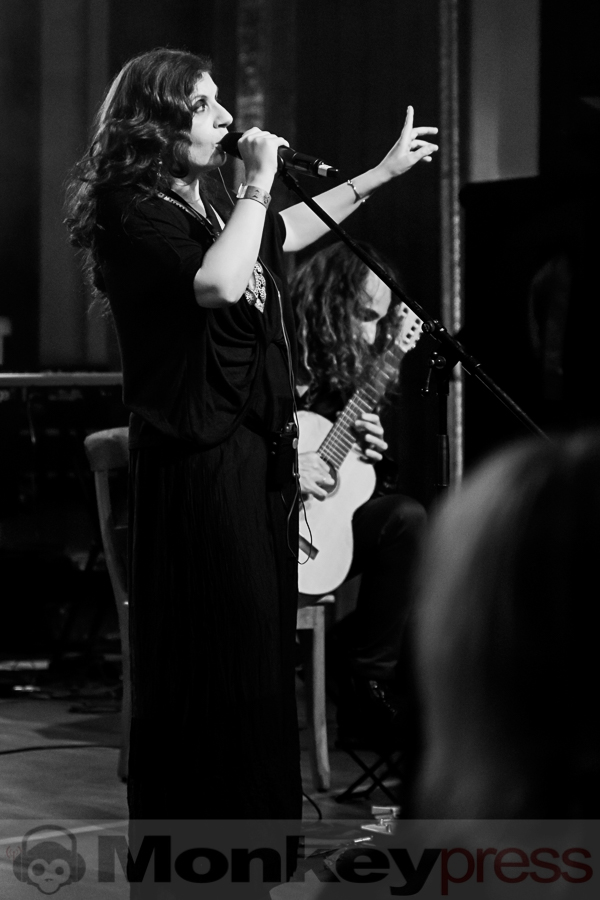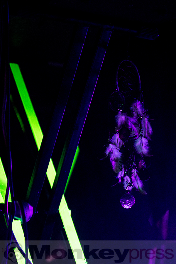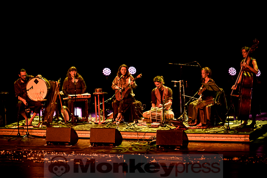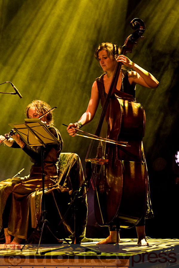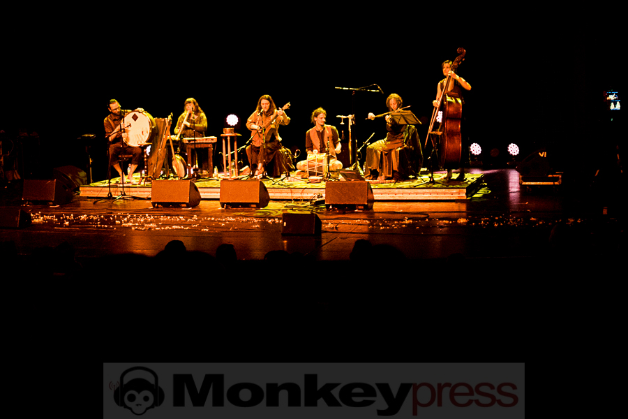 Die Bühne ist in tief-goldenes Licht getaucht als B’ee (Bobin Eirth) an diesem Freitagabend vor sein erwartungsvolles und andächtig schweigendes Publikum tritt. Kurz vorher haben noch zwei in lange wallende Gewänder gekleidete Darsteller (die man vorher noch am Merch-Stand bewundern konnte) Blütenblätter verstreut, als ob sie den Boden für das eintretende Künstlerkollektiv weihen möchten. Das sechsköpfige Kammerensemble nimmt bald darauf (selbstverständlich barfuß und entrückt lächelnd) hinter ihren zahlreichen Instrumenten auf Kissen und blumen-umrankten Rattan-Stühlen Platz. Die Szenerie erinnert eher an ein Sit-in, als ein Folk-Konzert. Der Amerikaner, der seit einiger Zeit in Leipzig lebt, hat neben einer Laute, einer Zither und seiner Akustikgitarre jede Menge neuen Liedguts und viele amüsante Anekdoten aus der Neo-Folk Szene – in den meisten scheinen eine Menge bewusstseinserweiternde Drogen eine Rolle zu spielen – im Gepäck. Und so nimmt es nicht Wunder, dass jade-farbige Weiden mit Namen Julia aus dem nahegelegenen Taucha (ca. 15 km nordöstlich von Leipzig) zum Protagonisten seiner musikalischen Traumtänzerei werden. In Gowan Ring sehen sich in der Tradition reisender mittelalterlicher Troubadoure und bezeichnen ihre Musik als „Symbolic Folk Music“. B’ee spielt an diesem Abend hauptsächlich Stücke seiner beiden aktuellsten Veröffentlichungen Vision Of Shadows That Shine und The Serpent And The Dove. Das Schauspielhaus ist nahezu bis auf den letzten Sitzplatz besetzt, die Fans wirken sehr konzentriert und machen einen seltsam erleuchteten Eindruck. Uns fällt es schwer zwischen all dem Blütenstaub, den tiefroten überreifen Beeren und dem honig-süßen Cider zu einem abschließenden Fazit zu kommen. (KS)
