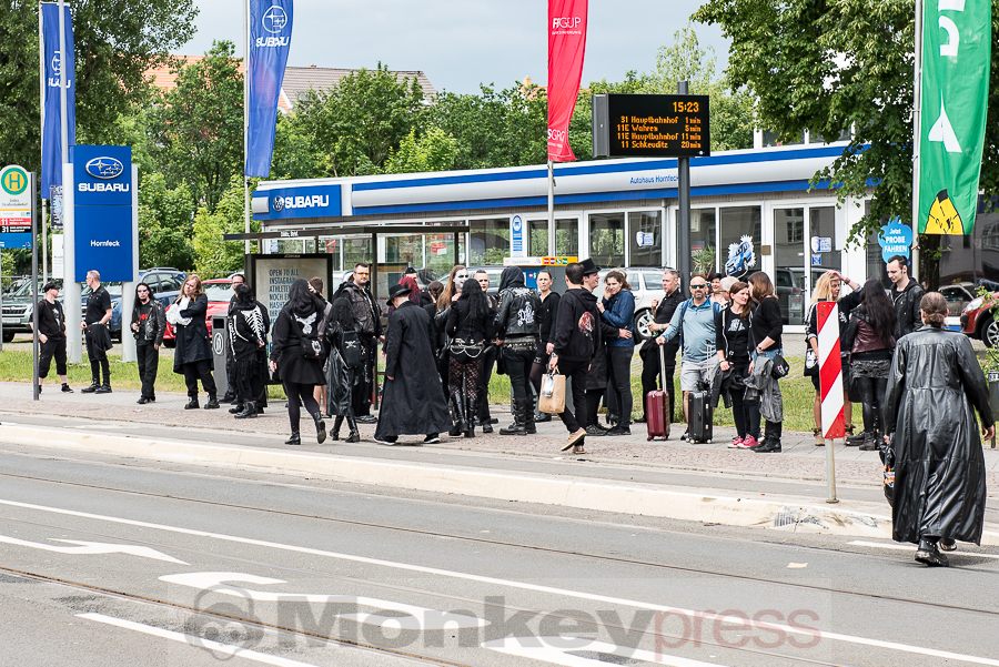 Pünktlich um 20:40 Uhr wird es besonders dunkel: Die finnischen Dark-Rock Band beehrt das Wave-Gotik-Treffen mal wieder mit ihrer Anwesenheit. Die 1990 in Helsinki gegründete Band ist schon fast ein Fossil innerhalb Szene und lockt damit zahlreiche Fans inacn den agra-Halle. Vor der Bühne bildet sich ein auf The 69 Eyes neugieriger Pulk. Auf ihrer aktuellen Tour promoten Jyrki69 und seine Bandkollegen ihr aktuelles 2016 erschienenes Album Universal Monsters. Natürlich darf bei ihren Konzerten aber auch das Gothic Girl nicht fehlen. Es kommt, aber spät! Die Frisuren sitzen, schwarze Lederjacken und die obligatorischen Sonnenbrillen – The 69 Eyes machen optisch schon was her. Und musikalisch scheinen sie auch den Nerv der Leipziger zu treffen. Vor der Bühne wird gefeiert und getanzt. Ein schöner Abend für alle Düsterrock-Fans! Im Anschluss wird als Headliner The Mission erwartet. Wir sind gespannt! (AZ)